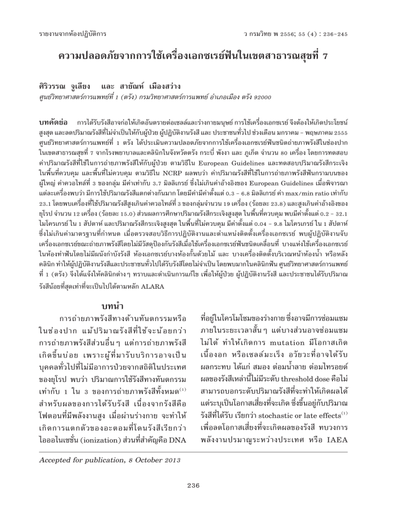 รายงานจากห้องปฏิบัติการ ว กรมวิทย พ 2556; 55 (4) : 236-245 ความปลอดภัยจากการใช้เครื่องเอกซเรย์ฟันในเขตสาธารณสุขที่ 7 ศิริวรรณ จูเลียง และ สายัณห์ เมืองสว่าง ศูนย์วิทยาศาสตร์การแพทย์ที่ 1 (ตรัง) กรมวิทยาศาสตร์การแพทย์ อ�ำเภอเมือง ตรัง 92000 บทคัดย่อ การได้รบั รังสีอาจก่อให้เกิดอันตรายต่อเซลล์และร่างกายมนุษย์ การใช้เครือ่ งเอกซเรย์ จึงต้องให้เกิดประโยชน์ สูงสุด และลดปริมาณรังสีทไี่ ม่จำ� เป็นให้กบั ผูป้ ว่ ย ผูป้ ฏิบตั งิ านรังสี และ ประชาชนทัว่ ไป ช่วงเดือน มกราคม - พฤษภาคม 2555 ศูนย์วิทยาศาสตร์การแพทย์ที่ 1 ตรัง ได้ประเมินความปลอดภัยจากการใช้เครื่องเอกซเรย์ฟันชนิดถ่ายภาพรังสีในช่องปาก ในเขตสาธารณสุขที่ 7 จากโรงพยาบาลและคลินิกในจังหวัดตรัง กระบี่ พังงา และ ภูเก็ต จ�ำนวน 80 เครื่อง โดยการทดสอบ ค่าปริมาณรังสีที่ใช้ในการถ่ายภาพรังสีให้กับผู้ป่วย ตามวิธีใน European Guidelines และทดสอบปริมาณรังสีกระเจิง ในพื้นที่ควบคุม และพื้นที่ไม่ควบคุม ตามวิธีใน NCRP ผลพบว่า ค่าปริมาณรังสีที่ใช้ในการถ่ายภาพรังสีฟันกรามบนของ ผู้ใหญ่ ค่าควอไทล์ที่ 3 ของกลุ่ม มีค่าเท่ากับ 3.7 มิลลิเกรย์ ซึ่งไม่เกินค่าอ้างอิงของ European Guidelines เมื่อพิจารณา แต่ละเครื่องพบว่า มีการใช้ปริมาณรังสีแตกต่างกันมาก โดยมีค่ามีค่าตั้งแต่ 0.3 - 6.8 มิลลิเกรย์ ค่า max/min ratio เท่ากับ 23.1 โดยพบเครือ่ งทีใ่ ช้ปริมาณรังสีสงู เกินค่าควอไทล์ที่ 3 ของกลุม่ จ�ำนวน 19 เครือ่ ง (ร้อยละ 23.8) และสูงเกินค่าอ้างอิงของ ยุโรป จ�ำนวน 12 เครือ่ ง (ร้อยละ 15.0) ส่วนผลการศึกษาปริมาณรังสีกระเจิงสูงสุด ในพืน้ ทีค่ วบคุม พบมีคา่ ตัง้ แต่ 0.2 - 32.1 ไมโครเกรย์ ใน 1 สัปดาห์ และปริมาณรังสีกระเจิงสูงสุด ในพื้นที่ไม่ควบคุม มีค่าตั้งแต่ 0.04 - 9.8 ไมโครเกรย์ ใน 1 สัปดาห์ ซึ่งไม่เกินค่ามาตรฐานที่ก�ำหนด เมื่อตรวจสอบวิธีการปฏิบัติงานและต�ำแหน่งติดตั้งเครื่องเอกซเรย์ พบผู้ปฏิบัติงานจับ เครื่องเอกซเรย์ขณะถ่ายภาพรังสีโดยไม่มีวัสดุป้องกันรังสีเมื่อใช้เครื่องเอกซเรย์ฟันชนิดเคลื่อนที่ บางแห่งใช้เครื่องเอกซเรย์ ในห้องท�ำฟันโดยไม่มีผนังก�ำบังรังสี ห้องเอกซเรย์บางห้องกั้นด้วยไม้ และ บางเครื่องติดตั้งบริเวณหน้าห้องน�้ำ หรือหลัง คลินกิ ท�ำให้ผปู้ ฏิบตั งิ านรังสีและประชาชนทัว่ ไปได้รบั รังสีโดยไม่จำ� เป็น โดยพบมากในคลินกิ ฟัน ศูนย์วทิ ยาศาสตร์การแพทย์ ที่ 1 (ตรัง) จึงได้แจ้งให้คลินิกต่างๆ ทราบและด�ำเนินการแก้ไข เพื่อให้ผู้ป่วย ผู้ปฏิบัติงานรังสี และประชาชนได้รับปริมาณ รังสีน้อยที่สุดเท่าที่จะเป็นไปได้ตามหลัก ALARA บทน�ำ ทีอ่ ยูใ่ นโครโมโซมของร่างกาย ซึง่ อาจมีการ