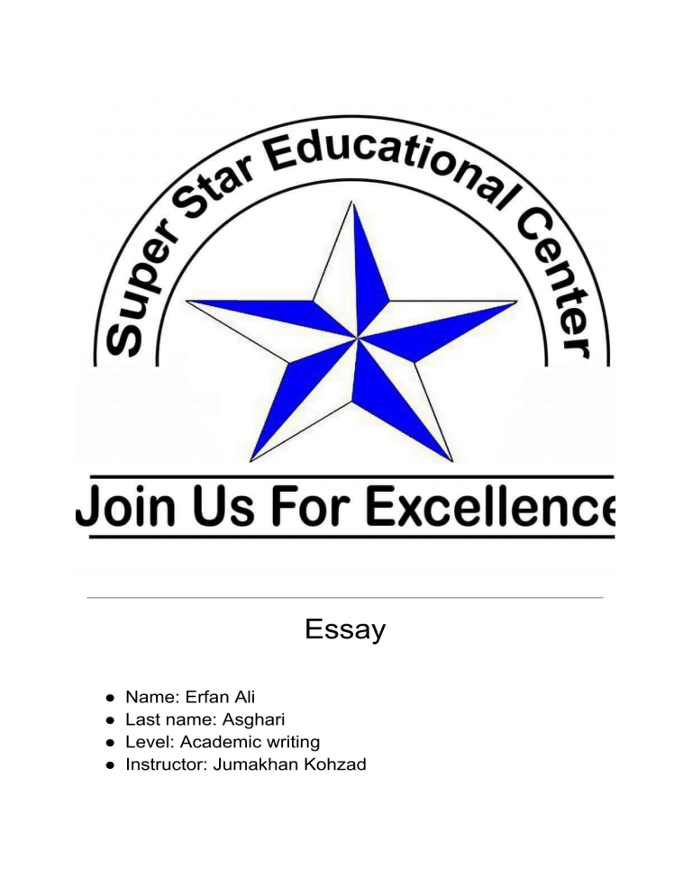 Essay ● Name: Erfan Ali ● Last name: Asghari ● Level: Academic writing ● Instructor: Jumakhan Kohzad Essay 1:Today, we are going to discuss the ways in which companies can impact society. In my opinion, the best way for a company to have a positive impact is by investing in education Education allows people to gain the knowledge and skills they need to find jobs and improve their lives. For Example,many companies offer programs to teach digital skills, helping young people to prepare for modern careers. For instance, companies like Microsoft invest heavily in education through initiatives like coding programs for youth and tech education for underserved regions. "Education builds confidence and opens doors to opportunities. This empowers individuals while also contributing to the workforce of the future. This approach also reduces inequality by giving everyone an equal chance to succeed. Investing in education helps companies improve society, reduce inequality, and drive long-term growth. In conclusion, investing in education boosts workforce skills, leading to greater productivity and innovation. Essay 2: Enhancing Public Safety: A Key to Improving Urban Quality of Life. Public safety is one of the most important ways city governments can improve the lives of residents. When people feel safe, they are more likely to enjoy their surroundings and participate in community activities. For example, installing street lights in dark areas can reduce crime and help residents feel secure when walking at night. Governments can also invest in better policing, focusing on building trust between officers and the community. This way, people feel comfortable reaching out for help when needed. Additionally, creating safety programs, such as workshops or youth activities, can keep people informed and prevent crime. For instance, programs for children after school can give them a safe place to learn and grow. Public safety not only protects people from harm but also helps create a positive environment where everyone can thrive. By focusing on these strategies, city governments can make neighbourhoods safer and improve the quality of life. Public safety includes measures like effective policing, lighting, and community initiatives, all aimed at reducing crime and improving community well-being. 1 Essay 3: Should Universities Prioritise Libraries or Sports?" Universities often struggle to decide whether they should spend more money on academic facilities like libraries or sports programs. Libraries are essential for students because they provide access to books, research materials, and quiet spaces for studying. They help students improve their knowledge and achieve better grades. On the other hand, sports programs are also important as they promote physical health and teamwork. Many students enjoy participating in sports, which can reduce stress and bring people together. However, universities should prioritise funding academic facilities because the main goal of education is learning. Libraries benefit all students, while sports mainly help those who are involved in athletic activities. Although sports have value, academic success should always come first. By focusing on libraries and study resources, universities can ensure that all students have the tools they need to succeed. In conclusion, universities should focus more on academic facilities to support students' learning, while still providing some funding for sports programs. Essay 4: What Factors Do You Think Have Contributed to the Increase in Life Expectancy? Is It Due to Advances in Medical Technology, Improvements in Public Health, Changes in Lifestyle Habits, or Something Else Entirely?" Life expectancy has increased due to several factors. One key reason is advances in medical technology, which have made it easier to treat diseases and manage chronic conditions. Medical breakthroughs, such as vaccines and improved surgical methods, have saved countless lives. Public health improvements have also played a significant role, such as better sanitation, clean water, and health education, which help prevent many diseases. Additionally, changes in lifestyle habits have contributed to longer lives, including healthier diets, more physical activity, and smoking reduction. People today are more aware of how their habits affect their health. Finally, economic development and improved access to healthcare have allowed more people to receive proper treatment. These combined factors have led to longer, healthier lives for many people around the world. 2 In conclusion, life expectancy has increased due to medical advancements, better public health, and healthier lifestyles. Essay 5: Is AI a Dangerous Technology or a Powerful Tool for Society?" AI has the potential to greatly improve our lives in many ways. One of the key benefits is in healthcare, where AI can help doctors diagnose diseases more accurately and quickly. It can also assist in finding new treatments and improving patient care. In education, AI-powered tools can personalise learning, making it easier for students to learn at their own pace. AI also plays a major role in automation, making everyday tasks easier and more efficient, which can save time and reduce human error. Additionally, AI is useful in climate change efforts by helping scientists analyse data and find solutions to environmental problems. In business, AI can improve customer service, enhance decision-making, and increase productivity. Overall, with careful development, AI has the power to create a brighter future and improve various aspects of life. In conclusion, AI has the potential to improve many areas of life, from healthcare to business, by making tasks more efficient and helping solve global challenges. End of Independent Essay 3 Essay 1:The Reading and Listening were talking about problems with the oil power cars and let's go for more details. The Reading said car manufacturers and governments have been eagerly 