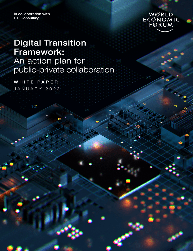 In collaboration with FTI Consulting Digital Transition Framework: An action plan for public-private collaboration WHITE PAPER JANUARY 2023 Cover: Gettyimages/Andriy Onufriyenko Inside: Gettyimages/xijian; Gettyimages/Bartlomiej Wroblewski; Gettyimages/gilaxia; Gettyimages/JuSun; Gettyimages/AsiaVision Contents 3 Foreword 4 Leadership perspective on the digital transition 5 Introduction: A guiding framework for the digital transition 7 1 Digital and sustainable transformation of industries 9 2 Universal adoption of affordable digital services 11 3 Strategic development of new technologies 13 4 Digital skills and human capital 15 5 Trust, security and protection 17 6 Cross-border trade and cooperation 20 Annex 23 Contributors Disclaimer This document is published by the World Economic Forum as a contribution to a project, insight area or interaction. The findings, interpretations and conclusions expressed herein are a result of a collaborative process facilitated and endorsed by the World Economic Forum but whose results do not necessarily represent the views of the World Economic Forum, nor the entirety of its Members, Partners or other stakeholders. © 2023 World Economic Forum. All rights reserved. No part of this publication may be reproduced or transmitted in any form or by any means, including photocopying and recording, or by any information storage and retrieval system. Digital Transition Framework: An Action Plan for Public-Private Collaboration 2 January 2023 Digital Transition Framework: An Action Plan for Public-Private Collaboration Foreword Cristiano Amon President and Chief Executive Officer, Qualcomm Inc.; Chair, ICT Industry, World Economic Forum Derek O’Halloran Head, Shaping the Future of Digital Economy and New Value Creation; Member of the Executive Committee World Economic Forum The world has entered a profound period of transition where we are seeing incredible development of new technologies transform economies and inspire future generations. Breakthroughs in connectivity, biotechnology, quantum and exascale computing, and artificial intelligence, as well as the metaverse, advancements in industrial robotics and an emerging space economy, hold extraordinary promise for human development, economic productivity and sustainability goals. This rapid pace of innovation requires a clear vision combined with substantial investments and collaboration across all sectors. Yet, in the first few years of the 2020s public-private, leaders have responded to countless economic, social, and environmental pressures – forcing many to make a trade-off between long-term technology investments or focusing on short-term needs. So, what can be done? Ultimately, digital technology is the key enabler for the broad set of challenges business and governments face. It is one of our most important toolkits for future success; for example, the capacity to reduce emissions in hard-toabate sectors by as much as 20% by 2050. Governments and businesses are increasingly working together through strategic economic planning and targeted investments. As they do so, developing a straightforward roadmap for utilizing technology is a critical component to drive success across all other goals. We are already on a path to full digitization of our societies and industries. Adapting to a digital-first marketplace is a top priority for businesses across all sectors, including health, finance, heavy industry, energy and mobility. However, we have a long way to go, especially as 2.9 billion people worldwide still do not benefit from digital participation. Collaboration, agile policies and continuous investments in connectivity, skills, devices and relevant content are needed to accelerate progress and achieve the ambitions of an inclusive digital economy. As countries navigate the impacts of the digital transition, private-public collaboration is essential. Governments play an important role in establishing clarity through strategic priorities, and creating the right environment through monetary and foreign policies and strategic economic investments. Those countries where business and government can pool their intelligence, resources and capabilities will advance the fastest. To this end, we offer this document as a simple, but holistic strategic framework to facilitate whole-of-economy dialogue and action. It represents a point of departure to facilitate cross-sector collaborative efforts to develop and align shared priorities, and to provide some actionable recommendations and examples for each area. We have two hopes for this document. First, we hope that it sparks a dialogue for collective action. Second, we hope this is a living document, which evolves as we collectively learn from leading practices. Digital Transition Framework: An Action Plan for Public-Private Collaboration 3 Leadership perspective on the digital transition Digital transformation across governments and industries has the potential to grow the economy and enable a brighter future for all. Now is a critical time for the public and private sectors to come together to embrace this opportunity through a shared vision and strategic planning. Cristiano Amon, President and Chief Executive Officer, Qualcomm Inc.; Chair, ICT Industries, World Economic Forum The digital skills gap is a key barrier to inclusion and opportunity in the digital age. Closing this gap is central to unlocking new social and economic value. José María Álvarez-Pallete, Chairman and Chief Executive Officer, Telefonica Improving broadband infrastructure enables innovation across all critical sectors. Cemented by a digitally literate population, with access to devices and pertinent content, it defines the digital transformation of our society. Paula Ingabire, Minister of Information Communication Technology and Innovation of Rwanda At Apollo Hospitals, we have been strengthening our focus towards prevention and supporting well-being, through integration of healthcare a