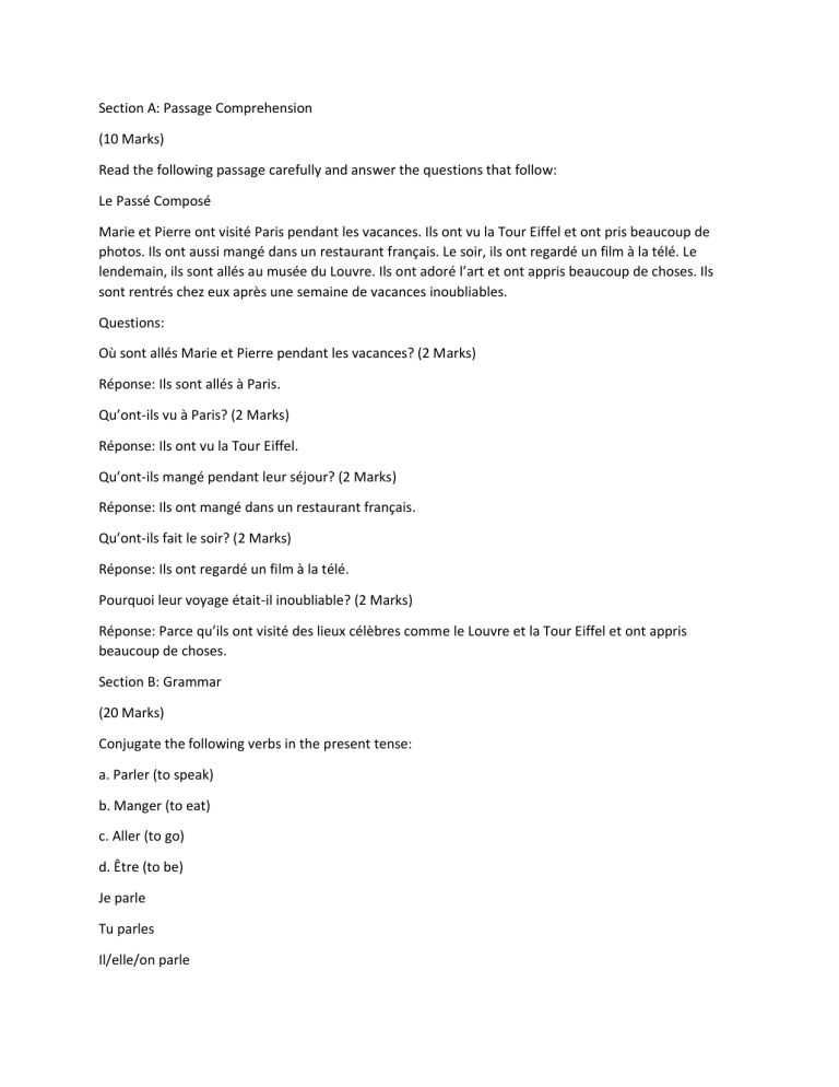 Section A: Passage Comprehension (10 Marks) Read the following passage carefully and answer the questions that follow: Le Passé Composé Marie et Pierre ont visité Paris pendant les vacances. Ils ont vu la Tour Eiffel et ont pris beaucoup de photos. Ils ont aussi mangé dans un restaurant français. Le soir, ils ont regardé un film à la télé. Le lendemain, ils sont allés au musée du Louvre. Ils ont adoré l’art et ont appris beaucoup de choses. Ils sont rentrés chez eux après une semaine de vacances inoubliables. Questions: Où sont allés Marie et Pierre pendant les vacances? (2 Marks) Réponse: Ils sont allés à Paris. Qu’ont-ils vu à Paris? (2 Marks) Réponse: Ils ont vu la Tour Eiffel. Qu’ont-ils mangé pendant leur séjour? (2 Marks) Réponse: Ils ont mangé dans un restaurant français. Qu’ont-ils fait le soir? (2 Marks) Réponse: Ils ont regardé un film à la télé. Pourquoi leur voyage était-il inoubliable? (2 Marks) Réponse: Parce qu’ils ont visité des lieux célèbres comme le Louvre et la Tour Eiffel et ont appris beaucoup de choses. Section B: Grammar (20 Marks) Conjugate the following verbs in the present tense: a. Parler (to speak) b. Manger (to eat) c. Aller (to go) d. Être (to be) Je parle Tu parles Il/elle/on parle Nous parlons Vous parlez Ils/elles parlent Je mange Tu manges Il/elle/on mange Nous mangeons Vous mangez Ils/elles mangent Je vais Tu vas Il/elle/on va Nous allons Vous allez Ils/elles vont Je suis Tu es Il/elle/on est Nous sommes Vous êtes Ils/elles sont (4 Marks) Fill in the blanks with the correct form of the verb in the passé composé: a. Nous ______ (faire) du shopping hier. b. Elle ______ (prendre) un taxi ce matin. c. Ils ______ (voir) un film le week-end dernier. Réponse: avons fait Réponse: a pris Réponse: ont vu (3 Marks) Complete the following sentences with the correct form of the adjective in parentheses: a. La voiture est ______ (nouveau). b. Mon frère est ______ (gentil). c. Ce gâteau est ______ (délicieux). Réponse: nouvelle Réponse: gentil Réponse: délicieux (3 Marks) Write five sentences using “ne…pas” correctly to form negative sentences in French. (5 Marks) Example: Je ne mange pas de chocolat. Tu ne travailles pas le dimanche. Elle ne parle pas espagnol. Nous ne comprenons pas la question. Ils ne viennent pas à la fête. Translate the following sentences into French: a. She is going to the market. b. We are studying French. c. They ate pizza last night. Réponse: Elle va au marché. Réponse: Nous étudions le français. Réponse: Ils ont mangé de la pizza hier soir. (5 Marks) Section C: Writing (30 Marks) Write a paragraph (50-60 words) introducing your family in French. (5 Marks) Example: Ma famille est petite. Il y a quatre personnes. Mon père s’appelle Pierre et il est médecin. Ma mère s’appelle Marie et elle est enseignante. J’ai un frère qui s’appelle Lucas, il a 10 ans. Nous vivons à Paris. J’aime beaucoup ma famille. Write a conversation between two friends (80-100 words) about your plans for a birthday party. (10 Marks) Example: A: Salut! Tu viens à ma fête d’anniversaire? B: Oui, bien sûr! Où est-ce que ça va être? A: Ça va être chez moi, à 17h. B: Super! Qui est invité? A: Mes amis et ma famille. Il y aura des jeux, de la musique, et un gâteau délicieux! B: Ça a l’air génial! J’ai hâte d’y être! A: Moi aussi! On va s’amuser! Write an invitation (5 lines) to your best friend for your birthday party. (5 Marks) Example: Cher€ [Nom], Je t’invite à ma fête d’anniversaire le samedi 20 mars à 16h chez moi. Il y aura de la musique, des jeux et beaucoup de nourriture. J’espère que tu viendras! À bientôt, [Ton Nom] Write a letter to a French pen friend (80-100 words) telling them about your school and daily routine. (10 Marks) Example: Bonjour [Nom], Je m’appelle [Ton Nom] et je suis élève à l’école [Nom de l’école]. J’ai cours du lundi au vendredi. Le matin, je me lève à 7h, puis je prends mon petit déjeuner et je vais à l’école. L’après-midi, après l’école, je fais mes devoirs. Le soir, je regarde un peu la télévision avant de me coucher. J’aime beaucoup mon école! À bientôt, [Ton Nom] Section D: Culture and Civilisation (20 Marks) Part 1: Multiple Choice Questions (MCQ) (10 Marks) Which of the following rivers is the longest in France? a) Seine b) Loire c) Rhône d) Garonne Réponse: b) Loire Which of the following is a famous cheese of France? a) Cheddar b) Brie c) Mozzarella d) Parmesan Réponse: b) Brie Which French region is most famous for producing wine? a) Normandy b) Bordeaux c) Brittany d) Alsace Réponse: b) Bordeaux Which monument is located in Paris and is known as a symbol of France? a) Mont Saint-Michel b) Arc de Triomphe c) Eiffel Tower d) Château de Versailles Réponse: c) Eiffel Tower Which of these is a famous French village known for its lavender fields? a) Lyon b) Nice c) Grasse d) Gordes Réponse: c) Grasse Which French region is famous for making the wine “Champagne”? a) Bordeaux b) Alsace c) Champagne d) Provence Réponse: c) Champagne Which of these rivers runs through the city of Paris? a) Seine b) Loire c) Rhône d) Garonne Réponse: a) Seine Which cheese is known as the “King of French Cheeses”? a) Camembert b) Brie c) Roquefort d) Emmental Réponse: c) Roquefort Which French village is famous for its beautiful vineyards and wine-making tradition? a) Lyon b) Bordeaux c) Dijon d) Avignon Réponse: b) Bordeaux What is the traditional French dish made of snails called? a) Croissant b) Coq au vin c) Escargots d) Ratatouille Réponse: c) Escargots Part 2: Fill in the Blanks (10 Marks) The river _______ flows through the city of Paris. Réponse: Seine The famous French cheese made from cow’s milk, known for its soft texture and white rind, is called _______. Réponse: Brie The region of _______ is known for its sparkling wine called Champagne. Réponse: Champagne The mo