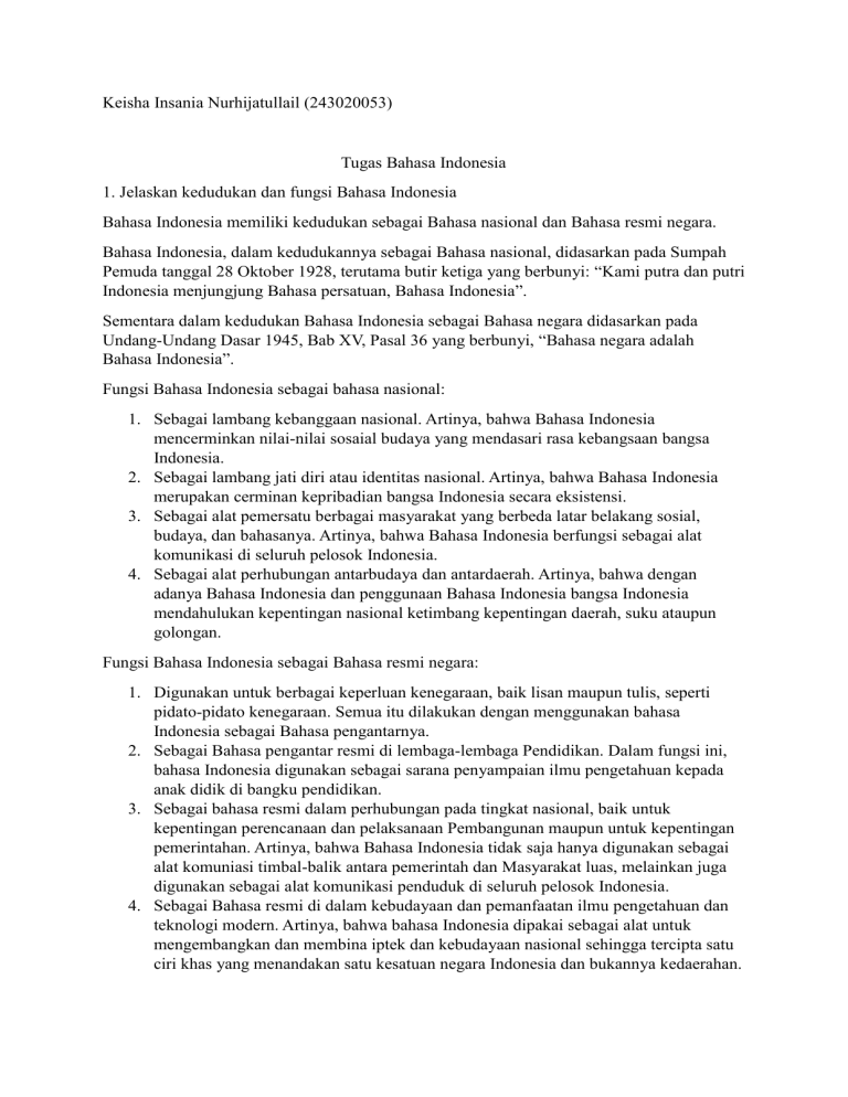 Keisha Insania Nurhijatullail (243020053) Tugas Bahasa Indonesia 1. Jelaskan kedudukan dan fungsi Bahasa Indonesia Bahasa Indonesia memiliki kedudukan sebagai Bahasa nasional dan Bahasa resmi negara. Bahasa Indonesia, dalam kedudukannya sebagai Bahasa nasional, didasarkan pada Sumpah Pemuda tanggal 28 Oktober 1928, terutama butir ketiga yang berbunyi: “Kami putra dan putri Indonesia menjungjung Bahasa persatuan, Bahasa Indonesia”. Sementara dalam kedudukan Bahasa Indonesia sebagai Bahasa negara didasarkan pada Undang-Undang Dasar 1945, Bab XV, Pasal 36 yang berbunyi, “Bahasa negara adalah Bahasa Indonesia”. Fungsi Bahasa Indonesia sebagai bahasa nasional: 1. Sebagai lambang kebanggaan nasional. Artinya, bahwa Bahasa Indonesia mencerminkan nilai-nilai sosaial budaya yang mendasari rasa kebangsaan bangsa Indonesia. 2. Sebagai lambang jati diri atau identitas nasional. Artinya, bahwa Bahasa Indonesia merupakan cerminan kepribadian bangsa Indonesia secara eksistensi. 3. Sebagai alat pemersatu berbagai masyarakat yang berbeda latar belakang sosial, budaya, dan bahasanya. Artinya, bahwa Bahasa Indonesia berfungsi sebagai alat komunikasi di seluruh pelosok Indonesia. 4. Sebagai alat perhubungan antarbudaya dan antardaerah. Artinya, bahwa dengan adanya Bahasa Indonesia dan penggunaan Bahasa Indonesia bangsa Indonesia mendahulukan kepentingan nasional ketimbang kepentingan daerah, suku ataupun golongan. Fungsi Bahasa Indonesia sebagai Bahasa resmi negara: 1. Digunakan untuk berbagai keperluan kenegaraan, baik lisan maupun tulis, seperti pidato-pidato kenegaraan. Semua itu dilakukan dengan menggunakan bahasa Indonesia sebagai Bahasa pengantarnya. 2. Sebagai Bahasa pengantar resmi di lembaga-lembaga Pendidikan. Dalam fungsi ini, bahasa Indonesia digunakan sebagai sarana penyampaian ilmu pengetahuan kepada anak didik di bangku pendidikan. 3. Sebagai bahasa resmi dalam perhubungan pada tingkat nasional, baik untuk kepentingan perencanaan dan pelaksanaan Pembangunan maupun untuk kepentingan pemerintahan. Artinya, bahwa Bahasa Indonesia tidak saja hanya digunakan sebagai alat komuniasi timbal-balik antara pemerintah dan Masyarakat luas, melainkan juga digunakan sebagai alat komunikasi penduduk di seluruh pelosok Indonesia. 4. Sebagai Bahasa resmi di dalam kebudayaan dan pemanfaatan ilmu pengetahuan dan teknologi modern. Artinya, bahwa bahasa Indonesia dipakai sebagai alat untuk mengembangkan dan membina iptek dan kebudayaan nasional sehingga tercipta satu ciri khas yang menandakan satu kesatuan negara Indonesia dan bukannya kedaerahan. 2. Berikan pendapat Anda tentang Bahasa Indonesia yang baik dan benar. Menurut saya Bahasa Indonesia yang baik dan benar adalah Ketika Bahasa Indonesia yang digunakan sesuai dengan situasi pembicaraan dan sesuai dengan kaidah yang berlaku dalam Bahasa Indonesia. Kita harus berbahasa Indonesia yang baik dan benar karena itu adalah kunci kesuksesan komunikasi. Bahasa yang tepat memastikan pesan yang ingin disampaikan dapat dipahami dengan jelas oleh penerima. 3. Jelaskan diri kalian sendiri dalam 2 (dua) paragraph Nama saya Keisha Insania Nurhijatullail, saya biasa dipanggil Kei. Saya lahir di Ciamis, 25 Maret 2005. Walaupun saya lahir di Kota Ciamis, tetapi saya tumbuh besar di Kota Bandung. Saya merupakan anak pertama dari dua bersaudara. Saya memiliki adik Perempuan yang bernama Cheryl Assyifa Nurmaulida, selisih umur kami hanya dua tahun. Saat ini saya kuliah di Universitas Pasundan dengan program studi Teknologi Pangan, alasan saya memilih jurusan ini karena jurusan ini hampir sama dengan jurusan saya sewaktu duduk di Sekolah Menengah Kejurusan dan alasan lainnya adalah karena saya suka memasak walaupun belum terlalu mahir.
