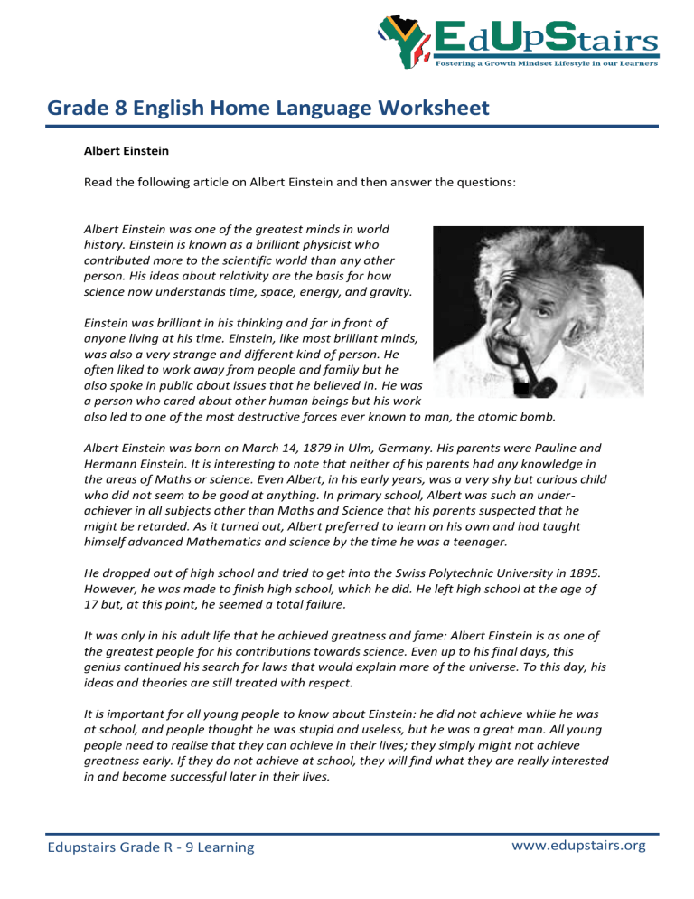 Grade 8 English Home Language Worksheet Albert Einstein Read the following article on Albert Einstein and then answer the questions: Albert Einstein was one of the greatest minds in world history. Einstein is known as a brilliant physicist who contributed more to the scientific world than any other person. His ideas about relativity are the basis for how science now understands time, space, energy, and gravity. Einstein was brilliant in his thinking and far in front of anyone living at his time. Einstein, like most brilliant minds, was also a very strange and different kind of person. He often liked to work away from people and family but he also spoke in public about issues that he believed in. He was a person who cared about other human beings but his work also led to one of the most destructive forces ever known to man, the atomic bomb. Albert Einstein was born on March 14, 1879 in Ulm, Germany. His parents were Pauline and Hermann Einstein. It is interesting to note that neither of his parents had any knowledge in the areas of Maths or science. Even Albert, in his early years, was a very shy but curious child who did not seem to be good at anything. In primary school, Albert was such an underachiever in all subjects other than Maths and Science that his parents suspected that he might be retarded. As it turned out, Albert preferred to learn on his own and had taught himself advanced Mathematics and science by the time he was a teenager. He dropped out of high school and tried to get into the Swiss Polytechnic University in 1895. However, he was made to finish high school, which he did. He left high school at the age of 17 but, at this point, he seemed a total failure. It was only in his adult life that he achieved greatness and fame: Albert Einstein is as one of the greatest people for his contributions towards science. Even up to his final days, this genius continued his search for laws that would explain more of the universe. To this day, his ideas and theories are still treated with respect. It is important for all young people to know about Einstein: he did not achieve while he was at school, and people thought he was stupid and useless, but he was a great man. All young people need to realise that they can achieve in their lives; they simply might not achieve greatness early. If they do not achieve at school, they will find what they are really interested in and become successful later in their lives. Edupstairs Grade R - 9 Learning www.edupstairs.org Grade 8 English Home Language Worksheet Questions 1. 2. 2.1 2.2 Refer to paragraph 1 What argument does the writer provide to prove that Einstein was a genius? Refer to paragraph 3 What evidence does the writer give us to prove that Einstein was strange? Why is it unexpected that Einstein should have done work that led to the development of the atomic bomb? (4) (2) (2) 3. 3.1 3.2 Refer to paragraph 4 Why did Einstein’s parents think he might be retarded? How did Einstein learn about Maths and Science? 4. 4.1 4.2 Refer to paragraph 5 What advice do you think Einstein’s parents gave him when he tried to drop out of high school? (1) Why do you think they might have done this? (2) 5. Do you think Einstein ever got tired of working? Give a reason for your answer. 6.1 6.2 For whom do you think this article was written? Give a reason for your answer. (2) Why do you think the writer wrote this article? Justify your answer carefully. (4) (1) (1) (1) [20] Edupstairs Grade R - 9 Learning www.edupstairs.org