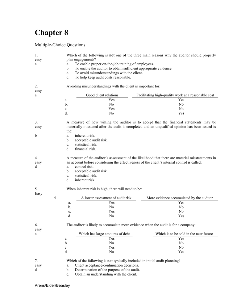 Chapter 8 Multiple-Choice Questions 1. easy a Which of the following is not one of the three main reasons why the auditor should properly plan engagements? a. To enable proper on-the-job training of employees. b. To enable the auditor to obtain sufficient appropriate evidence. c. To avoid misunderstandings with the client. d. To help keep audit costs reasonable. 2. easy a Avoiding misunderstandings with the client is important for: Good client relations Yes No Yes No a. b. c. d. 3. easy Facilitating high-quality work at a reasonable cost Yes No No Yes A measure of how willing the auditor is to accept that the financial statements may be materially misstated after the audit is completed and an unqualified opinion has been issued is the: a. inherent risk. b. acceptable audit risk. c. statistical risk. d. financial risk. b 4. easy d A measure of the auditor’s assessment of the likelihood that there are material misstatements in an account before considering the effectiveness of the client’s internal control is called: a. control risk. b. acceptable audit risk. c. statistical risk. d. inherent risk. 5. Easy When inherent risk is high, there will need to be: d a. b. c. d. 6. easy a More evidence accumulated by the auditor Yes No No Yes The auditor is likely to accumulate more evidence when the audit is for a company: a. b. c. d. 7. easy d A lower assessment of audit risk Yes No Yes No Which has large amounts of debt Yes No Yes No Which is to be sold in the near future Yes No No Yes Which of the following is not typically included in initial audit planning? a. Client acceptance/continuation decisions. b. Determination of the purpose of the audit. c. Obtain an understanding with the client. Arens/Elder/Beasley d. Perform analytical procedures as substantive tests. 8. easy b Initial audit planning involves four matters. Which of the following is not one of these? a. Develop an overall audit strategy. b. Request that bank balances be confirmed. c. Schedule engagement staff and audit specialists. d. Identify the client’s reason for the audit. 9. easy b Most auditors assess inherent risk as high for related parties and related-party transactions because: a. of the unique classification of related-party transactions required on the balance sheet. b. of the lack of independence between the parties. c. of the unique classification of related-party transactions required on the income statement. d. it is required by generally accepted accounting principles. 10. easy a Which of the following is not correct regarding the communications between successor and predecessor auditors? a. The burden of initiating the communication rests with the predecessor auditor. b. The burden of initiating the communication rests with the successor auditor. c. The predecessor auditor must receive their former client’s permission prior to divulging information to the successor auditor d. The predecessor auditor may choose to provide a limited response to a successor auditor. 11. easy a A successor auditor may perform which of the following for a new audit client? a. b. c. d. Speak to local attorneys, banks and other businesses regarding the company’s reputation Yes No Yes No Speak to the predecessor auditors about disagreements they had with management Yes No No Yes 12. medium b Which of the following is not a potential effect of an auditor’s decision that a lower acceptable audit risk is appropriate? a. More evidence is accumulated. b. Less evidence is accumulated. c. Special care is required in assigning experienced staff. d. Review of audit documentation is performed by personnel not assigned to the engagement. 13. medium a It is easier and more common to implement increased evidence accumulation for inherent risk than for acceptable audit risk because: a. inherent risk can usually be isolated to specific accounts. b. inherent risk applies to the entire audit. c. acceptable audit risk and sample sizes are set statistically. d. acceptable audit risk does not impact on the amount of evidence which must be accumulated. 14. (SOX) medium d If an auditor is requested to perform nonaudit services for a public company audit client, who is responsible for agreeing to those services with the audit firm? a. The client’s management. b. The client’s chief executive officer. c. The client’s chief financial officer. d. The client’s audit committee. Arens/Elder/Beasley 15. medium b Which of the following statements is true regarding communications between predecessor and successor auditors? a. The burden of initiating the communication rests with the predecessor. b. The predecessor’s response can be limited to stating that no information will be provided. c. The predecessor should communicate with the successor only if the client is public. d. There must be communication between the predecessor and successor if the successor is to accept the engagement. 16. medium b Investigating new clients with a focus on assessing the auditor’s potential relationship with that new client is a critical element in determining: a. inherent risk. b. acceptable audit risk. c. statistical risk. d. financial risk. 17. medium b The purpose of an engagement letter is to: a. document the CPA firm’s responsibility to external users of the audited financial statements. b. document the terms of the engagement in writing to minimize misunderstandings. c. notify the audit staff of an upcoming engagement so that personnel scheduling can be facilitated. d. emphasize management’s responsibility for approving the audit program. 18. medium a One means of informing the client that the auditor is not responsible for the discovery of all acts of fraud is the: a. engagement letter. b. representation letter. c. responsibility letter. d. client letter. 19. medium d Which of the following normally signs the engagement letter for an audit of a public company? a. Corporate treasurer. b. Chief financial officer. c. Chairman of the board of directors. d. 