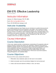 EM 676: Effective Leadership Course Syllabus Instructor Information Instructor: Dr. William Harrington, PhD, PE, MBA Email: william.harrington@louisville.edu Phone: 502-338-0665 (text message or call) Instructor Availability I am available primarily by email. Please use your University of Louisville email account and be sure to put EM 676-50 as the first characters in the subject. I aim to respond to emails within 24 hours of receipt, except on weekends and holidays. You may also text me during the hours of 7:00 a.m. to 8:00 p.m. EST on Monday through Friday, excluding holidays. If you would like to have a phone conversation, I hold virtual office hours each Friday from 4:00 p.m. to 6:00 p.m. EST. It is helpful to email or text me ahead of your call, and I can be available at other times by making an appointment. Course Information Course Description In this course, students will gain a comprehensive understanding of the leadership skills and practices required to advance the mission of an organization. Emphasis will be placed on establishing strategic direction with supporting tactics, enhancing the organization's problemsolving capabilities, fostering an environment of reliable change implementation, and communicating with impact. The following topics will be included: Mission and Vision Statements, Corporate Values, Sourcing Decisions, Performance Improvement Systems, Change Management, and Leadership Styles. Course Objectives By the end of this course, students will be able to: 1. Differentiate various leadership styles and when each is most suitable 2. Defend why leaders need to be emotionally intelligent and communicate well 3. Create a well-structured statement of Mission, Vision, and Values 4. Identify various considerations when managing change 5. Describe the Hoshin Kanri process to managing change 6. Discuss key attributes of a successful performance improvement system 7. Determine factors to consider when making decisions, especially sourcing decisions 8. Describe reasons for acquisitions and potential challenges, especially with culture Prerequisites Admission to the M.Eng in Engineering Management degree program or permission of the instructor. Required Texts Title: Principles of Management Author: Undisclosed by publisher (University of Minnesota) ISBN: 978-1-946135-18-6 We will review selected chapters from the text above, which is available without fee at the University of Minnesota Libraries website. It is also available in the Get Started section of the Blackboard course. This work, unless otherwise expressly stated, is licensed under a Creative Commons Attribution-NonCommercial-ShareAlike 4.0 International License. There are also number of journal papers and other materials to read each week. These materials are all posted on Blackboard in the Course Content/Schedule section. Other Required Materials Given that this is an online course, students will need to regular access to an internetconnected device. Some course assignments may require the use of Microsoft Office products (Word, PowerPoint, Excel). Course Grading Your course grade will be distributed equally along the following categories: 1. Discussion Board Participation (30%): Since this is an online course, participation will be largely exhibited through discussion board postings. Each week, a topical question will be posed, and students are expected to answer it using a 100 to 300word response that demonstrates comprehension of the material covered. Each student also needs to respond to at least two other students’ postings with 100 to 300-word responses. 2. Lectures (5%): Each module contains an interactive lecture discussing key topics. Students are expected to complete each lecture to supplement the module readings. 3. Assignments (35%): Assignments will focus largely on comprehension of subject matter covered for each week and will be short answer. Students are encouraged to collaborate with each other on assignments. 4. Final Project (30%): The final project instructions will be posted on Blackboard. Students are encouraged to form into groups of 2-3 students and develop their project work throughout the term. If a student has a question that the group is unable / unwilling to adequately address, then please contact the instructor for guidance. Course grades will be assigned using the following scale. The instructor has the discretion to apply +/- grading. Percentage Range Letter Grade 90-100% 80-89.9% 70-79.9% 60-69.9% <60% A B C D F Grading Criteria Work in this course will be graded based on the following criteria to receive full credit. Points will be deducted to the extent that these criteria are not met. Technical Accuracy: Statements must be accurate. Proper Interpretation: Discussion on the meaning of concepts or other materials presented in the course must demonstrate proper comprehension. Relevant Substance: Work must only include content that supports the answer provided. Brevity of Discussion: Discussion must be direct and stated in as few words as possible to reasonably convey the meaning intended. Proper Grammar: All writing in assignments and discussion board postings shall be grammatically correct and professional. Any abbreviation is to be clarified in parentheses at first use. Do not use abbreviations common in texting (e.g., LOL). Timely Submission: All work is due on the assigned date by midnight EST (i.e., 11:59 p.m. EST is the latest submission time allowed). Late work will not be accepted after solutions have been posted to Blackboard. Students are responsible to contact the instructor if a circumstance prevents them from submitting the assignment ahead of the submission deadline. The instructor has the discretion to accept or deny any request for late submission and a penalty may be assessed for a late submission. Course Schedule Module Reading(s) Course Objective(s) Assignment(s) Module 1 Ch. 10, 12 Handout Ch. 4 Handout Ch. 6-7 Handout Ch. 13, 15 Handouts Ch. 11 Handout Ch. 8 