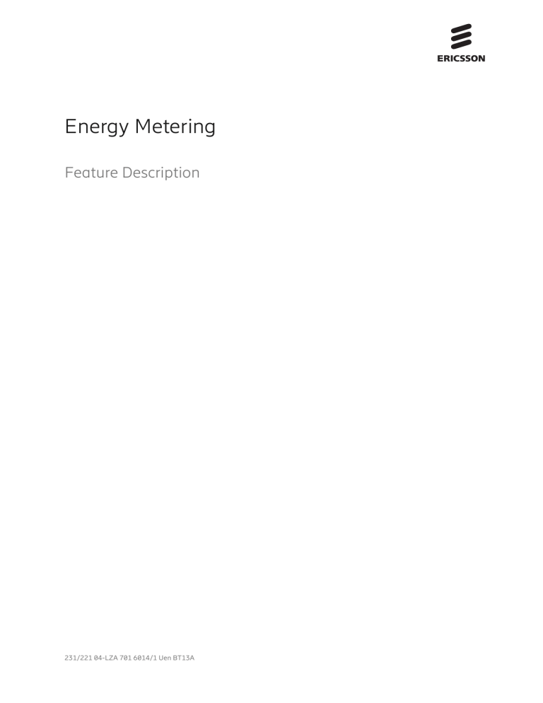 Energy Metering Feature Description 231/221 04-LZA 701 6014/1 Uen BT13A Copyright © Ericsson AB 2016-2020. All rights reserved. No part of this document may be reproduced in any form without the written permission of the copyright owner. Disclaimer The contents of this document are subject to revision without notice due to continued progress in methodology, design and manufacturing. Ericsson shall have no liability for any error or damage of any kind resulting from the use of this document. Trademark List All trademarks mentioned herein are the property of their respective owners. These are shown in the document Trademark Information. 231/221 04-LZA 701 6014/1 Uen BT13A | 2020-11-06 Contents Contents 1 Energy Metering Overview 1 2 Dependencies of Energy Metering 2 3 Feature Operation of Energy Metering 4 3.1 Overview of Energy Consumption Measurement Aggregation 5 3.2 PM Counters under EnergyMeasurement MO 6 3.3 PM Counters under EnergyMeter MO 7 3.4 9 3.5 PM Counters under ConsumedEnergyMeasurement and ConsumedEnergy MOs Ericsson Energy Report 9 4 Network Impact of Energy Metering 11 5 Parameters for Energy Metering 12 6 Performance of Energy Metering 14 7 Activate Basic Feature 15 Appendix A: Feature Change History 16 Appendix A.a: 17.Q3: Extended SW Support for PDU 03 01 16 Appendix A.b: 18.Q1: Power and Energy Consumption Reporting Per Radio Unit 18 Appendix A.c: 18.Q3: Power and Energy Consumption Reporting for the Sum of All Consumer Units in a Node 19 231/221 04-LZA 701 6014/1 Uen BT13A | 2020-11-06 Energy Metering 231/221 04-LZA 701 6014/1 Uen BT13A | 2020-11-06 1 Energy Metering Overview The purpose of the Energy Metering feature is to provide a standardized way to observe power consumption and energy consumption on a node or parts of a node. Access Type: Feature Identity: Value Package Name: NR FAJ 121 3079 NR Base Package LTE WCDMA FAJ 121 3079 FAJ 121 4579 LTE Base WCDMA Package Base Package GSM FAJ 121 3079 GSM RAN Base Package MI FAJ 121 3079 M-IoT RAN on LTE Base Package Value Package FAJ 801 FAJ 801 0400 FAJ 801 FAJ 801 FAJ 801 Identity: 4002 0359 0386 1000 Node Type: Baseband Baseband Baseband Baseband Baseband Radio Radio Node Radio Node Radio Radio Node Node Node DU Radio DU Radio Node Node Licensing: Basic Basic feature. Basic Basic Basic feature. No license is feature. No feature. feature. No license required. license is No license No license is required. is is required. required. required. Summary The feature enables measurements that can be used to monitor and validate energy performance. For more information on energy saving features, see Energy Performance Optimization Guidelines. The measurement results can be used by ENIQ for the Ericsson Energy Report tool. 231/221 04-LZA 701 6014/1 Uen BT13A | 2020-11-06 1 Energy Metering 2 Dependencies of Energy Metering Feature Dependencies There are no dependencies to other features. Hardware Energy metering is supported on all Baseband units. However, the power measurements reported on the Baseband 6303 and Baseband 6502 do not cover the PSU and the fan. Energy metering is not supported on DUs. All internal radios, RRUs, and AIRs support energy metering, except the following: — AIR 11, AIR 21, AIR 32 — RRUS A2, RRUS 01, RRUS 02, RRUS 11, RRUS 32, RRUS 61, mRRUS 12, mRRUS 61, RRUS 72, RRUS 82 — RUS 01, RUS 02 — RUL 01 — RUW 01, RUW 02 — RRUW 01, RRUW 02, RRUW 03 — RIR 11, RIR 12, RIR 14 — IRU 2242 Energy metering is supported on the following support system units: — PDU 03 02, PDU 03 01 — PSU AC 03 — EMU Energy metering is not supported on the following support system units: — BFU 01 02, BFU 01 03 — PDU 01 01, PDU 01 03, PDU 01 04, PDU 02 01, PDU 02 02 — PSU AC 01 — SAU 01 01, SAU 02 01 2 231/221 04-LZA 701 6014/1 Uen BT13A | 2020-11-06 — SCU 01 01, SCU 02 01, SCU 03 01 Limitations — The PM counters under the EnergyMeter MO for RBS 6501 show the consumption of the integrated radio unit, not the whole RBS. To see the consumption of the whole RBS 6501, legacy counters under the MO EnergyMeasurement must be used instead. — The measurement of the power consumption of the radio unit includes the power consumption of RET and TMA equipment with power supply from a radio unit. — The pmVoltage counter under the EnergyMeter MO reports only in absolute values. — Up to 150 active EnergyMeter MOs are supported on a node. From these, maximum 50 can be consumer units, including both radio units and baseband units. Network Requirements There are no network requirements for this feature. 231/221 04-LZA 701 6014/1 Uen BT13A | 2020-11-06 3 Energy Metering 3 Feature Operation of Energy Metering The Energy Metering feature provides a standardized way to observe power consumption and energy consumption of Baseband and radio units. Measurements are presented with PM counters under the following MOs: — EnergyMeter — ConsumedEnergyMeasurement for Baseband units — ConsumedEnergy for DUs — EnergyMeasurement The PM counters are activated automatically, except those that are under the EnergyMeasurement MO, where manual configuration is needed. The EnergyMeter MO is automatically created and enabled for each supported Baseband, radio unit, and installed support system unit (PSU, PDU, and EMU) of a node. It can be manually enabled or disabled with EnergyMeter.setEnergyMeterEnabled for example, if the maximum number of active EnergyMeter MOs is reached. For Baseband units, the ConsumedEnergyMeasurement MO automatically summarizes the power consumption of all active EnergyMeter MOs representing Baseband and radio units. For DUs the ConsumedEnergy MO automatically summarizes the power consumption of all active EnergyMeter MOs representing radio units. The EnergyMeasurement MO can be configured to summarize the power consumption of active EnergyMeter MOs for support system units representing PSUs, EMUs or PDUs, that is, e-fuses. For example, several EnergyMeasurment MO instances can be created to summarize th