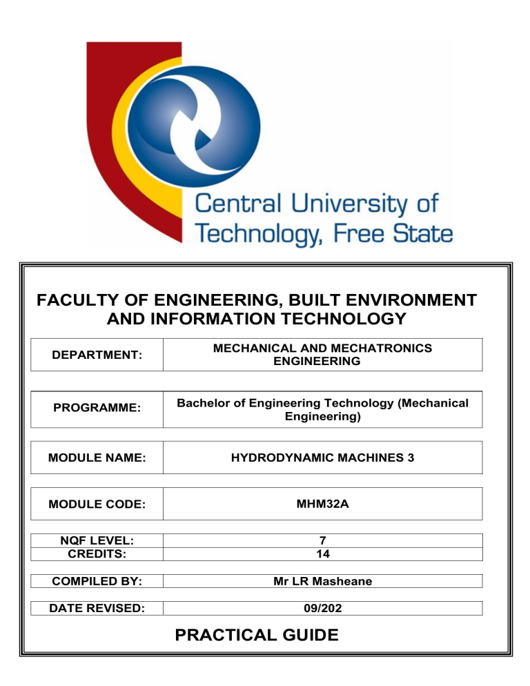 FACULTY OF ENGINEERING, BUILT ENVIRONMENT AND INFORMATION TECHNOLOGY DEPARTMENT: MECHANICAL AND MECHATRONICS ENGINEERING PROGRAMME: Bachelor of Engineering Technology (Mechanical Engineering) MODULE NAME: HYDRODYNAMIC MACHINES 3 MODULE CODE: MHM32A NQF LEVEL: CREDITS: 7 14 COMPILED BY: Mr LR Masheane DATE REVISED: 09/202 CONTENTS PRACTICAL GUIDE CONTENTS 1. Module overview ........................................................................................... 3 1.1 Purpose Statement 3 1.2 Graduate Attributes to be assessed in this Module 3 1.3 Mark allocation 3 2. Practical 1: Centrifugal Pump ...................................................................... 6 3. Practical 2: Pelton Wheel ............................................................................. 8 4. Laboratory and practicum rules:................................................................ 10 5. Safety ........................................................................................................... 11 5.1 General Safety 11 5.1.1 What to do ................................................................11 5.1.2 What not to do ..........................................................11 5.1.3 Further points to consider .........................................11 6. Practical report ............................................................................................ 12 7. Practical/Assignment Submittal and Identification Sheet ........................ 13 2 1. Module overview 1.1 Purpose Statement Practical work is an essential part of work to be studied in the subject, Fluid Science III. The student is expected to hand in a report upon completion of each practical. This report must include background theory, equipment used during the practical, procedure used during the practical, results, analysis, discussion and conclusions. The document must be in the format and at the same standard of work that you will submit to your employer. This report must be handed in one week after completion of the practical for evaluation. The total mark for all your practical’s and assignment is 35% of the course mark. An average of 50% for the practical mark must be obtained for admission to the main evaluation NB: You can be refused entrance to the laboratory if: o o 1.2 You have not prepared for the practical. You do not have a laboratory coat and laboratory notes. Graduate Attributes to be assessed in this Module No Graduate Attributes will be assessed in this module. 1.3 Mark allocation REPORT FORMAT AND STYLE WEIGHT Aim 6% Does not meet expectations 1-2 marks Aim of work unclear (Incomplete) 1-2 marks Apparatus 6% Same sketch as study guide Meets expectations Exceed expectations 3-4 marks Clear aim with adequate overview of scope of work (Copied) 3-4 marks 5-6 marks Clear aim, thoroughly defines scope of work, thorough overview (Own words) 5-6 marks Adequate sketch or image with identification of components. No captions Clear sketch with all labels and captions, required descriptions 3 0-1 marks Procedure Theory 6% 8% 5% TECHNICAL CONTENTS Tabulation of experimental results Calculations Graphs Summary and conclusions 12% 15% 20% 12% 4-6 marks Adequate steps/methodology for the experiment are provided 0 – 3marks 4-5 marks Detailed steps/methodology for the experiment are provided with additional steps, numbered 6-8 marks Fails to cover theoretical explanations (some formulas, not applicable theory) Adequately addresses theoretical explanations (some applicable theory and all formulas) 1-3 mark Demonstrates in depth research and analysis (all applicable theory and formulas) 4-5 marks Most sources are appropriately cited and a list of references in the IEEE style is adequately compiled. All sources are correctly and thoroughly cited Meets expectations Exceed expectations 5-8 marks Some experimental data (some units) provided, 6-11 marks Examples of all calculations with soe incorrect values 9-12 marks All experimental data (with units) provided 12-15 marks Examples of all calculations with correct values and answers 15-20 marks Complete set of graphs with correct xand y-axes/data expressed on logical presentations 8-12 marks Same as study guide 0 Citation and references 2-4 marks Fails to correctly cite and reference sources Does not meet expectations 1-4 marks Incomplete data set 1-5 marks Incomplete calculations 0-6 marks Incomplete graphs with wrong x-and yaxes 7-14 marks Complete set of graphs with some wrong x-and yaxes/data 0 – 3 marks 4-7 marks Fails to provide an adequate summary of the practical. Fails to provide conclusions regarding the experiment An adequate summary of the practical is presented. Conclusions regarding the experiment are A proper and complete summary of the practical is provided. Well thought through conclusions regarding the experiment are provided. 4 adequately discussed. Structure and neatness of report 10% 0 – 4 marks 5 -7 marks 8 – 10 marks Document is formatted poorly, paragraphs are poorly organized, sentences are poorly written with incorrect grammar, punctuation, spelling. Accuracy of experiment report and calculations not to standard Document format is generally consistent, paragraphs are usually well organized, sentences are generally well written with a few incorrect grammar, punctuation, spelling. Accuracy of experiment report and calculations up to standard Document format is professional, paragraphs are well organized, and sentences are well written with no errors in grammar, punctuation, and spelling. Accuracy of experiment report and calculations exceptional 5 2. Practical 1: Centrifugal Pump 1. AIM: To investigate the operating characteristics (pressure head, input power, power delivered and efficiency) against the discharge of the pump. 2. APPARATUS: Gilkes CH-75 Centrifugal pump Spring Mercury Delivery valve 3. THEORY: Suction pressure = p1 Delivery pressure = p2 Flow rate = Q Total pressure head across pump = Ht = (p2 – p1)/w w = specific weight