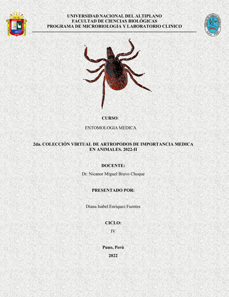 UNIVERSIDAD NACIONAL DEL ALTIPLANO FACULTAD DE CIENCIAS BIOLÓGICAS PROGRAMA DE MICROBIOLOGIA Y LABORATORIO CLINICO -------------------------------------------------------------------------------------------------------------- CURSO: ENTOMOLOGIA MEDICA 2da. COLECCIÓN VIRTUAL DE ARTROPODOS DE IMPORTANCIA MEDICA EN ANIMALES. 2022-II DOCENTE: Dr. Nicanor Miguel Bravo Choque PRESENTADO POR: Diana Isabel Enriquez Fuentes CICLO: IV Puno, Perú 2022 COLECCIÓN VIRTUAL DE INSECTOS DE IMPORTANCIA MEDICA EN ANIMALES. 2022-II I. INTRODUCCIÓN Las colecciones de especímenes son muy importantes porque nos dan una ventana para eventualmente vincular colecciones biológicas en todo el mundo a través de una red de bases de datos de búsqueda, haciendo que los datos de especies estén disponibles en escalas exponenciales para las posteriores investigaciones. Para así conocer e identificar de una forma rápida los principales endoparásitos y ectoparásitos que afectan a los animales. En el mundo, muchos de los artrópodos están asociados a los animales, ellos se constituyen como reservorios de muchos de los agentes patógenos, además de causar graves pérdidas económicas a los ganaderos. Daremos a conocer los principales grupos de artrópodos que por muchos años han causado serios problemas sobre la humanidad y los animales. II. OBJETIVOS - Identificar los principales endoparásitos y ectoparásitos que afectan a los animales. Orden: Acarina Familia: Ixodidae Género: Boophilus Especie: Boophilus microplus Nombre común: Garrapata del ganado bovino Tipo de daño: Babesiosis bovina Fotografía 1. Boophilus microplus Orden: Acarina Familia: Argasidae Género: Otobius Especie: Otobius megnini Nombre común: Garrapata espinosa de las orejas Tipo de daño: Produce daños en la salud y producción animal. Fotografía 2. Otobius megnini Orden: Acarina Familia: Psoroptidae Género: Chorioptes Especie: Chorioptes bovis Nombre común: Acaro de la sarna Psoroptica Tipo de daño: Causa sarna leve Fotografía 3. Chorioptes bovis Orden: Acarina Familia: Psoroptidae Género: Psoroptes Especie: Psoroptes ovis Nombre común: Acaro de la sarna Psoroptica profunda Tipo de daño: Sarna severa en los bovinos, a nivel del cuello y alrededor de la base de la cola. Fotografía 4. Psoroptes ovis Orden: Acarina Familia: Psoroptidae Género: Sarcoptes Especie: Sarcoptes scabiei var. bovis Nombre común: Acaro de la sarna superficial Tipo de daño: Caída masiva del pelo, prurito y exantema. Fotografía 5. Sarcoptes scabiei Orden: Acarina Familia: Psoroptidae Género: Demodex Especie: Demodex bovis Nombre común: Acaro bovino folicular Tipo de daño: Causa daños en los cueros, sobre todo en vacas jóvenes. Fotografía 6. Demodex bovis Orden: Díptera Familia: Cuterebridae Género: Dermatobia Especie: Dermatobia hominis Nombre común: Torsalo o mosca americana Tipo de daño: Parásito del ganado y los ciervos, causando infección. Fotografía 7. Dermatobia hominis Orden: Díptera Familia: Calliphoridae Género: Cochliomyia Especie: Cochliomyia hominivorax Nombre común: Gusano barrenador secundario Tipo de daño: Causa escasa productividad de carnes y de leche, así como la pérdida de calidad del cuero. Fotografía 8. C. hominivorax Orden: Anoplura Familia: Haematopinidae Género: Haematopinus Especie: Haematopinus eurysternus Nombre común: Piojo de los vacunos Tipo de daño: Pérdida de sangre e irritación que puede causar reducción en la ganancia de peso, posiblemente vitalidad reducida y disminución en la resistencia a las enfermedades. Fotografía 9. H. eurysternus Orden: Mallophaga Familia: Trichodectidae Género: Damalinia Especie: Damalinia bovis Nombre común: Piojo masticador Tipo de daño: Causan daño en la productividad de carne y leche Fotografía 10. Damalinia bovis Orden: Anoplura Familia: Haematopinidae Género: Selenopotes Especie: Selenopotes capillatus Nombre común: Piojo capilar del vacuno Tipo de daño: Taladrar la epidermis del hospedador y succiona la sangre y líquidos. Fotografía 11. S. capillatus Orden: Anoplura Familia: Haematopinidae Género: Haematopinus Especie: Haematopinus suis Nombre común: Piojo del cerdo Tipo de daño: Causa anemia y es la principal vía de transmisión para la viruela porcina. Fotografía 12. H. suis Orden: Anoplura Familia: Haematopinidae Género: Haematopinus Especie: Haematopinus asini Nombre común: Piojo del caballo Tipo de daño: Malestar general, provocan picores, daños en la piel y pérdida de pelo Fotografía 13. Haematopinus asini Orden: Anoplura Familia: Linognatidae Género: Linognathus Especie: Linognathus vituli Nombre común: Piojo de trompa larga del ganado bovino. Tipo de daño: Malestar general, provocan picores, daños en la piel y pérdida de pelo Fotografía 14. Linognathus vituli Orden: Díptera Familia: Tabanidae Género: Tabanus Especie: Tabanus lineola Nombre común: Tábano rayado Tipo de daño: Transmisión de Anaplasma marginale, causante de la enfermedad de la anasplasmosis bovina. Fotografía 15. Tabanus lineola Orden: Díptera Familia: Muscidae Género: Dermatobia Especie: Haematobia irritans Nombre común: Mosca de paletilla Tipo de daño: Reducción de la ganancia de peso, pérdida de peso y disminución en la producción de leche. Fotografía 16. Haematobia irritans Orden: Díptera Familia: Muscidae Género: Musca Especie: Musca autumnalis Nombre común: Mosca de la cara Tipo de daño: Transmisión del organismo Moraxella bovis que causa la enfermedad conocida como “ojo rosado” y la transmisión del gusano ocular del género Thelazia. Fotografía 17. Musca autumnalis Orden: Díptera Familia: Oestridae Género: Oestrus Especie: Oestrus ovis Nombre común: Mosca de los senos frontales Tipo de daño: Causante de las enfermedades de las vías respiratorias superiores de ovejas y cabras, incluyendo sinusitis y pólipos nasales. Fotografía 18. Oestrus ovis Orden: Díptera Familia: Hippoboscidae Género: Melophagus Especie: Melopha