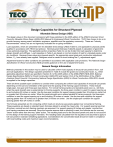 Design Capacities for Structural Plywood Allowable Stress Design (ASD) The design values in this document correspond with those published in the 2005 edition of the AF&PA American Wood Council’s Allowable Stress Deign (ASD)/LRFD Manual for Engineered Wood Construction. TECO has chosen to do so to provide harmony among users--architects, engineers, specifiers and the regulatory community. These are “Industry Recommended” values, but are not rigorously evaluated for on-going verification. Load capacities, which are presented here for allowable stress design (ASD) (Table A), are applicable to plywood panels qualified in accordance with TECO test protocol. Nominal panel thickness (Table B) assists in calculation of geometric cross-sectional properties. The applicable section properties (Table C) can be divided into load capacity to determine design strength and stiffness. Load capacities in Table A are based on normal duration of load for untreated panels under dry conditions. Because these values are plywood-specific, the appropriate panel grade and construction adjustment factors, CG, have already been applied. Designers must be careful to avoid making the CG adjustments again. Adjustment factors for other conditions are permitted in accordance with applicable code provisions. The National Design Specification for Wood Construction (NDS) provides guidance on the use of adjustment factors. General Design Information Methods presented in this section may be used to calculate uniform load capacity of structural-use panels in floor, roof and wall applications. The design capacities presented in Table A include the grade and construction factor, CG. Other applicable adjustment factors as specified in Section 9.3 of the 2005 edition of the ANSI/AF&PA NDS-2005, National Design Specifications (NDS) for Wood Construction ASD/LRFD and Section C9.3 of the 2005 Edition of the AF&PA American Wood Councils’ Commentary National Design Specification (NDS) for Wood Construction ASD/LRFD, should be applied to the design capacities. There are three possible span conditions to consider when computing the uniform load capacities of structural-use panels depending on the size and orientation of the panel and the spacing of the framing support members. These include single-span, two-span and three-span (see below). For normal framing practice and standard panel size (i.e., 4x8 foot), when the panel strength axis is perpendicular to framing supports, the three-span condition is used for support spacing up to and including 32 inches on center. Use the two-span condition for support spacing greater than 32 inches on center but no greater than 48 inches on center. When the panel strength axis is placed parallel to framing supports, the three-span condition is used for support spacing up to and including 16 inches on center. Use the two-span condition for support spacing greater than 16 inches but no greater than 24 inches on center. Use the single-span condition for support spacing greater than 24 inches on center. The formulas presented are for computing uniform loads on structural-use panels applied over conventional framing. These equations are based on standard beam formulas altered to accept the mixed units. For support spacing less than 48 inches, nominal two-inch framing members are assumed. For support spacing 48 inches and greater, nominal fourinch framing members are assumed. Since the formulas assume that no blocking is used, the formulas are for one-way "beam" action rather than two-way "plate" action. The resulting loads are for the structural panels only and do not account for the design of the framing support members. The resulting loads calculated from the equations are assumed to apply to full size panels in standard sheathing applications. Considerations for concentrated loads should be made in compliance with local building codes and maximum span recommendations. Page 1 of 7 V1.0 – 01/2008 Table A Wood Structural Panel Design Capacities Based on Span Ratings(a) Strength Bending Fb S (lb-in/ft of width) Span Rating Axial Tension Ft A (lb/ft of width) Planar Shear Axial Compression Fc A (lb/ft of width) Stiffness and Rigidity Shear through the thickness (b,c) Fv tv (lb/in of shearresisting panel length) Bending EI (lb-in2/ft of width) Planar Shear Fs (Ib/Q) (lb/ft of width) Axial EA (lb/ft of width x 106) Rigidity through the thickness Gv tv (lb/in of panel depth) Capacities relative to strength axis (d) 0° 90° 0° 90° 0° 90° 0° / 90° 0° 90° 0° 90° 0° 90° 0° / 90° Sheathing Span® 24/0 3-ply 250 54 2,300 600 2,850 2,500 53 156 273 66,000 3,600 3.35 2.90 25,000 32/16 3-ply 370 92 2,800 1,250 3,550 3,100 62 198 347 126,500 8,100 4.15 3.60 27,000 4-ply 407 110 2,800 1,250 5,325 4,650 81 198 479 126,500 17,820 4.15 3.60 35,100 5-ply 444 166 3,640 1,625 5,325 4,650 93 215 165 126,500 25,110 4.15 3.60 40,500 3-ply 625 150 2,900 1,600 4,200 4,000 68 246 431 247,500 18,000 5.00 4.50 28,500 4-ply 688 180 2,900 1,600 6,300 6,000 88 246 595 247,500 39,600 5.00 4.50 37,050 102 267 205 247,500 55,800 5.00 4.50 42,750 40/20 750 270 3,770 2,080 6,300 6,000 4-ply 930 270 4,000 1,950 7,500 7,200 98 300 725 440,000 64,900 5.85 5.00 40,300 5-ply 1,014 405 5,200 2,535 7,500 7,200 113 325 250 440,000 91,450 5.85 5.00 46,500 4-ply 528 168 2,900 1,600 6,300 6,000 87 246 595 231,000 28,600 5.00 4.50 36,400 5-ply 576 252 3,770 2,080 6,300 6,000 101 267 205 231,000 40,300 5.00 4.50 42,000 704 258 3,350 1,950 7,500 7,200 96 300 725 330,000 57,200 5.85 5.00 39,000 5-ply 768 387 4,355 2,535 7,500 7,200 111 325 250 330,000 80,600 5.85 5.00 45,000 32 oc 5-ply 1,044 684 5,200 3,250 9,450 9,300 120 390 300 715,000 232,500 7.50 7.30 54,000 48 oc 5-ply 1,920 1,224 7,280 4,745 12,150 10,800 158 501 385 1,265,000 496,000 8.20 7.30 75,750 5-ply 48/24 Floor Span 20 oc 24 oc (a) (b) (c) (d) ® 4-ply The design values in this table correspond with those published in the 2005 edition of the AF&PA American Wood Counc