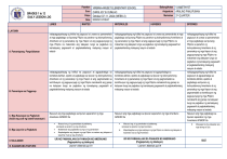 Paaralan Baitang/Antas VI-AMETHYST ARALING PANLIPUNAN Markahan 2nd QUARTER VIRBIRA-ANGSET ELEMENTARY SCHOOL Guro CHRIS JOY B. DUMLAO GRADES 1 to 12 DAILY LESSON LOG LUNES Petsa October 07-11, 2024 (WEEK 2) Oras MONDAY-FRIDAY MARTES MIYERKULES Asignatura HUWEBES BIYERNES I. LAYUNIN A. Pamantayang Pangnilalaman B. Pamantayan sa Pagganap C. Mga Kasanayan sa Pagkatuto (Isulat ang code ng bawat kasanayan) nakapagpapahayag ng kritikal na pagsusuri at unawa sa pamamahala at mga pagbabago sa lipunang Pilipino sa panahon ng kolonyalismong Amerikano at ng pananakop ng mga Hapon at ang pagpupunyagi ng mga Pilipino na makamtan ang kalayaan tungo sa pagkabuo ng kamalayang pagsasarili at pagkakakilanlang malayang nasyon at estado nakapagpapahayag ng kritikal na pagsusuri at unawa sa pamamahala at mga pagbabago sa lipunang Pilipino sa panahon ng kolonyalismong Amerikano at ng pananakop ng mga Hapon at ang pagpupunyagi ng mga Pilipino na makamtan ang kalayaan tungo sa pagkabuo ng kamalayang pagsasarili at pagkakakilanlang malayang nasyon at estado nakapagpapahayag ng kritikal na pagsusuri at agpapahalaga sa konteksto,dahilan, epekto at pagbabago sa lipunan ng kolonyalismong Amerikano at ng pananakop ng mga Hapon at ang pagmamalaki sa kontribusyon ng pagpupunyagi ng mga Pilipino namakamit ang ganap na kalayaan tungo sa pagkabuo ng kamalayang pagsasarili at pagkakakilanlang malayang nasyon at estado nakapagpapahayag ng kritikal na pagsusuri at agpapahalaga sa konteksto,dahilan, epekto at pagbabago sa lipunan ng kolonyalismong Amerikano at ng pananakop ng mga Hapon at ang pagmamalaki sa kontribusyon ng pagpupunyagi ng mga Pilipino namakamit ang ganap na kalayaan tungo sa pagkabuo ng kamalayang pagsasarili at pagkakakilanlang malayang nasyon at estado Nasusuri ang mga pagbabago sa lipunan sapanahon ng mga Amerikano AP6KDP-IIa Nasusuri ang mga pagbabago sa lipunan sapanahon ng mga Amerikano AP6KDP-IIa D. Mga Layunin sa Pagkatuto II. NILALAMAN III. KAGAMITANG PANTURO Masusuri ang uri ng pamahalaan at patakarang ipinatupad sa panahon ng mga Amerikano, Mailalarawan ang pagkakaiba ng mga uri ng pamahalaan Mapahalagahan ang hangarin ng mga Pilipino na matamo ang kalayaan at kasarinlan mula sa mga Amerikano URI NG PAMAHALAAN SA PANAHON NG AMERIKANO (Pagpapatuloy ng talakayan) Learner’s Materials pp.6-9 Masusuri ang uri ng pamahalaan at patakarang ipinatupad sa panahon ng mga Amerikano, nakapagpapahayag ng kritikal na pagsusuri at unawa sa pamamahala at mga pagbabago sa lipunang Pilipino sa panahon ng kolonyalismong Amerikano at ng pananakop ng mga Hapon at ang pagpupunyagi ng mga Pilipino na makamtan ang kalayaan tungo sa pagkabuo ng kamalayang pagsasarili at pagkakakilanlang malayang nasyon at estado nakapagpapahayag ng kritikal na pagsusuri at agpapahalaga sa konteksto,dahilan, epekto at pagbabago sa lipunan ng kolonyalismong Amerikano at ng pananakop ng mga Hapon at ang pagmamalaki sa kontribusyon ng pagpupunyagi ng mga Pilipino namakamit ang ganap na kalayaan tungo sa pagkabuo ng kamalayang pagsasarili at pagkakakilanlang malayang nasyon at estado Nasusuri ang mga pagbabago sa lipunan sapanahon ng mga Amerikano AP6KDP-IIa Masasagot ng may katapatan ang mga tanong sa Quiz Mapahalagahan ang mga sakripisyon ng mga Pilipino na matamo ang kalayaan at kasarinlan mula sa mga Amerikano URI NG PAMAHALAAN SA PANAHON NG AMERIKANO (Pagpapatuloy ng talakayan) Learner’s Materials pp.6-9 QUIZ A. Sanggunian 1. Mga Pahina sa Gabay ng Guro 2. Mga Pahina sa Gabay ng Pang-magaaral 3. Mga Pahina ng Teksbuk 4. Karagdagang Kagamitan mula sa Portal ng Learning Resource B. Iba pang Kagamitang Panturo IV. PAMAMARAAN A. Balik-aral sa nakaraang aralin at/o pagsisimula ng bagong aralin Mga pangyayri sa buh B. Paghahabi ng layunin ng aralin C. Pag-uugnay ng mga halimbawa sa bagong aralin. (Activity-1) D. Pagtalakay ng bagong konsepto at paglalahad ng bagong kasanayan #1 (Activity -2) E. Pagtalakay ng bagong konsepto at paglalahad ng bagong kasanayan #2 (Activity-3) F. Paglinang sa Kabihasnan (Tungo sa Formative Assessment) (Analysis) Balik-aral sa nakaraang aralin sa pamamagitan ng video presentation Gawain sa Pagkatuto Bilang 1: Sagutan ang mga sumusunod na katanungan. Isulat ang makabuluhang sagot sa sagutang papel. 1. Bakit nauna ang pagtatatag ng pamahalaang militar bago ang pamahalaang sibil? 2. Ano-ano ang dalawang patakarang ipinatupad ng mga Amerikano sa bansa? Ano ang pagkakaiba nila sa isa’t isa? 3. Sa panahon ng pandemya ng Covid-19, anong batas ang ipinatupad ng pamahalaan upang mapababa ang bilang ng mga pasyente na nakakapitan ng bayrus? Gawain sa Pagkatuto Bilang 2: Sumulat ng sanaysay tungkol sa hangarin ng mga Pilipino na ganap na makamit ang kalayaan ng bansa. Isulat ang sagot sa sagutang papel. G. Paglalapat ng aralin sa pang-arawaraw na buhay (Application) H. Paglalahat ng Aralin Balik-aral sa nakaraang aralin Review exercises in preparation for the quiz Gawain 4: Punan ng sagot ang patlang. Isulat ang tamang sagot sa sagutang papel. QUIZ. Isa-isahin ang hinihingi ng mga sumusunod. Isulat ang tamang sagot sa sagutang papel. 1. Ang kautusang pagbuo ng pamahalaang militar ay nagmula kay_____________________. 2. Si ____________________ ang itinalagang gobernador –sibil sa pamahalaang sibil. 3. Sa _______________ ipinagbawal ang pagwawagayway ng bandilang Pilipino sa anumang pagkakataon o saan mang lugar sa bansa. 4. ___________ taon lamang ang itinagal ng pamahalaang militar. 5. Ipinatupad ang _______________ na may layuning supilin Ang damdaming nasyonalismo ng nakararaming Pilipinong patuloy na nakikipaglaban para makamit ang ganap na kalayaan sa bansa. Ipaliwanag ang sumusuod na pahayag. "Ang kalayaan ay hindi lamang petsa sa kalendaryo; Ito ang tibok ng puso ng kaluluwa ng isang bansa, na nagpapaalala sa atin ng ating katatagan at kapangyarihan ng pagkakaisa." 1-2. Uri ng pamahalaan 3-5. Mga naging gobernadormilitar sa bansa 6-7. Dalawang patakaran na ipinatupad sa bansa 8-10. Mga batas na ipinatupad Sa patakar