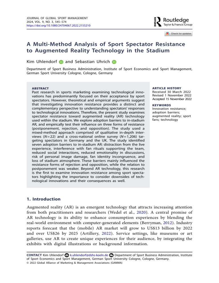 Journal of Global Sport Management 2024, VOL. 9, NO. 3, 545–574 https://doi.org/10.1080/24704067.2022.2155210 A Multi-Method Analysis of Sport Spectator Resistance to Augmented Reality Technology in the Stadium Kim Uhlendorf and Sebastian Uhrich Department of Sport Business Administration, Institute of Sport Economics and Sport Management, German Sport University Cologne, Cologne, Germany ABSTRACT Past research in sports marketing examining technological innovations has predominantly focused on their acceptance by sport spectators. However, theoretical and empirical arguments suggest that investigating innovation resistance provides a distinct and complementary perspective to understanding spectators’ responses to technological innovations. Therefore, the present study examines spectator resistance toward augmented reality (AR) technology used within the stadium. We explore adoption barriers to in-stadium AR, and empirically test their influence on three forms of resistance (postponement, rejection, and opposition). The study used a mixed-method approach comprised of qualitative in-depth interviews (N = 22) and a cross-national online survey (N = 1,206) targeting spectators in Germany and the UK. The study identified seven adoption barriers to in-stadium AR: distraction from the live experience, interference with fan rituals supporting the team, reduced social interactions, reduced emotionality in discussions, risk of personal image damage, fan identity incongruence, and loss of stadium atmosphere. These barriers mainly influenced the resistance forms of rejection and opposition, while the relation to postponement was weaker. Beyond AR technology, this research is the first to examine innovation resistance among sport spectators highlighting the importance to consider downsides of technological innovations and their consequences as well. ARTICLE HISTORY Received 30 March 2022 Revised 1 November 2022 Accepted 15 November 2022 KEYWORDS Innovation resistance; adoption barriers; augmented reality; sport fans; technology 1. Introduction Augmented reality (AR) is an emergent technology that attracts increasing attention from both practitioners and researchers (Wedel et al., 2020). A central promise of AR technology is its ability to enhance consumption experiences by blending the real-world environment with computer-generated elements (Berryman, 2012). Industry reports forecast that the (mobile) AR market will grow to US$13 billion by 2022 and over US$26 by 2025 (Artillery, 2022). Service settings, like museums or art galleries, use AR to create unique experiences for their audience, by integrating the exhibits with digital illustrations or background information. CONTACT Kim Uhlendorf k.uhlendorf@dshs-koeln.de Department of Sport Business Administration, Institute of Sport Economics and Sport Management, German Sport University Cologne, Cologne, Germany. © 2022 Global Alliance of Marketing & Management Associations (GAMMA) 546 K. UHLENDORF AND S. UHRICH AR technology is also increasingly employed in sport consumption settings (Goebert & Greenhalgh, 2020). The prospect of stadia equipped with 5G networks, which enable advanced connectivity and low latency needed for real-time applications like AR, has prompted several professional sport leagues and clubs to incorporate AR directly at the venue to enhance the in-stadium experience of spectators. In stadia, AR features are mostly integrated into existing or new applications for mobile devices, and provide spectators with a virtual extension of the stadium environment by adding digital elements (e.g. live statistics, objects, and graphics). For example, Germany’s premier football league, the Bundesliga, is currently introducing a league app that includes AR-generated real-time statistics to enhance the live game experience (DFL, 2019). Moreover, the US football team Dallas Cowboys recently utilized AR features for in-stadium activations, such as the presentation of a virtual mascot and the opportunity to take pictures with a virtual integration of the team’s players (Forbes, 2019). Given the increasing popularity of this technology in the sport industry, the question arises: how do sport spectators evaluate technological innovations such as AR? Anecdotal evidence suggests ambivalent responses. Market research indicates that spectators are generally inclined to use new technologies in the stadium to increase their enjoyment (Capgemini Research Institute, 2020). However, skepticism has also often accompanied the introduction of new technologies. For instance, market research found that the majority of spectators would refuse the opportunity to use AR applications in the stadium (Facit Digital, 2018). Spectators fear that the technology could harm the traditional stadium atmosphere, and perceive it as part of sports’ undesired commercialization (Forbes, 2020). In the past, spectator resistance even led to innovations being shut off. One example is Fox and the NHL’s innovation FoxTrax, a puck tracking system that highlights the puck, enabling better visibility of it. The innovation was heavily criticized by spectators for being distracting and inauthentic (The Wall Street Journal, 2016). To anticipate and avoid such undesired responses to technological innovations, sport properties need to have a detailed understanding of the antecedents of spectator resistance and the manifestations of this behavior. However, despite the frequent problems with introducing technological innovations, past research has largely overlooked spectator resistance and its drivers. The extant work focused on positive innovation characteristics and analyzed the drivers of adoption decisions, mainly utilizing the technology acceptance model (e.g. Kang, 2014; Kim et al., 2017). One exception is Uhrich’s (2022) work on fan experience apps. This study distinguished between reasons for and reasons against adopting innovations and showed that both factors independentl
