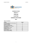 BUSINESS STRATEGIES CHAPTER 5 BUSINESS STUDIES GRADE 12 TERM ONE CHAPTER5 BUSINESS STRATEGIES 2019 TABLE OF CONTENTS TOPICS Examination guidelines for human resources Terms and definitions Definition of a strategy Steps in developing a strategy The strategic management process SWOT analysis Example of a SWOT analysis PORTERS’ FIVE Forces PESTLE analysis Types of business strategies Steps in evaluating a strategy 1 PAGES 2 2 3 3 3 3-4 4 4-5 6-7 7-9 9 BUSINESS STRATEGIES CHAPTER 5 CONTENT DETAILS FOR TEACHING, LEARNING AND ASSESSMENT PURPOSES Learners must be able to: • Define a strategy • Outline/Describe/Explain/Discuss the strategic management process. • Apply the strategic management process to solve business-related problems. • Identify business challenges from given case studies. • Identify and describe/explain/discuss the different types of business strategies. • Devise/Develop/Analyse/Formulate strategies to overcome challenges from given scenarios of businesses and make recommendations for improvement. • Explain how/when businesses can apply each type of business strategy. • Evaluate the effectiveness (positives) of each type of business strategy. • Analyse case studies and apply the following industrial analysis tools to analyse the challenges of the business environment: - SWOT analysis - Porter's Five Forces - PESTLE analysis • Recommend business strategies to address challenges identified from given case studies/scenarios. • Outline/Explain/Recommend activities/steps in strategy evaluation. Term Definition Formulation of strategies To devise/develop a strategy. Implementation of strategies This takes place after the formulation of the strategy and involves all the activities that are required for putting the strategy This takes place after the implementation of the strategy and determines whether the implemented strategy resolved the challenge. SWOT, Porter’s Five Forces and PESTLE analysis models are used to analyse the challenges posed by business environments. Evaluation of strategies Industry analysis tools Suppliers Include factories/providers of goods/services that businesses would obtain/buy from in order to operate their business. Buyers The final users of the product/services. Competitors All other businesses selling the same/similar products/services Substitute product or service Different products/services that satisfy the same needs of consumers and can be used to replace one another. New businesses that are selling the same/similar products entering the market for the first time. New Entrants 2 BUSINESS STRATEGIES CHAPTER 5 Definition of a strategy • A strategy is a long term plan of action to achieve a goal. • A strategy is a plan of action to address an opportunity or to solve a problem. • The business needs a strategy to achieve its vision and mission. Steps in developing a strategy • Application of SWOT analysis/PESTLE/Porter's Five Forces/environmental scanning of the business environments. • Formulate strategies to meet objectives/Develop measurable strategic goals/ objectives. • Implement strategies using action plans, etc. • Evaluation of strategies/Compare the expected performance with the actual performance/ Measure business performance in order to determine the reasons for deviations and analyse these reasons, etc. The strategic management process • Have a clear vision, a mission statement and measurable/realistic objectives in place. • Identify opportunities/weaknesses/strengths/threats by conducting environ-mental scanning/situational analysis. • Tools available for environmental scanning may include a SWOT analysis/Porter's Five Forces model/PESTLE analysis/industrial analysis tools. • Formulate alternative strategies to respond to the challenges. (This involves different types of business strategies) • Develop (an) action plan(s), including the tasks to be done/deadlines to be met/resources to be procured, etc. • Implement selected strategies by communicating it to all stakeholders/organising the business's resources/motivating staff. • Continuously evaluate/monitor/measure strategies in order to take corrective action. (This involves steps in evaluating a strategy) NOTE: The industrial analysis tools (SWOT, PESTLE AND PORTERS’FIVE) and business strategies form part of the strategic management process. Explanation of a SWOT ANALYSIS STRENGTHS • What advantages does your organisation have and what do you do better than anyone else? • What unique or lowest-cost resources can you draw upon that others can't? • Do you have skilled employees and a strong customer base? • Do you provide high quality product? • Do you have sufficient resources? • What is your core competency? • • • • • • • 3 WEAKNESSES High cost infrastructure High employee turnover Weak brand portfolio High debts level What are people in your market likely to see as weaknesses? What factors cause loss of sales Are your competitors doing any better than you? BUSINESS STRATEGIES CHAPTER 5 OPPORTUNITIES THREATS • Market growth for the business product. • Corporate tax may increase • New technology that will enhance • Rising pay levels. quality services and products • Intense competition. • Changing customer habits. • Increasing fuel price. • Disposable income level will increase. • Aging population. • Government’s incentives for ‘specific • Stricter laws regulating environment industry pollution • Growing number of people buying on • Currency fluctuations. line (electronic marketing) • Changing technology. • What good opportunities can you spot? NOTE: The SWOT analysis can is usually assessed in the form of a scenario as indicated below: Example of a scenario that requires learners to compile a SWOT analysis DAVE DIGITAL SOUND (DDS) DDS specialises in selling radios and car sound systems. They employ qualified sound engineers. The business does not have sufficient capital to bu