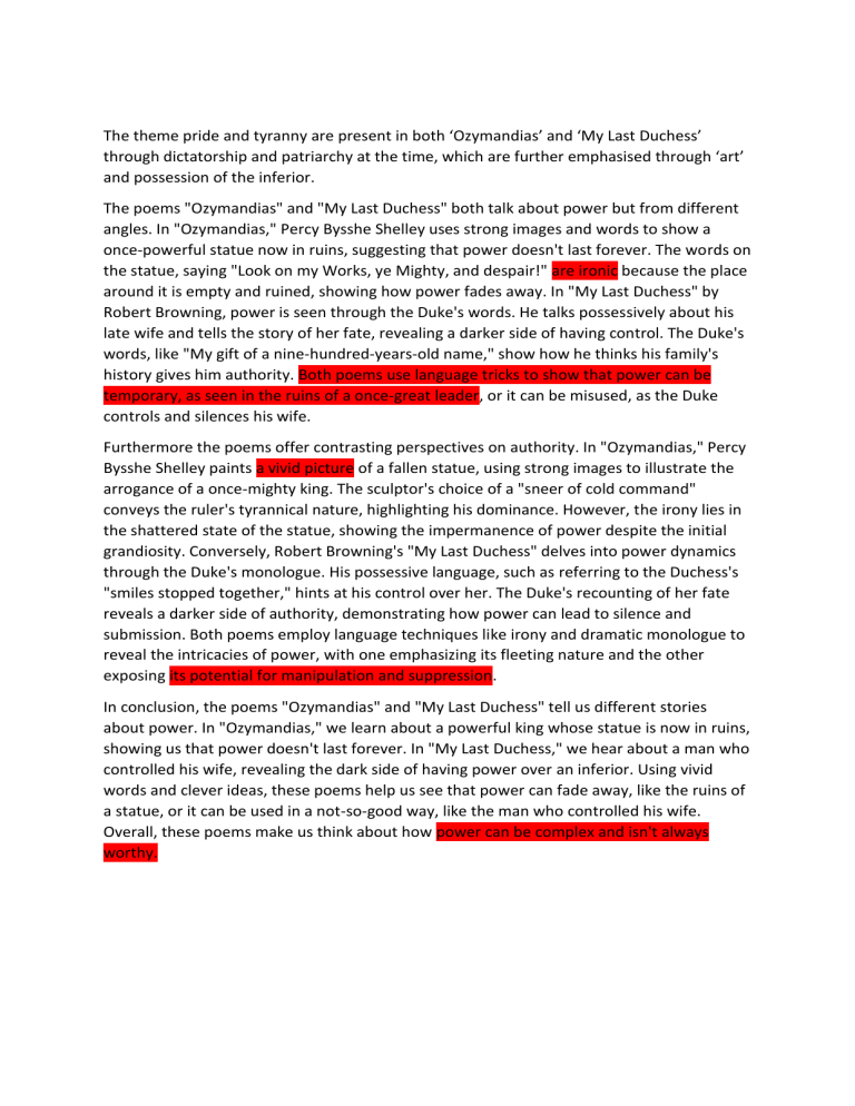 The theme pride and tyranny are present in both ‘Ozymandias’ and ‘My Last Duchess’ through dictatorship and patriarchy at the time, which are further emphasised through ‘art’ and possession of the inferior. The poems "Ozymandias" and "My Last Duchess" both talk about power but from different angles. In "Ozymandias," Percy Bysshe Shelley uses strong images and words to show a once-powerful statue now in ruins, suggesting that power doesn't last forever. The words on the statue, saying "Look on my Works, ye Mighty, and despair!" are ironic because the place around it is empty and ruined, showing how power fades away. In "My Last Duchess" by Robert Browning, power is seen through the Duke's words. He talks possessively about his late wife and tells the story of her fate, revealing a darker side of having control. The Duke's words, like "My gift of a nine-hundred-years-old name," show how he thinks his family's history gives him authority. Both poems use language tricks to show that power can be temporary, as seen in the ruins of a once-great leader, or it can be misused, as the Duke controls and silences his wife. Furthermore the poems offer contrasting perspectives on authority. In "Ozymandias," Percy Bysshe Shelley paints a vivid picture of a fallen statue, using strong images to illustrate the arrogance of a once-mighty king. The sculptor's choice of a "sneer of cold command" conveys the ruler's tyrannical nature, highlighting his dominance. However, the irony lies in the shattered state of the statue, showing the impermanence of power despite the initial grandiosity. Conversely, Robert Browning's "My Last Duchess" delves into power dynamics through the Duke's monologue. His possessive language, such as referring to the Duchess's "smiles stopped together," hints at his control over her. The Duke's recounting of her fate reveals a darker side of authority, demonstrating how power can lead to silence and submission. Both poems employ language techniques like irony and dramatic monologue to reveal the intricacies of power, with one emphasizing its fleeting nature and the other exposing its potential for manipulation and suppression. In conclusion, the poems "Ozymandias" and "My Last Duchess" tell us different stories about power. In "Ozymandias," we learn about a powerful king whose statue is now in ruins, showing us that power doesn't last forever. In "My Last Duchess," we hear about a man who controlled his wife, revealing the dark side of having power over an inferior. Using vivid words and clever ideas, these poems help us see that power can fade away, like the ruins of a statue, or it can be used in a not-so-good way, like the man who controlled his wife. Overall, these poems make us think about how power can be complex and isn't always worthy.