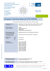 European Technical Approval ETA-10/0182 English translation prepared by DIBt - Original version in German language Befestigungsschrauben S-MD, S-MP, S-MDW, S-MDU und S-MS Fastening screws S-MD, S-MP, S-MDW, S-MDU and S-MS Handelsbezeichnung Trade name Hilti AG Feldkircherstraße 100 9494 Schaan FÜRSTENTUM LIECHTENSTEIN Zulassungsinhaber Holder of approval Zulassungsgegenstand und Verwendungszweck Befestigungsschrauben für Metallbauteile und Bleche Generic type and use of construction product Fastening screws for metal members and sheeting Geltungsdauer: Validity: vom from bis to Herstellwerke Electronic copy of the ETA by DIBt: ETA-10/0182 Manufacturing plants Diese Zulassung umfasst This Approval contains Diese Zulassung ersetzt This Approval replaces 25 April 2013 25 April 2018 Hilti AG, Werk 2855 Hilti AG, Werk 4929 Hilti AG, Werk 6103 Hilti AG, Werk 6522 Hilti AG, Werk 7855 Hilti AG, Plant 2855 Hilti AG, Plant 4929 Hilti AG, Plant 6103 Hilti AG, Plant 6522 Hilti AG, Plant 7855 76 Seiten einschließlich 65 Anhänge 76 pages including 65 annexes ETA-10/0182 mit Geltungsdauer vom 22.06.2012 bis 17.08.2015 ETA-10/0182 with validity from 22.06.2012 to 17.08.2015 Europäische Organisation für Technische Zulassungen European Organisation for Technical Approvals Z36823.13 8.06.02-327/12 Electronic copy of the ETA by DIBt: ETA-10/0182 European technical approval ETA-10/0182 English translation prepared by DIBt Page 2 of 76 | 25 April 2013 I LEGAL BASES AND GENERAL CONDITIONS 1 This European technical approval is issued by Deutsches Institut für Bautechnik in accordance with: - Council Directive 89/106/EEC of 21 December 1988 on the approximation of laws, regulations and administrative provisions of Member States relating to construction products1, modified by Council Directive 93/68/EEC2 and Regulation (EC) N° 1882/2003 of the European Parliament and of the Council3; - Gesetz über das In-Verkehr-Bringen von und den freien Warenverkehr mit Bauprodukten zur Umsetzung der Richtlinie 89/106/EWG des Rates vom 21. Dezember 1988 zur Angleichung der Rechts- und Verwaltungsvorschriften der Mitgliedstaaten über Bauprodukte und anderer Rechtsakte der Europäischen Gemeinschaften (Bauproduktengesetz - BauPG) vom 28. April 19984, as amended by Article 2 of the law of 8 November 20115; - Common Procedural Rules for Requesting, Preparing and the Granting of European technical approvals set out in the Annex to Commission Decision 94/23/EC6. 2 Deutsches Institut für Bautechnik is authorized to check whether the provisions of this European technical approval are met. Checking may take place in the manufacturing plant. Nevertheless, the responsibility for the conformity of the products to the European technical approval and for their fitness for the intended use remains with the holder of the European technical approval. 3 This European technical approval is not to be transferred to manufacturers or agents of manufacturers other than those indicated on page 1, or manufacturing plants other than those indicated on page 1 of this European technical approval. 4 This European technical approval may be withdrawn by Deutsches Institut für Bautechnik, in particular pursuant to information by the Commission according to Article 5(1) of Council Directive 89/106/EEC. 5 Reproduction of this European technical approval including transmission by electronic means shall be in full. However, partial reproduction can be made with the written consent of Deutsches Institut für Bautechnik. In this case partial reproduction has to be designated as such. Texts and drawings of advertising brochures shall not contradict or misuse the European technical approval. 6 The European technical approval is issued by the approval body in its official language. This version corresponds fully to the version circulated within EOTA. Translations into other languages have to be designated as such. 1 Official Journal of the European Communities L 40, 11 February 1989, p. 12 Official Journal of the European Communities L 220, 30 August 1993, p. 1 Official Journal of the European Union L 284, 31 October 2003, p. 25 Bundesgesetzblatt Teil I 1998, p. 812 Bundesgesetzblatt Teil I 2011, p. 2178 Official Journal of the European Communities L 17, 20 January 1994, p. 34 2 3 4 5 6 Z36823.13 8.06.02-327/12 European technical approval ETA-10/0182 English translation prepared by DIBt Page 3 of 76 | 25 April 2013 II SPECIFIC CONDITIONS OF THE EUROPEAN TECHNICAL APPROVAL 1 Definition of product and intended use 1.1 Definition of the construction product The fastening screws S S-MD, S-MP, S-MDW, S-MDU and S-MP are self drilling and self tapping screws listed in Table 1. The fastening screws are made of case hardened carbon steel or stainless steel. They are partly completed with metallic washers and EPDM sealing rings. For details see the appropriate Annexes. Screws or washers for which the stainless steel grade A2 according to EN ISO 3506-1 is given in the respective Annexes (e. g. 1.4301 or 1.4567) may be made of stainless steel grade A4 (e. g. 1.4401 or 1.4578) as well. Examples of fastening screws and the corresponding connections are shown in Annex 1. The fastening screws and the corresponding connections are subject to tension and shear forces. Table 1 Different types of the fastening screws Electronic copy of the ETA by DIBt: ETA-10/0182 Annex Z36823.13 Fastening screw Description Annex 6 S-MD 01 Z 4,2 x L with hexagon head Annex 7 S-MD 51 Z 4,2 x L with hexagon head and sealing washer ≥ Ø 16 mm Annex 8 S-MD 01 Z 4,8 x L with hexagon head Annex 9 S-MD 51 Z 4,8 x L with hexagon head and sealing washer ≥ Ø 16 mm Annex 10 S-MD 01 Z 5,5 x L with hexagon head Annex 11 S-MD 51 Z 5,5 x L with hexagon head and sealing washer ≥ Ø 16 mm Annex 12 S-MD 01 Z 6,3 x L with hexagon head Annex 13 S-MD 51 Z 6,3 x L with hexagon head and sealing washer ≥ Ø 16 mm Annex 14 S-MD 51 S 4,8 x L S-MD 61 S 4,8 x L with hexagon head and sealing washer ≥ Ø 16 mm