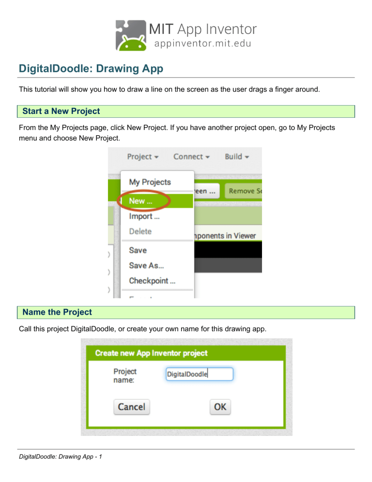 DigitalDoodle: Drawing App This tutorial will show you how to draw a line on the screen as the user drags a finger around. Start a New Project From the My Projects page, click New Project. If you have another project open, go to My Projects menu and choose New Project. Name the Project Call this project DigitalDoodle, or create your own name for this drawing app. DigitalDoodle: Drawing App - 1 Set the Screen so that it does not scroll The default setting for App Inventor is that the screen of your app will be "scrollable", which means that the user interface can go beyond the limit of the screen and the user can scroll down by swiping their finger (like scrolling on a web page). When you are using a Canvas, you have to turn off the "Scrollable" setting (UNCHECK THE BOX) so that the screen does not scroll. This will allow you to make the Canvas to fill up the whole screen. DigitalDoodle: Drawing App - 2 Add a Canvas From the Drawing and Animation drawer, drag out a Canvas component. DigitalDoodle: Drawing App - 3 Change the Height and Width of the Canvas to Fill Parent Make sure the Canvas component is selected (#1) so that its properties show up in the Properties Pane (#2). Down at the bottom, set the Height property to "Fill Parent". Do the same with the Width property. That's all for the Designer! Go over to the Blocks. Believe it or not, for now this app only needs a Canvas. Go into the Blocks Editor to program the app. DigitalDoodle: Drawing App - 4 Get a Canvas.Dragged event block In the Canvas1 drawer, pull out the when Canvas1.Dragged event. DigitalDoodle: Drawing App - 5 Get a Canvas.DrawLine call block In the Canvas1 drawer, pull out the when Canvas1.DrawLine method block.. DigitalDoodle: Drawing App - 6 Use the get and set blocks from the Dragged block to fill in the values for the Draw Line block. The Canvas Dragged event will happen over and over again very rapidly while the user drags a finger on the screen. Each time that Dragged event block is called, it will draw a small line between the previous location (prevX, prevY) of the finger to the new location (currentX, currentY). Mouse over the parameters of the Canvas1.Dragged block to pull out the get blocks that you need. (Mouse over them, don't click on them.) DigitalDoodle: Drawing App - 7 Test it out! Go to your connected device and drag your finger around the screen. Do you see a line? Great work! Now extend this app Here are some ideas for extending this app. You can probably think of many more! - Change the color of the ink (and let the user pick from a selection of colors). See Paint Pot tutorial. - Change the background to a photograph or picture. - Let the user draw dots as well as lines (hint: Use DrawCircle block). - Add a button that turns on the camera and lets the user take a picture and then doodle on it. DigitalDoodle: Drawing App - 8