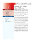 CHAPTER 7 CHAPTER CONTENTS 7.1 The Natural Response of an RL Circuit p. 214 7.2 The Natural Response of an RC Circuit p. 220 7.3 The Step Response of RL and RC Circuits p. 224 7.4 A General Solution for Step and Natural Responses p. 231 7.5 Sequential Switching p. 236 7.6 Unbounded Response p. 240 7.7 The Integrating Amplifier p. 241 CHAPTER OBJECTIVES 1 Be able to determine the natural response of both RL and RC circuits. 2 Be able to determine the step response of both RL and RC circuits. 3 Know how to analyze circuits with sequential switching. 4 Be able to analyze op amp circuits containing resistors and a single capacitor. 212 Response of First-Order RL and RC Circuits In Chapter 6, we noted that an important attribute of inductors and capacitors is their ability to store energy. We are now in a position to determine the currents and voltages that arise when energy is either released or acquired by an inductor or capacitor in response to an abrupt change in a dc voltage or current source. In this chapter, we will focus on circuits that consist only of sources, resistors, and either (but not both) inductors or capacitors. For brevity, such configurations are called RL (resistorinductor) and RC (resistor-capacitor) circuits. Our analysis of RL and RC circuits will be divided into three phases. In the first phase, we consider the currents and voltages that arise when stored energy in an inductor or capacitor is suddenly released to a resistive network. This happens when the inductor or capacitor is abruptly disconnected from its dc source. Thus we can reduce the circuit to one of the two equivalent forms shown in Fig. 7.1 on page 214. The currents and voltages that arise in this configuration are referred to as the natural response of the circuit, to emphasize that the nature of the circuit itself, not external sources of excitation, determines its behavior. In the second phase of our analysis, we consider the currents and voltages that arise when energy is being acquired by an inductor or capacitor due to the sudden application of a dc voltage or current source. This response is referred to as the step response. The process for finding both the natural and step responses is the same; thus, in the third phase of our analysis, we develop a general method that can be used to find the response of RL and RC circuits to any abrupt change in a dc voltage or current source. Figure 7.2 on page 214 shows the four possibilities for the general configuration of RL and RC circuits. Note that when there are no independent sources in the circuit, the Thévenin voltage or Norton current is zero, and the circuit reduces to one of those shown in Fig. 7.1; that is, we have a natural-response problem. Practical Perspective Artificial Pacemaker The muscle that makes up the heart contracts due to rhythmical electrical impulses. The frequency of the impulses is controlled by pacemaker cells. In adults, the pacemaker cells establish a resting heart rate of about 72 beats per minutes. But sometimes the pacemaker cells are damaged and may produce a very low resting heart rate (a condition known as bradycardia) or a very high resting heart rate (a condition known as tachycardia). A normal heart rhythm can be restored by implanting an artificial pacemaker that delivers electrical impulses to the heart, mimicking the pacemaker cells. An example of an artificial pacemaker both outside and inside the body is shown in the figures below. Artificial pacemakers are very small and lightweight. They have a programmable microprocessor that monitors a few parameters and adjusts the heart rate, an efficient battery with a life of up to 15 years, and circuitry that generates the pulse. The simplest circuit consists of a resistor and a capacitor. Once we have introduced the first-order RC circuit, we will look at an RC circuit design for artificial pacemakers. Pacemaker Wires Electrode Pacemaker Electrode 213 214 Leq Response of First-Order RL and RC Circuits I0 Req V0 Ceq (a) Req (b) Figure 7.1 The two forms of the circuits for natural response. (a) RL circuit. (b) RC circuit. RTh i VTh L v 7.1 The Natural Response of an RL Circuit (a) i VTh RTh The natural response of an RL circuit can best be described in terms of the circuit shown in Fig. 7.3. We assume that the independent current source generates a constant current of Is A, and that the switch has been in a closed position for a long time. We define the phrase a long time more accurately later in this section. For now it means that all currents and voltages have reached a constant value. Thus only constant, or dc, currents can exist in the circuit just prior to the switch’s being opened, and therefore the inductor appears as a short circuit (Ldi>dt = 0) prior to the release of the stored energy. Because the inductor appears as a short circuit, the voltage across the inductive branch is zero, and there can be no current in either R0 or R. Therefore, all the source current Is appears in the inductive branch. Finding the natural response requires finding the voltage and current at the terminals of the resistor after the switch has been opened, that is, after the source has been disconnected and the inductor begins releasing energy. If we let t = 0 denote the instant when the switch is opened, the problem becomes one of finding v(t) and i(t) for t Ú 0. For t Ú 0, the circuit shown in Fig. 7.3 reduces to the one shown in Fig. 7.4. L v RTh (b) RTh VTh v i C (c) v i VTh RTh RL and RC circuits are also known as first-order circuits, because their voltages and currents are described by first-order differential equations. No matter how complex a circuit may appear, if it can be reduced to a Thévenin or Norton equivalent connected to the terminals of an equivalent inductor or capacitor, it is a first-order circuit. (Note that if multiple inductors or capacitors exist in the original circuit, they must be interconnected so that they can be replaced by a single equivalent eleme