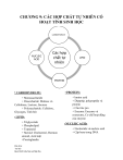 CHƯƠNG 9: CÁC HỢP CHẤT TỰ NHIÊN CÓ HOẠT TÍNH SINH HỌC CARBOHYDRATE NUCLEIC ACID Các hợp chất tự nhiên LIPID PROTEIN CARBOHYDRATE: + Monosaccharide + Disaccharide: Maltose và Cellobiose, Lactose, Sucrose + Polysaccharide: Cellulose, Glycogen, Tinh bột LIPID: + Triglyceride + Phospholipid + Terpenoid + Steroid: Cholesterol, Hormon steroid, Acid mật +Prostaglandin Cấu trúc Vai trò Quá trình tiêu hóa và hấp thu PROTEIN: +Amino acid + Dipeptip, polypeptide và protein + Cấu trúc pro + Enzyme: Enzyme và coenzyme, Cơ chế hoạt động của enzyme NUCLEIC ACID: + Nucleotide và nucleic acid + Cặp base trong DNA CARBOHYDRATE - Carbohydrate là hợp chất chứa carbon, hydro và oxy, trong đó tỷ lệ C: H: O là 1: 2: 1. Công thức chung: Cn(H2O)n - Tất cả các carbohyrate đều chứa -OH + Monosaccharide chứa một lượng lớn nhóm -OH -OH có thể liên kết hydrogen với nước làm cho monosaccharide hòa tan trong nước + Sự hiện diện của nhóm -OH trên các nguyên tử carbon liền kề đường có vị ngọt - Chức năng: . Nguồn năng lượng. . Hình thức lưu trữ. . Hình thức kết cấu. - Phân loại: . Monosaccharide (đường đơn): một đơn vị đường, tan trong nước . Disaccharide: chứa 2 monosaccharide: hai đơn vị đường, tan trong nước . Oligosaccharide: chứa 3-12 monosaccharide. . Polysaccharides (complex sugars): chứa nhiều hơn (12 monosaccharide): nhiều đơn vị đường, không tan trong nước MONOSACCHARIDE: - Monosaccharide tồn tại cả dạng mạch hở và mạch vòng - Monosaccharide không thể bị phân hủy thành đường khác - Monosaccharide được phân loại theo các đặc điểm khác nhau + Vị trí nhóm cacbonyl của nó (C=O) + Số nguyên tử C mà nó chứa: . Triose: 3C . Tetrose: 4C . Pentose: 5C . Hexose: 6C . Heptose: 7C * -ose: carbohydrate * aldo- hoặc keto-: xác định carbonyl trong phân tử đường là aldehyde hay ketone Ví dụ: Glucose là một aldohexose: đường, 6C, chứa nhóm aldehyde Fructose là một ketohexose: đường, 6C, chứa nhóm keto Ribose là một aldopentose: đường, 5C, chứa nhóm aldehyde Sedoheptulose là một ketoheptose: đường, 7C, chứa nhóm keto Cấu trúc Vai trò Quá trình tiêu hóa và hấp thu Cấu trúc mạch hở gồm 2 loại: aldose và ketone Cấu trúc mạch vòng : Anomer Đồng phân của monosaccharide Đường D-L - Phần lớn các loại đường trong tự nhiên tồn tại ở cấu hình D. + OH- ở tâm bất đối dưới cùng bên phải đường D + OH- ở tâm bất đối dưới cùng bên trái đường L * Có n carbon bất đối => 2n đồng phân quang học Epimer - Là hai monosaccharide có cấu hình khác nhau tại 1 carbon bất đối Cấu trúc Vai trò Quá trình tiêu hóa và hấp thu Anomer * OH- hướng xuống dưới: 𝜶 * OH- hướng lên trên: 𝜷 Cấu trúc Vai trò Quá trình tiêu hóa và hấp thu * BIỂU DIỄN CẤU TRÚC ĐƯỜNG Tính khử của Monosaccharide - Phản ứng của aldose hoặc ketose khử monosacharide thành polyalcohol => alditol - D- Gluctiol hay đc gọi là D-sorbitol, có nhiều trong các loại trái cây và được dùng làm chất ngọt thay đường - Đường hexose có nhóm aldehyde hoặc ketone tự do có tính khử Cấu trúc Vai trò Quá trình tiêu hóa và hấp thu trong dd kiềm. Các loại đường khử này có thể khử ion Cu+2 thành ion Cu+1. DISACCHARIDE: - Được hình thành từ 2 monosaccharide bằng liên kết glycosid . Liên kết này được hình thành từ một phân tử nước bị loại bỏ, H- từ cacbon anome của một đường và –OH từ bất kỳ cacbon nào khác của đường thứ hai. Các loại Disaccharide - Có 3 loại phổ biến: + Sucrose (đường mía hoặc đường ăn) + Lactose (đường sữa) + Maltose (đường mạch nha) Lactose và Maltose là đường khử Sucrose đường không khử Cấu trúc Vai trò Quá trình tiêu hóa và hấp thu * Lactose là đường khử * Lactose là đường khử, có liên kết 14 −𝛽- giữa C1 của galactose và C4 của glucose * Hỗn hợp 1:1 (Glu và Fru) gọi là đường nghịch đảo Cấu trúc Vai trò Quá trình tiêu hóa và hấp thu * Glucose và frucose được nối với nhau bằng liên kết glycoside Tính khử của disaccharide (phải có nhóm aldehyde hoặc ketone tự do) - Sucrose ko là đường khử vì thiếu aldehyde hoặc ketone tự do - Lactose và Mantonse là đường khử vì có 1 nhóm aldehyde tự do POLYSACCHARIDE - Polysaccharide là các polyme của monosaccharide - Có 2 loại polysaccharide: + Homopolysaccharide: chứa 1 loại monosaccharide + Heteropolysaccharide: chứa nhiều loại monosaccharide khác nhau - Các polysaccharide phổ biến: + Tinh bột, cellulose, glycogen, dextrin => Tất cả polysaccharide này chỉ tạo thành từ glucose . Thực vật dự trữ carbohydrate dưới dạng tinh bột . Thực vật sử dụng cellulose như các bộ phận hỗ trợ và cấu trúc (gỗ, bông, giấy) . Động vật dự trữ carbohydrate dưới dạng glycogen. Trong cơ thể được lưu trữ trong gan và cơ bắp dưới dạng glycogen Cellulose - Chứa hàng ngàn đơn vị D-glucose liên kết bằng 1 4β-glycoside. Sau đó các phân tử cellulose liên kết với nhau thành 1 khối lớn bằng liên kết glycogen - Cenllulose có trong tất cả các Cấu trúc Vai trò Quá trình tiêu hóa và hấp thu loại thực vật: màng tế bào - Cenllulose được tạo thành từ chuỗi phân tử glucose thẳng dài và ko đc con người tiêu hóa vì thiếu enzyme cellulase - Cellulose có tính hút ẩm hút nước và l