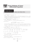 5 Series Solutions of Linear Differential Equations EXERCISES 5.1 Solutions About Ordinary Points n+1 n+1 2 x /(n + 1) 2n 1. lim = lim |x| = 2|x| n n n→∞ n→∞ 2 x /n n+1 The series is absolutely convergent for 2|x| < 1 or |x| < 12 . The radius of convergence is R = 12 . At x = − 12 , the ∞ ∞ series n=1 (−1)n /n converges by the alternating series test. At x = 12 , the series n=1 1/n is the harmonic series which diverges. Thus, the given series converges on [− 12 , 12 ). 100n+1 (x + 7)n+1 /(n + 1)! = lim 100 |x + 7| = 0 2. lim n→∞ n + 1 n→∞ 100n (x + 7)n /n! The radius of convergence is R = ∞. The series is absolutely convergent on (−∞, ∞). 3. By the ratio test, (x − 5)n+1 /10n+1 = lim 1 |x − 5| = 1 |x − 5|. lim n→∞ (x − 5)n /10n n→∞ 10 10 1 The series is absolutely convergent for 10 |x − 5| < 1, |x − 5| < 10, or on (−5, 15). The radius of convergence is ∞ ∞ n R = 10. At x = −5, the series n=1 (−1) (−10)n /10n = n=1 1 diverges by the nth term test. At x = 15, the ∞ ∞ series n=1 (−1)n 10n /10n = n=1 (−1)n diverges by the nth term test. Thus, the series converges on (−5, 15). (n + 1)!(x − 1)n+1 = lim (n + 1)|x − 1| = ∞, x = 1 4. lim n→∞ n→∞ n!(x − 1)n 0, x = 1 The radius of convergence is R = 0 and the series converges only for x = 1. x3 x5 x7 x2 x4 x6 2x3 2x5 4x7 5. sin x cos x = x − + − + ··· 1− + − + ··· = x − + − + ··· 6 120 5040 2 24 720 3 15 315 x2 x3 x4 x2 x4 x3 x4 6. e−x cos x = 1 − x + − + − ··· 1− + − ··· = 1 − x + − + ··· 2 6 24 2 24 3 6 1 1 5x4 61x6 x2 = + + + ··· =1+ 2 4 6 cos x 2 4! 6! 1 − x2 + x − x + · · · 4! 6! Since cos(π/2) = cos(−π/2) = 0, the series converges on (−π/2, π/2). 1−x 1 3 3 3 8. = − x + x2 − x3 + · · · 2+x 2 4 8 16 Since the function is undefined at x = −2, the series converges on (−2, 2). 7. 9. Let k = n + 2 so that n = k − 2 and ∞ n=1 ncn xn+2 = ∞ (k − 2)ck−2 xk . k=3 252 5.1 Solutions About Ordinary Points 10. Let k = n − 3 so that n = k + 3 and ∞ ∞ (2n − 1)cn xn−3 = n=3 11. ∞ 2ncn xn−1 + n=1 ∞ (2k + 5)ck+3 xk . k=0 ∞ 6cn xn+1 = 2 · 1 · c1 x0 + n=0 2ncn xn−1 + n=2 ∞ n=0 k=n−1 = 2c1 + ∞ = 2c1 + k=n+1 ∞ 2(k + 1)ck+1 xk + k=1 ∞ 6cn xn+1 6ck−1 xk k=1 [2(k + 1)ck+1 + 6ck−1 ]xk k=1 12. ∞ ∞ n(n − 1)cn xn + 2 n=2 n=2 ncn xn n=1 = 2 · 2 · 1c2 x + 2 · 3 · 2c3 x + 3 · 1 · c1 x + 0 ∞ n(n − 1)cn xn−2 + 3 1 1 ∞ n(n − 1)cn x +2 n n=2 ∞ n(n − 1)cn x n−2 n=4 = 4c2 + (3c1 + 12c3 )x + = 4c2 + (3c1 + 12c3 )x + ∞ k(k − 1)ck xk + 2 k=2 ∞ k=2 ∞ ∞ n=2 k=n = 4c2 + (3c1 + 12c3 )x + +3 ∞ k=n−2 (k + 2)(k + 1)ck+2 xk + 3 k=2 ∞ ncn xn k=n kck xk k=2 k(k − 1) + 3k ck + 2(k + 2)(k + 1)ck+2 xk k(k + 2)ck + 2(k + 1)(k + 2)ck+2 xk k=2 13. y = ∞ (−1)n+1 xn−1 , y = n=1 ∞ (−1)n+1 (n − 1)xn−2 n=2 (x + 1)y + y = (x + 1) ∞ (−1)n+1 (n − 1)xn−2 + n=2 = ∞ ∞ (−1)n+1 xn−1 n=1 (−1)n+1 (n − 1)xn−1 + n=2 ∞ (−1)n+1 (n − 1)xn−2 + n=2 = −x0 + x0 + ∞ ∞ (−1)n+1 (n − 1)xn−2 + n=3 k=n−1 = = ∞ k=1 ∞ (−1)k+2 kxk + ∞ 14. y = k=n−2 (−1)k+3 (k + 1)xk + k=1 ∞ (−1)k+2 xk k=1 (−1)k+2 k − (−1)k+2 k − (−1)k+2 + (−1)k+2 xk = 0 k=1 ∞ (−1)n 2n 2n−1 x , 22n (n!)2 n=1 y = ∞ (−1)n 2n(2n − 1) n=1 22n (n!)2 (−1)n+1 xn−1 n=1 (−1)n+1 (n − 1)xn−1 + n=2 ∞ x2n−2 253 ∞ n=2 (−1)n+1 xn−1 k=n−1 5.1 Solutions About Ordinary Points xy + y + xy = ∞ (−1)n 2n(2n − 1) 22n (n!)2 n=1 x2n−1 + ∞ (−1)n 2n ∞ (−1)n 2n+1 2n−1 x + x 22n (n!)2 22n (n!)2 n=1 n=0 k=n ∞ k=n k=n+1 (−1) 2k(2k − 1) (−1) 2k (−1) x2k−1 + 2k + 2k−2 2k 2 2 2 (k!) 2 (k!) 2 [(k − 1)!]2 k=1 ∞ (−1)k (2k)2 (−1)k x2k−1 = − 2k−2 22k (k!)2 2 [(k − 1)!]2 k=1 ∞ (2k)2 − 22 k 2 2k−1 x = (−1)k =0 22k (k!)2 = k k k−1 k=1 15. The singular points of (x2 − 25)y + 2xy + y = 0 are −5 and 5. The distance from 0 to either of these points is 5. The distance from 1 to the closest of these points is 4. 16. The singular points of (x2 − 2x + 10)y + xy − 4y = 0 are 1 + 3i and 1 − 3i. The distance from 0 to either of √ these points is 10 . The distance from 1 to either of these points is 3. ∞ 17. Substituting y = n=0 cn xn into the differential equation we have y − xy = ∞ n(n − 1)cn xn−2 − n=2 ∞ n=0 k=n−2 = 2c2 + ∞ cn xn+1 = ∞ (k + 2)(k + 1)ck+2 xk − k=0 ∞ ck−1 xk k=1 k=n+1 [(k + 2)(k + 1)ck+2 − ck−1 ]xk = 0. k=1 Thus c2 = 0 (k + 2)(k + 1)ck+2 − ck−1 = 0 and ck+2 = 1 ck−1 , (k + 2)(k + 1) k = 1, 2, 3, . . . . Choosing c0 = 1 and c1 = 0 we find 1 6 c4 = c5 = 0 1 c6 = 180 c3 = and so on. For c0 = 0 and c1 = 1 we obtain c3 = 0 1 c4 = 12 c5 = c6 = 0 1 c7 = 504 and so on. Thus, two solutions are 1 1 6 y1 = 1 + x3 + x + ··· 6 180 and 254 y2 = x + 1 4 1 7 x + x + ··· . 12 504 5.1 18. Substituting y = Solutions About Ordinary Points ∞ n n=0 cn x into the differential equation we have 2 y +x y = ∞ n(n − 1)cn x n−2 n=2 + ∞ n+2 cn x n=0 k=n−2 = ∞ k (k + 2)(k + 1)ck+2 x + k=0 ∞ ck−2 xk k=2 k=n+2 ∞ = 2c2 + 6c3 x + [(k + 2)(k + 1)ck+2 + ck−2 ]xk = 0. k=2 Thus c2 = c3 = 0 (k + 2)(k + 1)ck+2 + ck−2 = 0 and ck+2 = − 1 ck−2 , (k + 2)(k + 1) k = 2, 3, 4, . . . . Choosing c0 = 1 and c1 = 0 we find 1 12 c5 = c6 = c7 = 0 1 c8 = 672 c4 = − and so on. For c0 = 0 and c1 = 1 we obtain c4 = 0 1 20 c6 = c7 = c8 = 0 1 c9 = 1440 c5 = − and so on. Thus, two solutions are y1 = 1 − 19. Substituting y = 1 4 1 8 x + x − ··· 12 672 and y2 = x − 1 5 1 9 x + x − ··· . 20 1440 ∞ n n=0 cn x into the differential equation we have y − 2xy + y = ∞ n=2 n(n − 1)cn xn−2 − 2 ∞ n=1 k=n−2 = ∞ ncn xn + k=0 = 2c2 + c0 + k=n (k + 2)(k + 1)ck+2 xk − 2 k=n kck xk + k=1 ∞ cn xn n=0 ∞ ∞ ∞ ck xk k=0 [(k + 2)(k + 1)ck+2 − (2k − 1)ck ]xk = 0. k=1 Thus 2c2 + c0 = 0 (k + 2)(k + 1)ck+2 − (2k − 1)ck = 0 25