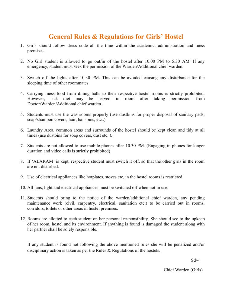 General Rules & Regulations for Girls’ Hostel 1. Girls should follow dress code all the time within the academic, administration and mess premises. 2. No Girl student is allowed to go out/in of the hostel after 10.00 PM to 5.30 AM. If any emergency, student must seek the permission of the Warden/Additional chief warden. 3. Switch off the lights after 10.30 PM. This can be avoided causing any disturbance for the sleeping time of other roommates. 4. Carrying mess food from dining halls to their respective hostel rooms is strictly prohibited. However, sick diet may be served in room after taking permission from Doctor/Warden/Additional chief warden. 5. Students must use the washrooms properly (use dustbins for proper disposal of sanitary pads, soap/shampoo covers, hair, hair-pins, etc..). 6. Laundry Area, common areas and surrounds of the hostel should be kept clean and tidy at all times (use dustbins for soap covers, dust etc..). 7. Students are not allowed to use mobile phones after 10.30 PM. (Engaging in phones for longer duration and video calls is strictly prohibited) 8. If ‘ALARAM’ is kept, respective student must switch it off, so that the other girls in the room are not disturbed. 9. Use of electrical appliances like hotplates, stoves etc, in the hostel rooms is restricted. 10. All fans, light and electrical appliances must be switched off when not in use. 11. Students should bring to the notice of the warden/additional chief warden, any pending maintenance work (civil, carpentry, electrical, sanitation etc.) to be carried out in rooms, corridors, toilets or other areas in hostel premises. 12. Rooms are allotted to each student on her personal responsibility. She should see to the upkeep of her room, hostel and its environment. If anything is found is damaged the student along with her partner shall be solely responsible. If any student is found not following the above mentioned rules she will be penalized and/or disciplinary action is taken as per the Rules & Regulations of the hostels. Sd/Chief Warden (Girls)