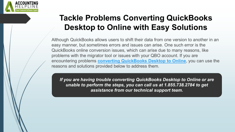 Tackle Problems Converting QuickBooks Desktop to Online with Easy Solutions Although QuickBooks allows users to shift their data from one version to another in an easy manner, but sometimes errors and issues can arise. One such error is the QuickBooks online conversion issues, which can arise due to many reasons, like problems with the migrator tool or issues with your QBO account. If you are encountering problems converting QuickBooks Desktop to Online, you can use the reasons and solutions provided below to address them. If you are having trouble converting QuickBooks Desktop to Online or are unable to perform the steps, you can call us at 1.855.738.2784 to get assistance from our technical support team. Common Reasons Why You Are Unable to Import QuickBooks Desktop to Online You might be getting QuickBooks Desktop to Online issues while undertaking the conversion process due to the following possible factors – 1. There are problems while importing the payroll data in QuickBooks Online, as you have already entered the employees in QBO. 2. The file you are trying to import to QuickBooks Online is too big or not condensed to an appropriate size. 3. The company file you are trying to import is not eligible for QBO, and you need to check the import compatibility. 4. Your import process might also get hampered when the data you are trying to import is located in an external network drive. How to Terminate the Not Able to Import QuickBooks Desktop Data to Online? You can easily address the unable to import transactions from QuickBooks Desktop to Online issue by following the solutions provided below – Solution 1 – Check the Company File Compatibility for QBO Import You need to ensure that your company file is compatible with your QBO account to eliminate the issues while converting QuickBooks Desktop to Online. 1. Firstly, you need to ensure that you are logged in from an admin account while you import the company data to QBO. 2. Next, you need to remember that company data within 60 days of subscription can only be converted to QBO. If you are data exceeds the limit, you need to contact a pro advisor to extend the limit. 3. Begin by signing in to the QB Online company and finishing the setup of interview questions, followed by saving the company address again. 4. If this error persists, form a new QB online account to undertake the import process and ensure to cancel the earlier subscription. Solution 2 – Copy the Company File to a New Location and Switch to Single-User Mode You can try importing the company file from a new location in a single-user mode. 1. Firstly, find the location of your QuickBooks company file and shut QB Desktop so that you can import the QBW file into QuickBooks Online by copying the company file to the C drive. 2. Next, launch the company file from the new location and go to the File menu to switch to the single-user mode. 3. Finally, go to the Company menu and select the Export your company file to QuickBooks Online option to complete the QuickBooks desktop import process. Conclusion Problems converting QuickBooks Desktop to Online can be rectified by using the solutions provided in this article. If the issues persist, you can reach out to us at 1.855.738.2784 to get assistance from our QB professionals.