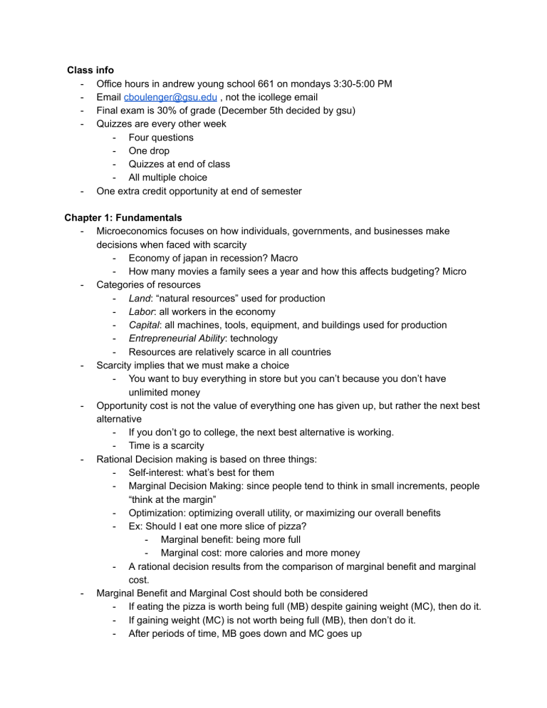 Class info - Office hours in andrew young school 661 on mondays 3:30-5:00 PM - Email cboulenger@gsu.edu , not the icollege email - Final exam is 30% of grade (December 5th decided by gsu) - Quizzes are every other week - Four questions - One drop - Quizzes at end of class - All multiple choice - One extra credit opportunity at end of semester Chapter 1: Fundamentals - Microeconomics focuses on how individuals, governments, and businesses make decisions when faced with scarcity - Economy of japan in recession? Macro - How many movies a family sees a year and how this affects budgeting? Micro - Categories of resources - Land: “natural resources” used for production - Labor: all workers in the economy - Capital: all machines, tools, equipment, and buildings used for production - Entrepreneurial Ability: technology - Resources are relatively scarce in all countries - Scarcity implies that we must make a choice - You want to buy everything in store but you can’t because you don’t have unlimited money - Opportunity cost is not the value of everything one has given up, but rather the next best alternative - If you don’t go to college, the next best alternative is working. - Time is a scarcity - Rational Decision making is based on three things: - Self-interest: what’s best for them - Marginal Decision Making: since people tend to think in small increments, people “think at the margin” - Optimization: optimizing overall utility, or maximizing our overall benefits - Ex: Should I eat one more slice of pizza? - Marginal benefit: being more full - Marginal cost: more calories and more money - A rational decision results from the comparison of marginal benefit and marginal cost. - Marginal Benefit and Marginal Cost should both be considered - If eating the pizza is worth being full (MB) despite gaining weight (MC), then do it. - If gaining weight (MC) is not worth being full (MB), then don’t do it. - After periods of time, MB goes down and MC goes up - - - - The second slice of pizza is worth it since you’re still hungry, but the fourth isn’t since you’re not very hungry anymore Graphing MB and MC (see slides 9 & 10) - MB always goes on X axis and MC always goes on Y axis - MB looks like demand curve while MC looks like supply curve - Equilibrium is where the two cross - Look at different points to see how heavily MB or MC outweighs the other - In the example of the graph at point 1, 5 (MB) > 1 (MC) - At point 4, 2 (MB) < 4 (MC) - If Michelle wants to purchase a new phone, she will buy it if the MB of the phone is greater than the MC. - The main significance of the equilibrium between MB and MC is that a rational decision has been made. Production schedule examples (CH 1 continued slide) - All points below PPF (production possibilities frontier) are possible but inefficient - All points above PPF are not feasible - All points on PPF are both possible and efficient - PPF illustrates opportunity cost Calculating opportunity costs - Opportunity cost= (loss/gain) - Ex. Max goes from 0 apples to 50 apples (see opportunity cost example 2) - gain= 50 apples - loss= 300 oranges to 150 oranges (300-150=150 apples) - What is Max’s OC of 50 more apples? 150 oranges - What is Max’s OC of 1 more apple? - 1 apple=(150/50)= 3 oranges (gaining 1 apple for every 3 oranges given up) - Ex. 50 more apples means giving up 150 oranges (see OC example 7) - gain= 50 apples - loss= 150 oranges - What is the OC of 50 more apples? 150 oranges - What is the OC of 1 more apple? - 1 apple=(150/50)= 3 oranges - Ex. What is Alex’s cost for one orange? (see OC example 10) - gain= 300 oranges (0 to 300) - loss= 100 apples (100 to 0) - 1 orange= (100/300)= ⅓ apple - Ex. What is Clara’s opportunity cost of producing an apple? (see Quick Quiz) - gain= 200 apples - loss= 200 oranges - 1 apple= (200/200)= 1 orange - - - - - What about 1 more orange? gain= 200 oranges loss= 200 apples - 1 orange= (200/200)= 1 apple Comparative Advantage: The ability to produce a good or service at a lower relative OC than another producer - Who has the CA between Alex and Clara? (who gives up less?) Apples Oranges Alex 3 oranges ⅓ apple Clara 1 orange 1 apple - Alex has CA in oranges (⅓ < 1) while Clara has CA in apples (1 < 3) - The theory of CA states that countries gain from trade if each country specializes in producing the products it is best suited to produce, the world output can rise. - Ex. Who has the CA? (see Quiz Question 8) - Estonia makes 4 trombones and 400 snowshoes - gain=4 trombones - loss=400 snowshoes - 1 trombone=(400/4)= 100 snowshoes - gain=400 snowshoes - loss=4 - 1 snowshoe=(4/400)= 1/100 trombone - Bulgaria makes 2 trombones and 300 snowshoes - gain=2 trombones - loss=300 snowshoes - 1 trombone=(300/2)= 150 snowshoes - gain=300 snowshoes - loss=2 trombones - 1 snowshoe=(2/300)= 1/150 trombone - Estonia has CA in trombones (100 snowshoes < 150 snowshoes) while Bulgaria has CA in snowshoes (1/150 trombone < 1/100 trombone) - Specialization occurs when two or more partners work together making what they’re good at. Circular Flow Model: a model that concisely describes how goods, services, resources, and money flow back and forth in an economy (see Circular Flow Model 3 slide) - Two markets > resources & products - Resources: households are sellers (sell their labor) & firms are the buyers - Two agents > firms & households - The red arrows are the flow of resources - Firms supply goods and services to the product market which then supplies resources to household. Household then supplies labor to - resource market where the labor from household is used by the firm to make goods and services Flow of money is the gray arrow - Household buys goods and services in the product market, pouring money from household to product market. Money from the product market goes to the firm as revenue. Firm uses this revenue to pay the workers for labor, or to the resource market. The resource market then sends the