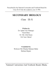 Prescribed by the National Curriculum and Textbook Board for Class IX-X from the academic year of 1996. SECONDARY BIOLOGY Class IX-X Written by Dr. Iqubal Aziz Muttaqui Nasim Banu Dr. Md. Abul Hasan Gul Anar Ahmed Translated by Professor Md. Obaidur Rahman Sikder Raihana Begum National Curriculum And Textbook Board, Dhaka Published by National Curriculum and Textbook Board 67-70, Motijheel Commercial Area, Dhaka [All rights reserved by the Publisher] First Print : 1998 Second Edition: 2007 Reprint April : 2009 Reprint October : Computer Compose Perform Color Graphics (Pvt) Ltd. Illustration Arif Reza Khan Abu Hasmi Md. Faisal Design NCTB, Dhaka For free distribution from academic year 2012 by the Government of Bangladesh. Printed by : PREFACE Education is the key to development. A progressively improved education system largely determines the pace and the quality of national development. To reflect the hopes and aspirations of the people and the socio-economic and cultural reality in the context of the post independent Bangladesh, new textbooks were introduced in the beginning of the 1980s following the recommendations of the National Curriculum and Textbook Committee. In 1994, in accordance with the need for change and development, the textbooks of lower secondary, secondary and higher secondary were revised and modified. The textbooks from classes VI to IX were written in 1995. in 2000, almost all the textbooks were rationally evaluated and necessary revision were made. In 2008, the Ministry of Education formed a Task Force for Education. According to the advice and guidance of the Task Force, the cover, spelling and information in the textbooks were updated and corrected. To make assessment more meaningful and in accordance with the need of the curriculum, Creative Questions and Multiple Choice Questions are given at the end of each chapter. It is hoped that this will reduce the dependency of students on rote memorisation. The students will be able to apply the knowledge they have gained to judge, analyses and evaluate real life situation. In the revised curriculum. Botany & Zoology has been included in one book Biology. The study of Biology has been Presanted through both theory and practical classes. The practical experiments have been given separately. Students can gain knowledge about Biology and their interest in science will increase when they complete the experiments with the help of the teachers. I hope that the textbook of Biology properly reflects the objectives of the curriculum. This book of Biology for class IX & X is the English Version of the original textbook entitled 'Maydhamic Gibobiggayan' written in Bangla. We know that curriculum development is a continuous process on which textbooks are written. Any logical and formative suggestions for improvement will be considered with care. On the event of the golden jubilee of the Independence of Bangladesh in 2021, we want to be a part of the ceaseless effort to build a prosperous Bangladesh. In spite of sincere efforts in translation, editing and printing some inadvertent errors and omissions may be found in the book. However, our efforts to make it more refined and impeccable will continue. Any constructive suggestion towards its further improvement will be gratefully considered. I thank those who have assisted us with their intellect and effort in the writing, editing and rational evaluation of this book. We hope that the book will be useful for the students for whom it is written. Prof. Md. Mostafa Kamaluddin Chairman National Curriculum and Textbook Board Dhaka Contents Chapter Topics Page 1 Introduction to Biology 1 2 Structure and Nature of living Cell 15 3 Cell Division 28 4 Division of Labour in Multicellular Plants: Tissue and 36 Tissue System 5 Animal Tissue, Organ and Organ System 46 6 Classification of Plants 62 7 Animal Diversity and Classification 78 8 Structural Organization and Acquaintance of Animals 95 9 Physiological Activities in Plants : Nutrition 164 Imbibition, Osmosis, Ascent of Sap And Transpiration 168 Photosynthesis and Respiration 182 Growth and Development of Plants 199 10 Flower 207 11 Pollination, Fertilization and dispersal of fruits and 216 seeds 12 Reproduction of Plants 228 13 Organism and Environment 232 14 Pollution and Conservation of Environment 247 15 Natural Diversities of Bangladesh-Distribution of 260 Plants and Animals 16 Economic Biology 300 Practical Botany 314 Practical Zoology 334 CHAPTER ONE INTRODUCTION TO BIOLOGY Now a days we find contributions of Aristotle, Socrates, Theophrastus and many other scholars of the past age in different fields of knowledge. This is not possible for the scholars of the present time. A question may arise in your mind as to why it is not possible today. The reason is that in ages long past the extent of knowledge was limited. People engaged in achieving knowledge were also small in number. Today the dimension of knowledge has been increased many times. To contribute in more than one field is quite difficult at the present time. For convenience to know and understand things we have divided our world of knowledge in many branches. In this way Science, Literature, Arts, Social Science and many other branches have been created. As a whole, knowledge of human beings is undivided. But it has been divided into various branches for easy learning and understanding. You may have known that the knowledge of science is increasing rapidly. It is becoming possible because of the research of a large number of scientists in different fields of science. Many people think that knowledge of science is becoming double in every eight years. New subjects of science are being created. It is not possible to realize and understand this huge store of knowledge for an individual alone. As a result, scientists are engaged in research in particular subject or topic. At different times many scholars have divided the knowledge of science in various ways. The division and diff