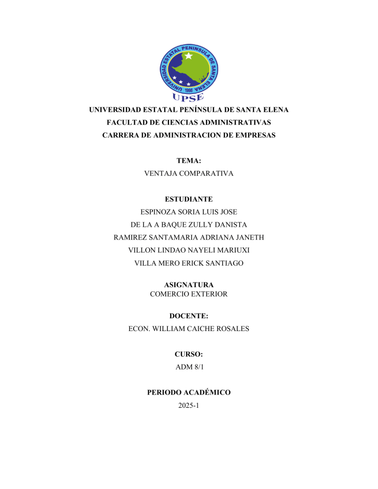 UNIVERSIDAD ESTATAL PENÍNSULA DE SANTA ELENA FACULTAD DE CIENCIAS ADMINISTRATIVAS CARRERA DE ADMINISTRACION DE EMPRESAS TEMA: VENTAJA COMPARATIVA ESTUDIANTE ESPINOZA SORIA LUIS JOSE DE LA A BAQUE ZULLY DANISTA RAMIREZ SANTAMARIA ADRIANA JANETH VILLON LINDAO NAYELI MARIUXI VILLA MERO ERICK SANTIAGO ASIGNATURA COMERCIO EXTERIOR DOCENTE: ECON. WILLIAM CAICHE ROSALES CURSO: ADM 8/1 PERIODO ACADÉMICO 2025-1 VENTAJA COMPARATIVA La teoría de la ventaja competitiva sugiere que todos se benefician si las decisiones se toman con base en la ventaja competitiva a todos los niveles: nacional, corporativo, local e individual. En pocas palabras, no es más que exigir la utilización óptima de los recursos y la globalización de la manufactura y los servicios a nivel mundial, como si viviéramos en un mundo sin fronteras. Desafortunadamente, no vivimos en un mundo sin fronteras, ya que existen políticos y límites definidos que definen el territorio de las naciones y los políticos; de ahí los problemas relacionados con la pérdida de empleos debido a la deslocalización y el uso de medidas proteccionistas. ETAPA HISTORICA Porter (1980) en su libro Estrategia Competitiva, comienza por explicar que todas las empresas tienen estrategias competitivas, algunas explícitas y otras implícitas y que estas estrategias deben enfocarse hacia el entorno en que disputan el mercado. (Benitez Codas, 2012) La teoría de la ventaja comparativa es de la época clásica, junto con la de la economía que tuvo lugar durante los siglos 18 y 19. Durante esta época, se desarrollaron las bases de comercio y teoría económica alrededor de la figura de Adam Smith, David Ricardo, Thomas Malthus y John Stuart Mill. Dentro de la economía internacional, la comparativa fue una de las contribuciones más importantes de David Ricardo. Considerando el concepto de costo de oportunidad, la base de la comparativa se encuentra en la ventaja de costo de oportunidad, que es el valor que se deja de obtener al producir un bien en lugar de otro. Un país tiene una ventaja comparativa en la producción de un bien si dicho país tiene un menor costo de oportunidad produciendo ese bien en comparación con otro país. ( Riojas, 1997) PRINCIPALES AUTORES 1. David Ricardo: Es el autor clásico de la teoría de la ventaja comparativa. Según él, los países deben especializarse en la producción de bienes en los que tienen una ventaja comparativa, es decir, aquellos bienes que pueden producir a un costo relativamente menor que otros países, incluso si no tienen ventaja absoluta en la producción de ningún bien. 2. Adam Smith: Aunque no es el creador de la ventaja comparativa, Adam Smith es conocido por la teoría de la ventaja absoluta, que complementa la de Ricardo. Smith argumenta que si un país puede producir un bien más eficientemente que otro, debería especializarse en su producción. 3. Paul Samuelson: Economista contemporáneo y premio Nobel, que desarrolló teorías más modernas sobre el comercio internacional y la ventaja comparativa. Aunque no es el creador del concepto, sus trabajos ayudaron a integrar la teoría de la ventaja comparativa dentro del marco de la teoría del equilibrio general y el comercio. 4. Elinor Ostrom: Si bien Ostrom es conocida por sus estudios sobre bienes comunes y la gobernanza, también toca temas relacionados con la cooperación internacional y los recursos, que pueden estar indirectamente relacionados con la ventaja comparativa, especialmente en lo que respecta a la gestión compartida de recursos en distintos contextos. 5. Heckscher y Ohlin: Estos economistas, en su teoría del modelo HeckscherOhlin, amplían la teoría de la ventaja comparativa al introducir el factor de la dotación de factores (trabajo, capital, recursos naturales) y cómo la especialización de los países se basa en la abundancia relativa de esos factores. PRINCIPALES SUPUESTOS O FUNDAMENTOS a) Diferencias en la productividad del trabajo Cada país tiene diferentes niveles de productividad en la producción de bienes debido a la tecnología, los recursos naturales y la especialización del trabajo. Un país debe especializarse en los bienes que puede producir con menor costo de oportunidad. (Ricardo, 1817) b) El comercio es mutuamente beneficioso Incluso si un país es más eficiente en la producción de todos los bienes, aún puede beneficiarse del comercio si se especializa en los productos donde tiene una ventaja comparativa y comercia por otros bienes. (Krugman y Maurice, 2006) c) Costos de oportunidad y especialización La ventaja comparativa se basa en el costo de oportunidad, no en la ventaja absoluta. Si un país renuncia a menos producción de otro bien para producir un bien determinado, entonces tiene una ventaja comparativa en la producción de ese bien. (Carbaugh, 2009) PRINCIPIOS RELACIONADOS CON EL COMERCIO EXTERIOR El beneficio de la ventaja comparativa es la capacidad de producir un bien o servicio por un costo de oportunidad más bajo. Proporciona a las empresas la capacidad de vender bienes y servicios a precios más bajos que sus competidores, obteniendo mayores márgenes de ventas y una mayor rentabilidad (Franco, 2024) La ventaja comparativa en el comercio exterior: Concepto de ventaja comparativa: La teoría de la ventaja comparativa, desarrollada por David Ricardo, sostiene que los países deben especializarse en la producción de bienes en los que tienen un menor costo de oportunidad y comerciar con otros países para maximizar su eficiencia económica (Ricardo, 1817). Especialización y comercio: Según Krugman y Obstfeld (2018), la ventaja comparativa permite que los países se beneficien del comercio internacional, ya que la especialización en bienes con menores costos de oportunidad aumenta la productividad y el bienestar global. Costos de oportunidad y eficiencia: Mankiw (2020) explica que la ventaja comparativa se basa en los costos de oportunidad, lo que significa que un país debe producir a