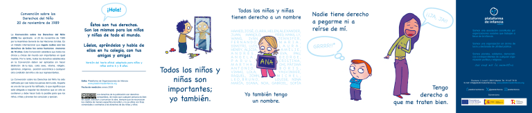 Edita: Plataforma de Organizaciones de Infancia www.plataformadeinfancia.org Fecha de reedición: enero 2024 Los derechos de la publicación son derechos compartidos, de modo que cualquier persona es libre de copiar, distribuir y comunicar la obra, siempre que se reconozcan los créditos de manera específica del editor y no se utilice con fines comerciales o contrarios a los derechos de las niñas y niños. Escosura, 3. Local 2. 28015 Madrid. Tel.: 91 447 78 53 E-mail: info@plataformadeinfancia.org www.plataformadeinfancia.org plataformainfancia @platdeinfancia Subvenciona: platdeinfancia