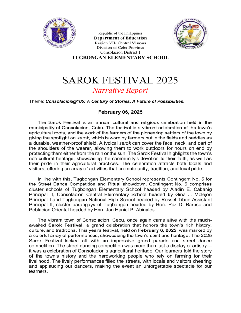 Republic of the Philippines Department of Education Region VII- Central Visayas Division of Cebu Province Consolacion District 1 TUGBONGAN ELEMENTARY SCHOOL SAROK FESTIVAL 2025 Narrative Report Theme: Consolacion@105: A Century of Stories, A Future of Possibilities. February 06, 2025 The Sarok Festival is an annual cultural and religious celebration held in the municipality of Consolacion, Cebu. The festival is a vibrant celebration of the town’s agricultural roots, and the work of the farmers of the pioneering settlers of the town by giving the spotlight on sarok, which is worn by farmers out in the fields and paddies as a durable, weather-proof shield. A typical sarok can cover the face, neck, and part of the shoulders of the wearer, allowing them to work outdoors for hours on end by protecting them either from the rain or the sun. The Sarok Festival highlights the town's rich cultural heritage, showcasing the community's devotion to their faith, as well as their pride in their agricultural practices. The celebration attracts both locals and visitors, offering an array of activities that promote unity, tradition, and local pride. In line with this, Tugbongan Elementary School represents Contingent No. 5 for the Street Dance Competition and Ritual showdown. Contingent No. 5 comprises cluster schools of Tugbongan Elementary School headed by Aladin E. Cabanig Principal II, Consolacion Central Elementary School headed by Gina J. Molejon Principal I and Tugbongan National High School headed by Rossel Tibon Assistant Principal II, cluster barangays of Tugbongan headed by Hon. Paz D. Baroso and Poblacion Oriental headed by Hon. Jon Haniel P. Abinales. The vibrant town of Consolacion, Cebu, once again came alive with the muchawaited Sarok Festival, a grand celebration that honors the town's rich history, culture, and traditions. This year's festival, held on February 6, 2025, was marked by a colorful array of performances, showcasing the town's spirit and heritage. The 2025 Sarok Festival kicked off with an impressive grand parade and street dance competition. The street dancing competition was more than just a display of artistry— it was a celebration of Consolacion’s agricultural heritage. Our learners told the story of the town’s history and the hardworking people who rely on farming for their livelihood. The lively performances filled the streets, with locals and visitors cheering and applauding our dancers, making the event an unforgettable spectacle for our learners. Tugbongan Elementary School’s participation in the festival was an exceptional one, reflecting the dedication, talent, and teamwork of its students, faculty, and staff. The school's contingent displayed a captivating performance that encapsulated the heart of Consolacion's culture. Their entry was built around a beautifully choreographed routine that fused traditional dances with contemporary musical beats, providing an exciting twist to the annual celebration. The grand parade and street dance completion was concluded at around 4:16 in the afternoon where all the participants soaked in the rain. Nonetheless, our dancers wear their smiles showing the satisfaction of their street dancing competition performance. The performers are given ample time to rest before the grand showdown competition will start which is scheduled 6:00PM. Due to the bad weather condition, we are advised to stay at the RTC gym while waiting for the program to start. The performers are indeed happy since the snacks and dinner were delivered and served on time. Sumptuous meals were provided to the performers to ensure their energy level is high. The assigned teachers to look over the dancers keep their eyes to them to keep them safe. Teachers assigned to look after the props are seen on the street along with their assigned props. These teachers devote their time and energy in looking after the props and props men even if the rain never stops. When the ritual showdown competition is about to start, the performers, teachers and choreographers gathered to offer prayer for the success of the performance and most importantly, the safety of everyone involved. The students, donned in bright and creative costumes, embodied the essence of the Sarok Festival. Their vibrant attire, inspired by local imagery and traditional symbols, added color and flair to their performance, truly highlighting their artistic skills. Their costumes, which were carefully crafted with intricate designs, conveyed the rich cultural history of the town, and were instrumental in their Best in Costume award. The festival also saw Tugbongan Elementary School excel in musicality, receiving the Best in Musicality award for their carefully synchronized performance. Tugbongan Elementary School also garnered recognition in the Best in Audio Van, Third Placer, receiving accolades for the exceptional Mexican vibe design of the audio van used during their performance. The van was design by our talented teachers headed by Master Teacher 1 Anita A. Heyrosa. The crisp audio that accompanied their lively routine contributed to the dynamic atmosphere, making their presentation even more captivating for the audience and the judges. Perhaps one of the most memorable moments for the Tugbongan contingent was their victory in the 2nd Place in Ritual Showdown under the elementary category. Their dedication to presenting a well-executed, ritualistic performance that honored the town's heritage was met with great admiration. The rhythm of their movements, coupled with their expressive rituals, earned them a standing ovation from the audience, solidifying their position as one of the top contenders in the competition. In conclusion, the success of Tugbongan Elementary School at the 2025 Sarok Festival Celebration is a testament to the hard work, talent, and passion of the students, teachers, and the entire school community. Their achievements in the competition, including Best in Musicality, Best in Co