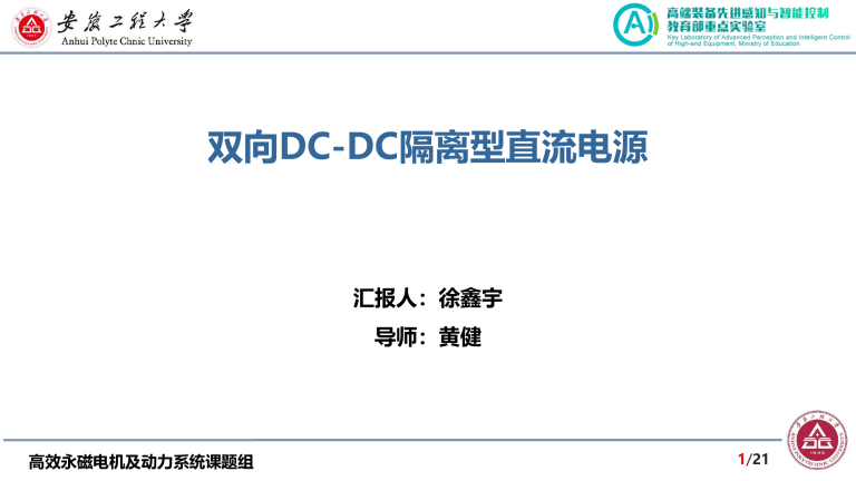 双向DC-DC隔离型直流电源 汇报人:徐鑫宇 导师:黄健 高效永磁电机及动力系统课题组 1/21 汇报内容 1 背景及意义 2 单相整流研究进展 3 交错并联buck研究进展 高效永磁电机及动力系统课题组 2/21 研究背景 开关电源适用于从低功率到高功率的各种设备,涵盖了消费电子、通信设备、计算机、工业自动化、电 动工具、医疗设备等各个行业。无论是在家庭、办公、工业还是医疗等领域,开关电源都发挥着至关重 要的作用。 高效永磁电机及动力系统课题组 3/21 研究背景 2016 年 中 国 电 源 市 场 规 模 首 次 突 破 2000亿大关,达2056亿元,同比增 长6.9%,2018年,中国电源市场的 规模达到2459亿元,同比增长5.95%。 高效永磁电机及动力系统课题组 工信部发布的《2020年4月电子信息制造 业运行情况》显示,2020年1-4月,电子 信息制造业营业收入与利润总额同比增长 15%,营业收入利润率为3.39%,营业成 本同比下降2.1%,2020年4月末,全行业 应收票据及应收账款同比增长7.9%。 4/21 研究背景 为了响应国家能源利用的数字化与智能化转型的号召,同时也得益于数字信号处理技术与半导 体技术的不断发展,更高性能的开关电源正成为市场未来追逐的目标 高效永磁电机及动力系统课题组 5/21 研究背景 双向电源主拓扑结构 + H1 M1 S1 L1 M3 N1 Q1 N3 Q2 Q3 Lr L3 R1 L4 R2 L5 R3 C3 C1 Lm L2 H2 C2 Cr S2 M2 M4 N2 N4 Q4 Q5 Q6 双向直流开关电源拓扑结构 电路由前级的PWM整流电路、LLC谐振变换电路以及后端的交错并联Buck电路构成,其可以实现对交 流电的整流及功率因数校正、电压等级变换以及最终输出的精确控制; 控制对象为与网侧相连的PWM整流电路以及输出端的交错并联Buck电路。 高效永磁电机及动力系统课题组 6/21 研究背景 双向电源控制策略研究 问题 解决方案 预期效果 双向直流开关电源 整流侧电能质量差、 抗干扰能力弱 图腾柱无桥PFC结合 自抗扰控制及网侧电 压前馈补偿技术 提升网侧功率因数,降 低电流谐波总畸变率, 增强系统抗干扰能力 双向直流开关电源 输出侧动态稳态性 能、带载能力差 交错并联Buck结合均 流控制技术 降低输出电压电流的纹 波率,并提高系统的整 体增益 高效永磁电机及动力系统课题组 7/21 汇报内容 1 背景及意义 2 单相整流研究进展 3 交错并联buck研究进展 高效永磁电机及动力系统课题组 8/21 单相整流研究研究 谐波产生的原因 uo ωt O ui io ωt O ui ii C uo R ii ωt O 经典波形 电流谐波 传统不可控整流电路 由于储能滤波电容的存在,只有在电容C充电期间才有电网的输入电流Ii,其它时间输入电流为零, 该电流为峰值很高的脉冲电流 由于输入电流存在波形畸变因而会导致网侧功率因数下降,并产生高次谐波分量污染电网 高效永磁电机及动力系统课题组 9/21 单相整流研究研究 APFC原理分析 Uo + ii ui VD L VT EMI 滤波 ud C uc iL ud PWM 的生成 采样及 滤波 I s* 乘法器 PI U c* 工作原理控制框图 通过升压斩波变换电路调节开关管开关的占空比,控制已整流后的电流,使之在对滤波电容充电 之前能与整流后的电压波形相同,从而避免形成电流脉冲,达到改善功率因数的目的 高效永磁电机及动力系统课题组 10/21 单相整流研究研究 峰值电流控制法 u VD L Uo + ii ui ud - VT C UC iL I s* ud ωt ui 乘法器 ui ii 采样及 滤波 PWM 的生成 R iL O ii 1/K ud i ωt O I s* PI 峰值电流控制法原理图 U c* 峰值电流控制方式波形图 开关导通时,iL从零逐渐开始上升;iL的峰值刚好等于指令电流给定值I*s。开关VT截止,电感电 流iL开始下降; 即开关VT导通时,电感电流上升;开关VT截止时,电感电流下降。电感电流iL的 峰值包络线就是I*s 。 高效永磁电机及动力系统课题组 11/21 单相整流研究研究 电流滞环控制法 + ii ui u VD L Uo iL ud VT C ud i I s* iL Uc ωt O - ui R 1/K ud 乘法器 采样及 滤波 比较器 I s* ii ui ii ωt O PI 电流滞环控制法原理图 U c* 电流滞环控制方式波形图 主电路的输出电压与给定基准电压值比较后,输入给PI调节器,PI调节器的输出和整流后的输入 电压标幺值相乘作为指令电流。与检测的实际电流做差,然后进行滞环调节。使电感电流跟随电 压变化,使电网侧达到单位功率因数 高效永磁电机及动力系统课题组 12/21 单相整流研究研究 平均电流控制法 L + ii ui u VD I s* Uo iL ud VT C ud i iL uc ωt O - ui R 1/K ud 乘法器 PWM 比较器 采样及 滤波 I s* ii ωt O PI 平均电流控制法原理图 ii ui U c* 平均电流控制方式波形图 平均电流控制法中指令电流的产生与峰值电流控制法、滞环电流控制法也一样,不同之处是实际 电流经电流误差放大器或动态补偿器代替电流比较器。输出的结果与锯齿波或三角波比较,产生 PWM波控制开关器件,达到稳定电压和控制输入电流与输入电压同相的目的。 高效永磁电机及动力系统课题组 13/21 汇报内容 1 背景及意义 2 单相整流研究进展 3 交错并联buck研究进展 高效永磁电机及动力系统课题组 14/21 交错并联buck研究 交错并联Buck变换器 高功率场景需求:5G基站/电动汽车充电功率突破3kW 传统单相Buck瓶颈:电感体积占比>40%,动态响应时间>200μs 交错并联优点:降低导通损耗,小电感提高瞬态响应速度,以较低开关频率实现高频率输出,低 纹波电流输出 高效永磁电机及动力系统课题组 15/21 交错并联buck研究 均流控制技术 输出阻抗法通过改变各相负载斜率特性,从而实现均流 有源均流法主要依赖于电流采样,进行处理后实现各
