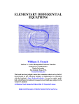 ELEMENTARY DIFFERENTIAL EQUATIONS William F. Trench Andrew G. Cowles Distinguished Professor Emeritus Department of Mathematics Trinity University San Antonio, Texas, USA wtrench@trinity.edu This book has been judged to meet the evaluation criteria set by the Editorial Board of the American Institute of Mathematics in connection with the Institute’s Open Textbook Initiative. It may be copied, modified, redistributed, translated, transported, and built upon subject to the Creative Commons Attribution-NonCommercial-ShareAlike 3.0 Unported License FREE DOWNLOAD: STUDENT SOLUTIONS MANUAL Free Edition 1.01 (December 2013) This book was published previously by Brooks/Cole Thomson Learning, 2001. This free edition is made available in the hope that it will be useful as a textbook or reference. Reproduction is permitted for any valid noncommercial educational, mathematical, or scientific purpose. However, charges for profit beyond reasonable printing costs are prohibited. TO BEVERLY Contents Chapter 1 Introduction 1 1.1 Applications Leading to Differential Equations 1.2 First Order Equations 1.3 Direction Fields for First Order Equations 5 16 Chapter 2 First Order Equations 30 2.1 Linear First Order Equations 2.2 Separable Equations 2.3 Existence and Uniqueness of Solutions of Nonlinear Equations 2.4 Transformation of Nonlinear Equations into Separable Equations 2.5 Exact Equations 2.6 Integrating Factors 30 45 55 63 73 83 Chapter 3 Numerical Methods 3.1 Euler’s Method 3.2 The Improved Euler Method and Related Methods 3.3 The Runge-Kutta Method 96 109 119 Chapter 4 Applications of First Order Equations1em 130 4.1 Growth and Decay 4.2 Cooling and Mixing 4.3 Elementary Mechanics 4.4 Autonomous Second Order Equations 4.5 Applications to Curves 130 140 151 162 179 Chapter 5 Linear Second Order Equations 5.1 Homogeneous Linear Equations 5.2 Constant Coefficient Homogeneous Equations 5.3 Nonhomgeneous Linear Equations 5.4 The Method of Undetermined Coefficients I iv 194 210 221 229 5.5 The Method of Undetermined Coefficients II 5.6 Reduction of Order 5.7 Variation of Parameters 238 248 255 Chapter 6 Applcations of Linear Second Order Equations 268 6.1 Spring Problems I 6.2 Spring Problems II 6.3 The RLC Circuit 6.4 Motion Under a Central Force 268 279 291 297 Chapter 7 Series Solutions of Linear Second Order Equations 7.1 Review of Power Series 7.2 Series Solutions Near an Ordinary Point I 7.3 Series Solutions Near an Ordinary Point II 7.4 Regular Singular Points Euler Equations 7.5 The Method of Frobenius I 7.6 The Method of Frobenius II 7.7 The Method of Frobenius III 307 320 335 343 348 365 379 Chapter 8 Laplace Transforms 8.1 Introduction to the Laplace Transform 8.2 The Inverse Laplace Transform 8.3 Solution of Initial Value Problems 8.4 The Unit Step Function 8.5 Constant Coefficient Equations with Piecewise Continuous Forcing Functions 8.6 Convolution 8.7 Constant Cofficient Equations with Impulses 8.8 A Brief Table of Laplace Transforms 394 406 414 421 431 441 453 Chapter 9 Linear Higher Order Equations 9.1 Introduction to Linear Higher Order Equations 9.2 Higher Order Constant Coefficient Homogeneous Equations 9.3 Undetermined Coefficients for Higher Order Equations 9.4 Variation of Parameters for Higher Order Equations 466 476 488 498 Chapter 10 Linear Systems of Differential Equations 10.1 Introduction to Systems of Differential Equations 10.2 Linear Systems of Differential Equations 10.3 Basic Theory of Homogeneous Linear Systems 10.4 Constant Coefficient Homogeneous Systems I 508 516 522 530 vi Contents 10.5 Constant Coefficient Homogeneous Systems II 10.6 Constant Coefficient Homogeneous Systems II 10.7 Variation of Parameters for Nonhomogeneous Linear Systems 543 557 570 Preface Elementary Differential Equations with Boundary Value Problems is written for students in science, engineering, and mathematics who have completed calculus through partial differentiation. If your syllabus includes Chapter 10 (Linear Systems of Differential Equations), your students should have some preparation in linear algebra. In writing this book I have been guided by the these principles: An elementary text should be written so the student can read it with comprehension without too much pain. I have tried to put myself in the student’s place, and have chosen to err on the side of too much detail rather than not enough. An elementary text can’t be better than its exercises. This text includes 1695 numbered exercises, many with several parts. They range in difficulty from routine to very challenging. An elementary text should be written in an informal but mathematically accurate way, illustrated by appropriate graphics. I have tried to formulate mathematical concepts succinctly in language that students can understand. I have minimized the number of explicitly stated theorems and definitions, preferring to deal with concepts in a more conversational way, copiously illustrated by 250 completely worked out examples. Where appropriate, concepts and results are depicted in 144 figures. Although I believe that the computer is an immensely valuable tool for learning, doing, and writing mathematics, the selection and treatment of topics in this text reflects my pedagogical orientation along traditional lines. However, I have incorporated what I believe to be the best use of modern technology, so you can select the level of technology that you want to include in your course. The text includes 336 exercises – identified by the symbols C and C/G – that call for graphics or computation and graphics. There are also 73 laboratory exercises – identified by L – that require extensive use of technology. In addition, several sections include informal advice on the use of technology. If you prefer not to emphasize technology, simply ignore these exercises and the advice. There are two schools of thought on whether techniques and applications should be treated together or separately. I have chosen to separate th