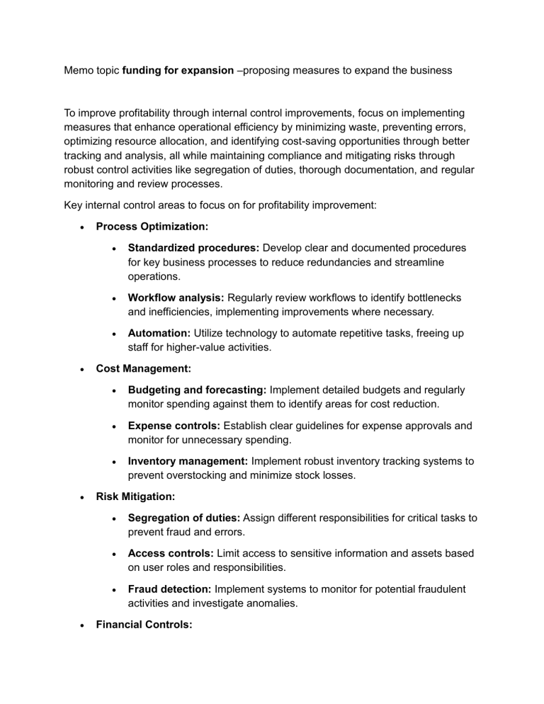 Memo topic funding for expansion –proposing measures to expand the business To improve profitability through internal control improvements, focus on implementing measures that enhance operational efficiency by minimizing waste, preventing errors, optimizing resource allocation, and identifying cost-saving opportunities through better tracking and analysis, all while maintaining compliance and mitigating risks through robust control activities like segregation of duties, thorough documentation, and regular monitoring and review processes. Key internal control areas to focus on for profitability improvement: Process Optimization: Standardized procedures: Develop clear and documented procedures for key business processes to reduce redundancies and streamline operations. Workflow analysis: Regularly review workflows to identify bottlenecks and inefficiencies, implementing improvements where necessary. Automation: Utilize technology to automate repetitive tasks, freeing up staff for higher-value activities. Cost Management: Budgeting and forecasting: Implement detailed budgets and regularly monitor spending against them to identify areas for cost reduction. Expense controls: Establish clear guidelines for expense approvals and monitor for unnecessary spending. Inventory management: Implement robust inventory tracking systems to prevent overstocking and minimize stock losses. Risk Mitigation: Segregation of duties: Assign different responsibilities for critical tasks to prevent fraud and errors. Access controls: Limit access to sensitive information and assets based on user roles and responsibilities. Fraud detection: Implement systems to monitor for potential fraudulent activities and investigate anomalies. Financial Controls: Reconciliations: Regularly reconcile bank statements and other financial records to identify discrepancies and prevent errors. Accurate recordkeeping: Ensure proper documentation and supporting evidence for all transactions. Internal auditing: Conduct periodic internal audits to assess the effectiveness of controls and identify areas for improvement. Employee Training and Awareness: Compliance training: Regularly train employees on relevant policies, procedures, and internal control guidelines. Ethical conduct: Promote a strong ethical culture within the organization to discourage fraudulent behavior. Benefits of improved internal controls for profitability: Reduced costs: By preventing errors, waste, and inefficiencies, internal controls can significantly lower operating expenses. Enhanced operational efficiency: Streamlined processes and clear procedures can lead to faster production cycles and improved productivity. Improved financial accuracy: Accurate financial reporting enables better decision-making and financial planning. Risk mitigation: Strong controls can help prevent fraud and minimize potential losses. Compliance assurance: Adherence to internal controls can help ensure compliance with relevant regulations.