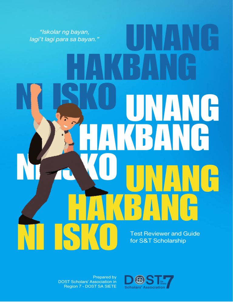 UNANG HAKBANG NI ISKO UNANG HAKBANG NI ISKO UNANG HAKBANG NI ISKO “Iskolar ng bayan, lagi’t lagi para sa bayan.” Test Reviewer and Guide for S&T Scholarship Prepared by DOST Scholars’ Association in Region 7 - DOST SA SIETE Test Reviewer and Guide for S&T Scholarship “Iskolar ng bayan, lagi’t lagi para sa bayan.” UNANG UNANG HAKBANG HAKBANG NI NIISKO ISKOUNANG UNANG HAKBANG HAKBANG NI ISKO UNANG NI ISKO HAKBANG UNANG NIHAKBANG ISKO NI ISKO Test Reviewer and Guide for S&T Scholarship Prepared by DOST Scholars’ Association in Region 7Prepared - DOST SA by SIETE DOST Scholars’ Association in Region 7 - DOST SA SIETE cvads.dostregion7@gmail.com /dostsaregion7 Message from DOST SA SIETE Greetings, future iskos and iskas! Taking your first step toward becoming a Department of Science and Technology (DOST) scholar begins here, with this reviewer in hand. As part of our mission at DOST SA SIETE, we are committed to guiding future scientists and innovators like you through the challenging yet rewarding path of the S&T Undergraduate Scholarship. This reviewer is a symbol of your dedication and ambition to excel in the field of science and technology. It’s the foundation for what lies ahead in your journey, where passion meets opportunity, and preparation leads to success. Embrace this chance, for every page you turn and every problem you solve brings you closer to the doors of countless possibilities in science and technology. The future of our nation’s progress lies in the hands of young scholars like you. So give it your all, and let this reviewer be the first of many milestones on your road to becoming a proud iskolar ng agham. Mga iskolar ng bayan, lagi't lagi para sa bayan! Authors Erika Niña S. Cotiangco Editor Yaghnna Ainein T. Yankin Co-Editor Contributors: Logical Reasoning Maria Khazandra C. Abonin English Maria Khazandra C. Abonin Science Erika Niña S. Cotiangco Dave Justine L. Bantilan John Matthieu M. Maghanoy Mechanical-Technical Yaghnna Ainein T. Yankin Mathematics Lee Lhouine Kaidz M. Lirazan II Izaak Tristan G. Cabigon Fredireck N. Benitez Tips Erika Niña S. Cotiangco Yaghnna Ainein T. Yankin Cover Design John Carlo Payawal Table of Contents DOST Scholars' Association in Region 7 DOST SA SIETE I. Knowing the DOST Undergraduate Scholarship Program II. REVIEW QUESTIONS III. 1 Logical Reasoning 4 English 5 Science 7 Mathematics 15 Mechanical-Technical 19 ANSWERS AND EXPLANATIONS Logical Reasoning 21 English 21 Science 22 Mathematics 38 Mechanical-Technical 49 IV. KEY REFERENCES 51 V. GENERAL TIPS 53 Tips in Taking the Exam Answer & Blank Sheets I. Knowing the DOST Undergraduate Scholarship Program What is the S&T Undergraduate Scholarships? The S&T Undergraduate Scholarships Program aims to stimulate and entice talented Filipino youths to pursue lifetime productive careers in science and technology and ensure a steady, adequate supply of qualified S&T human resources that can steer the country towards national progress. Types of S&T Undergraduate Scholarships: RA 7687 - also known as the “Science and Technology Scholarship Act of 1994”, provides for scholarships to talented and deserving students whose families’ socio-economic status does not exceed the set cut-off values of certain indicators. Qualifiers must pursue priority fields of study in the basic sciences, engineering, other applied sciences, and science and mathematics teaching. MERIT - formerly known as the NSDB or NSTA Scholarship under RA No. 2067, is awarded to students with high aptitude in science and mathematics, and are willing to pursue careers in the fields of science and technology. What are the benefits? Tuition and other school fees: Actual fees up to ₱40,000/AY Learning Materials and/or Connectivity Allowance: ₱10,000/AY Monthly Living Allowance: ₱8,000/month of the AY Clothing Allowance: ₱1,000 (1st Sem of 1st Year only) Transportation Allowance: 1 economy-class roundtrip fare (for those studying outside of home province) Group Accident and Health Insurance: Premium Thesis Allowance: ₱10,000 Graduation Allowance: ₱1,000 What are the qualified courses? see this link: https://www.facebook.com/share/p/6f5dzjzjTez38Fef/ 1 Who's eligible to apply? 1. Must be a natural-born Filipino citizen. 2. All graduating Grade 12 students in the school year or graduate of Grade 12 before the school year and did not enroll in college yet: • STEM STRAND - All students belonging to the STEM class. • NON-STEM STRAND - Must be in the top 5% of the graduating class. 3. Graduates of high school before the K-12 program who belong to the top 5% of the graduating class. 4. Must be of good moral character and in good health. 5. May have applied to the DOST-SEI Undergraduate Scholarship but did not qualify. 6. May have qualified for the DOST-SEI Undergraduate Scholarship but did not avail of the award. 7. Must not have earned any post-secondary (college or vocational) units. How to prepare for the exam? Review the subjects covered in the scholarship exam. Before answering any questions, read the exam instructions thoroughly. The test includes the following domains and discuss some topics: Part 1: Logical Reasoning (verbal and nonverbal reasoning) - Verbal Reasoning: tests your ability to understand, analyze and interpret information. It also measures your ability to extract meaning from complex information and to think logically and analytically. There are 5 items in this reviewer. - Nonverbal Reasoning: measure your abilities to visualize and transform images in your mind, recreate visual experiences and reasoning about shape, measurement, depiction and navigation; and mentally rotate and manipulate two and three dimensional spaces. There are 5 items in this reviewer. Part 2: English: apply the rules of the English language, specifically on grammar and syntax, vocabulary, and reading comprehension. There are 10 items in this reviewer. Science: consists of problem-items in Earth Science, Astro