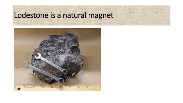 Lodestone is a natural magnet Bar Magnet and Horseshoe Magnet Magnetic Poles A pole is the part of a magnet where magnetic force is very strong. They are North and South poles The Law of Attraction and Repulsion Unlike poles attract while like poles repel. Note that repulsion is the sure test for the pole of a magnet Magnetic Field (Iron fillings experiment) This is the space around a magnet where magnetic force is felt. So a magnet can be defined as a material that creates a magnetic field. https://www.youtube.co m/watch?v=j8XNHlV6Qx g Magnetic Field Lines They show the direction of the magnetic field. The lines point out of the north and enter the south pole. The field is very strong where the lines are close. https://www.youtube.com/ watch?v=LNxGKKOKq_U Plotting Magnetic Field Lines The lines can be drawn using Iron filings or the Plotting compass https://www.youtube.c om/watch?v=VTYp52Ja YVA MAGNETISM Substances that show magnetic properties can be made as magnets. These are Iron, Cobalt and Nickel. They are metals. Steel is an alloy of CARBON and IRON which also shows magnetic properties The Earth As A Magnet The earth behaves as if it has a short magnet inside it, with the north pole of that magnet pointing south. Using Iron as ELECTROMAGNET Differences between Iron and steel • Iron is a soft metal, so it can be magnetized and demagnetized very easily. Therefore it forms temporary magnets e.g electromagnets. • Steel is hard metal, so it takes time to become magnetized but the moment it is , it doesn’t losses it magnetism easily. So it forms a permanent magnet. Induced Magnetism Magnetic Domains A magnet is divided into domains, with each domain containing dipoles. Ways of magnetizing and demagnetizing • Magnetizing 1. Electrical method(d.c) from a battery (best method) 2. Stroking method Single stroke and double stroke • Demagnetizing 1. Electrical method (A.c)alternating current (best method) 2. Hammering : Heat magnet red hot and hammer 3. Face the magnet in the West – East direction and hammer Making a Magnet by Stroking The Electromagnet Here a piece of iron is placed inside the coil. It is called the core of the electromagnet. When the device is switched on, the magnetism is very strong, producing poles at the ends. When it is switched off, all the magnetism is lost. Advantages of Using Iron as the Core Over Steel 1. The magnetism is stronger 2. When the current is switched off, all the magnetism is lost, but with steel, some magnetism is retained How to Increase the Strength of the Electromagnet 1. Increasing the number of windings (turns) of the coil 2. Increasing the current 3. Using soft iron as the core The Electric Bell This is a device which uses an electromagnet. When the switch is pushed, current passes through the coil and the electromagnet pulls the armature. Then the hammer strikes the gong and the sound is heard. The Magnetic Relay: Uses a small current in a circuit to control a large current in another circuit • Explanation • Three classes of magnetic materials are • (i) Diamagnetic : They have weak magnetic field which acts in opposite direction when placed in a stronger magnetic field. so the get repelled by the strong magnetic field. E.g Gold, copper, zinc • (ii) Paramagnetic : They have weak magnetic field which acts in the-same direction when placed in a stronger magnetic field. so the get attracted by the strong magnetic field. E.g Aluminum, oxygen , titanium, iron oxide. NOTE: Increase in temperature leads to a decrease in their magnetism. • (iii) Ferromagnetic: they are strongly magnetized in the direction of the magnetic field they are placed in. e.g : Iron, Nickel, Cobalt and Steel. NOTE: The magnetism decreases with an increase in temperature at a particular temperature called Curie temperature which is unique to each metal. Electricity and Magnetism Linked A wire which has current in it has a circular magnetic field around it If the wire is rolled into a coil and current flows, then it has a magnetic field like this: Fleming’s Left-Hand Rule The Electric (DC) motor (VERTICAL=Fmax) Fleming’s Left-Hand Rule: Used to Find the Direction of this Force The Electric (DC) Motor (Revision) The Electric (DC) Motor Made of: 1. Coil or armature 2. Magnetic field 3. Split rings (or commutator) 4. Carbon brush The split rings make continuous motion possible by constantly reversing the current every 180 degrees The Magnet and Coil Experiment https://www.youtube.com/watch? v=Hh58afwzHfA The AC Generator (or the Alternator) (Horizontal wire = Current max ) The Telephone Earpiece This is another device that uses the electromagnet Transformers A transformer is a device that changes the magnitude of an AC voltage by mutual induction. It has two coils called the primary and secondary, wound round a laminated soft-iron core. It is laminated to reduce heat losses due to eddy currents. Symbol of the Transformer Step-Up and Step-Down Transformers How it Works When an alternating emf is connected to the primary coil, alternatig/changing magnetic field is produced. This links the secondary coil through the soft iron core and cuts across the secondary coil to induce alternating output voltage Turns Ratio Formula Question A transformer is connected to a 250 V AC supply. The primary coil has 5000 turns and the secondary voltage is found to be 10 V. What is the number of turns in the secondary coil? The Efficiency of a Transformer In real situations, a transformer is not 100 % efficient. So the efficiency of a transformer is given as: power developed in the secondary E = power supplied to the primary x 100. So, Is x Vs E= Ip x V p x 100 Class Activity: Efficiency of a Transformer 1. A transformer supplies 12 V when connected to a 240 V mains. If this transformer takes 0.11 A from the mains when used to light a 12 V, 24 W lamp, find its efficiency. 2. A transformer is used to light a 40 W, 8 V lamp from a 240 V mains supply. Calculate the (i) turns ratio of