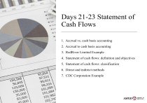 Days 21-23 Statement of Cash Flows 1. Accrual vs. cash basis accounting 2. Accrual to cash basis accounting 3. RedRiver Limited Example 4. Statement of cash flows: definition and objectives 5. Statement of cash flows: classification 6. Direct and indirect methods 7. CDC Corporation Example 1 Roadmap 1. Accrual vs. cash basis accounting 2. Accrual to cash basis accounting 3. RedRiver Limited Example 4. Statement of cash flows: definition and objectives 5. Statement of cash flows: classification 6. Direct and indirect methods 7. CDC Corporation Example 2 1. Accrual vs. Cash Basis Accounting Accrual Basis of Accounting Cash Basis of Accounting Revenue is recognized When earned (generally when a service is performed, or goods are delivered), regardless of whether cash has been received When cash is received Expense is recognized When incurred to generate revenue (generally when a service is used, or goods are consumed), regardless of whether cash has been paid When cash is paid 3 Roadmap 1. Accrual vs. cash basis accounting 2. Accrual to cash basis accounting 3. RedRiver Limited Example 4. Statement of cash flows: definition and objectives 5. Statement of cash flows: classification 6. Direct and indirect methods 7. CDC Corporation Example 4 2. Accrual to Cash Basis Accounting Cash item Item on accrual basis statement of income Associated statement of financial position item(s) Collections from customers Sales revenue Account receivable; Deferred revenue Collections from customers=Sales rev +/- change in Account receivable +/- change in Deferred Revenue What is the cash collected from customers if sales revenue is $5,000, Accounts receivable increased by $1000 and deferred revenue decreased by $500 ? 5 Accrual to Cash Basis Accounting Cash item Payments to suppliers Item on accrual basis statement of income Cost of goods sold Associated statement of financial position item(s) Inventory; Accounts payable Payments to suppliers= - COGS +/- change in inventory +/- change in accounts payable What is the cash paid to suppliers if the cost of goods sold is $4,000 and there Was a decrease of Inventory by $ 1200 and increase in A/P by $300 ? 6 Accrual to Cash Basis Accounting Cash item Item on accrual basis statement of income Associated statement of financial position item(s) Salaries paid Salaries expense Salaries payable Salaries paid= - Salaries expense +/- change in salary payable Calculate the salaries paid if salaries expense was $10,000 and there was a decrease in salaries payable by $ 1,000 ? 7 Accrual to Cash Basis Accounting Cash item Item on accrual basis statement of income Associated statement of financial position item(s) Payments to landlord Rent expense Prepaid rent; Rent payable Payments to landlord= - Rent expense +/- change in Prepaid rent +/- change in Rent payable Calculate the rent paid if the rent expense is $3,000 and the prepaid rent decreased by $1000 ? Accrual to Cash Basis Accounting Cash item Item on accrual basis statement of income Associated statement of financial position item(s) Collections from customers Sales revenue Account receivable; Deferred revenue Payments to suppliers Cost of goods sold Inventory; Accounts payable Salaries paid Salaries expense Salaries payable Payments to landlord Rent expense Prepaid rent; Rent payable 9 Accrual to Cash Basis Accounting Cash basis inflows and outflows can be derived from their accrual basis counterparts in the income statement, and their associated balance sheet accounts, according to the following formulae: Cash collection = Sales revenue from customers - Increase (+decrease) in Accounts receivable +increase (-decrease) in Deferred revenue Cash payment related to an expense = Expense item +increase (-decrease) in associated asset - Increase (+decrease) in associated liability 10 Roadmap 1. Accrual vs. cash basis accounting 2. Accrual to cash basis accounting 3. RedRiver Limited Example 4. Statement of cash flows: definition and objectives 5. Statement of cash flows: classification 6. Direct and indirect methods 7. CDC Corporation Example 11 3. RedRiver Limited Example Statement of Financial Position at December 31 Assets 2019 2018 Liabilities 2019 2018 Cash $24 $1 Def. Rev. $14 $19 A/R 67 50 A/P 25 18 Inventory 30 25 Sal. pay. 22 25 Ppd. rent 10 15 S/E 70 29 Total $131 $91 Total $131 $91 Statement of Income For the year ended December 31, 2019 Sales revenue Cost of goods sold Salaries expense Rent expense Net income $545 230 200 80 $35 12 RedRiver Limited Example Required: Determine the following amounts for the year ended December 31, 2019: Cash collected from customers Cash paid to suppliers (of inventory) Salaries paid to employees Cash paid for rent 13 Roadmap 1. Accrual vs. cash basis accounting 2. Accrual to cash basis accounting 3. RedRiver Limited Example 4. Statement of cash flows: definition and objectives 5. Statement of cash flows: classification 6. Direct and indirect methods 7. CDC Corporation Example 14 4. SCF: Definition and Objectives The Statement of Cash Flows shows the changes in Cash and Cash Equivalents arising from the operating, financing and investing activities of the enterprise. This information is useful for: understanding the effects of operating, financing and investing activities on cash and cash equivalents; assessing the liquidity and solvency; assessing the quality of earnings (how closely net income is associated with cash flow); and assessing the firm’s ability to generate cash from internal sources (to repay debt, to reinvest, to pay dividends). 15 Cash and Cash Equivalent Cash is a medium of exchange which a bank will accept for deposit (e. g., currency, deposits in bank account). Cash-equivalent assets are very secure (value is certain, i.e. fixed rate of return) liquid (easily convertible to cash) investments that have a short maturity (typically 90 days or less), such as Government of Canada treasury bills or Guaranteed Investment Certificates (GICs) 16 Cash and Other Items Asset