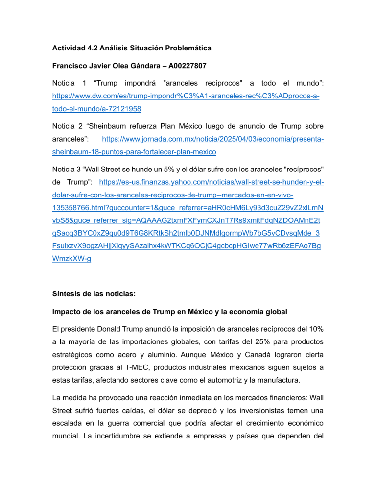 Actividad 4.2 Análisis Situación Problemática Francisco Javier Olea Gándara – A00227807 Noticia 1 “Trump impondrá "aranceles recíprocos" a todo el mundo”: https://www.dw.com/es/trump-impondr%C3%A1-aranceles-rec%C3%ADprocos-atodo-el-mundo/a-72121958 Noticia 2 “Sheinbaum refuerza Plan México luego de anuncio de Trump sobre aranceles”: https://www.jornada.com.mx/noticia/2025/04/03/economia/presenta- sheinbaum-18-puntos-para-fortalecer-plan-mexico Noticia 3 “Wall Street se hunde un 5% y el dólar sufre con los aranceles "recíprocos" de Trump”: https://es-us.finanzas.yahoo.com/noticias/wall-street-se-hunden-y-eldolar-sufre-con-los-aranceles-reciprocos-de-trump--mercados-en-en-vivo135358766.html?guccounter=1&guce_referrer=aHR0cHM6Ly93d3cuZ29vZ2xlLmN vbS8&guce_referrer_sig=AQAAAG2txmFXFymCXJnT7Rs9xmitFdqNZDOAMnE2t qSaoq3BYC0xZ9qu0d9T6G8KRtkSh2tmlb0DJNMdlgormpWb7bG5vCDvsqMde_3 FsulxzvX9ogzAHjjXiqyySAzaihx4kWTKCq6OCjQ4gcbcpHGIwe77wRb6zEFAo7Bg WmzkXW-g Síntesis de las noticias: Impacto de los aranceles de Trump en México y la economía global El presidente Donald Trump anunció la imposición de aranceles recíprocos del 10% a la mayoría de las importaciones globales, con tarifas del 25% para productos estratégicos como acero y aluminio. Aunque México y Canadá lograron cierta protección gracias al T-MEC, productos industriales mexicanos siguen sujetos a estas tarifas, afectando sectores clave como el automotriz y la manufactura. La medida ha provocado una reacción inmediata en los mercados financieros: Wall Street sufrió fuertes caídas, el dólar se depreció y los inversionistas temen una escalada en la guerra comercial que podría afectar el crecimiento económico mundial. La incertidumbre se extiende a empresas y países que dependen del comercio con EE.UU., generando volatilidad en las bolsas y presionando a los gobiernos a responder. En este contexto, la presidenta de México, Claudia Sheinbaum, ha reforzado su estrategia económica con un plan de 18 puntos que busca mitigar los efectos de la política arancelaria de Trump. Su plan incluye el fortalecimiento de la industria nacional, la reducción de importaciones asiáticas y la atracción de inversiones extranjeras, con el objetivo de generar 1.5 millones de empleos y mejorar la autosuficiencia económica del país. México enfrenta un panorama desafiante: mientras la imposición de aranceles amenaza su competitividad exportadora, el gobierno apuesta por una reestructuración económica interna para reducir su dependencia del comercio con EE.UU. y aprovechar la coyuntura global para fortalecer su producción y mercado interno. Propiedades emergentes: • Redistribución del comercio global • Estructura del empleo en México • Patrón de inversión en Latinoamérica • Relación de México con Estados Unidos y el mundo • Cambios en el modelo de producción en México Niveles y flujos: Tabla en la siguiente página NIVELES FLUJOS Empleos generados por el sector • exportador Nuevos empleos diarios generados por exportaciones. (Número de empleos) • Empleos diarios perdidos por caídas de exportaciones. Producción manufacturera en México • Unidades producidas por día (Unidades producidas) • Unidades regresadas por día • Reducción en producción diaria por encarecimiento de insumos importados. Exportaciones de México a Estados • Unidos (Millones de dólares) Millones de dólares exportados diariamente • Retiros de inversiones en millones de dólares por día Inversión extranjera en México • (Millones de dólares) Inversiones por día en millones de dólares • Retiros de inversión en millones de dólares por día Tasa de aranceles en México • (porcentaje) Inflación diario en tasa de aranceles en México (puntos de • inflación) Demanda Cambio Cambio diario en puntos de inflación en México interna de productos • manufacturados (unidades) Aumento de demanda interna por sustitución de importaciones (unidades/mes) • Caída de demanda interna por aumento (unidades/mes) de precios Diagrama inicial: Aprendizajes: El día de hoy aprendí sobre el pensamiento sistemático y cómo es que puedo relacionar niveles y flujos, además de que aprendí a identificar que en todos los sistemas existen estos niveles, y a identificar sus flujos correctamente con todas las especificaciones que tienen (mismas unidades y unidades por tiempo). También pude entender mejor cómo se relaciona un nivel con otro en un sistema, y que todos los niveles tienen relación entre sí. Es importante siempre consultar estos temas con expertos en el sistema que se esté analizando para entender mejor el funcionamiento.
