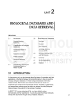 Unit 2 Biological Databases and Data Retrieval UNIT 2 BIOLOGICAL DATABASES AND DATA RETRIEVAL Structure 2.1 Introduction 2.4 Expected Learning Outcomes 2.2 PubChem Drugbank Classification of Biological Databases ZINC Database Classification Based on Source Cambridge Structure Database (CSD) Nucleotide Databases Protein Database Structural Databases CATH 2.3 Small Molecular Databases 2.5 Structure Viewing tools and File Formats 2.6 Summary 2.7 Terminal Questions 2.8 Answers Classification of Biological Databases Based on Nature of Data 2.1 INTRODUCTION In the previous unit, you have learned about the basics of computers and their studying biological databases. In these biological databases information related to DNA, RNA, Protein, and other biomolecules are stored in a systematic way inside servers named Data servers. Scientists, academicians, and researchers working across the globe can retrieve this data (Biological Data) whenever they need it for the purpose of analysis. In BBCCT-101 course molecules of life, you have studied various biomolecules and their significance. You are also aware that these molecules interact with each other through various metabolic reactions. 47 Bioinformatics Skill Enhancement Course BBCS-185 Some important characteristic features of biological databases include: 1. They can store data in electronic form in various formats. 2. Each entry in the database would be assigned a unique number or ID. It cannot be repeated in other terms non-redundancy. 3. Data sharing The data can be downloaded from various websites related to biological databases or FTP (File transfer protocol). 4. They are well structured, searchable, and also information is updated periodically as per publications/innovations in the scientific world. 5. The data also refers to unique IDs in research publications/books. This can be called a cross-reference. Expected Learning Outcomes After studying this unit, you should be able to: define biological databases; classify of biological databases; enlist application of biological databases in research and data retrieval through web links; describe chemical, biological and structural databases; and explain the availability of online visualization tools and offline . 2.2 CLASSIFICATION OF BIOLOGICAL DATABASES In unit-11 of BBCCT-105 (Proteins) course you came across some basic concepts of biological databases, hence you are advised to recall those concepts before proceeding further in this unit. The classification of biological databases is very simple and is based on the source and nature of data collection. 2.2.1 Classification Based on Source 48 1. Primary databases: These databases are constructed based on data collected from laboratory experiments. After experiments the data will be validated and analyzed before uploading in the biological databases and it is very crucial step in the data collection. They are classified based on the type of biological molecules like nucleic acid databases (GenBank, EMBL, DDBJ, NDB), protein databases (PIR, Swiss-Prot, TrEMBL, PDB), metabolic pathway database (KEGG, EcoCyc, and MetaCyc) and small molecule databases (PubChem, Drug Bank, ZINC, CSD). 2. Secondary Databases: These databases are constructed based on primary biological databases with additional information. Secondary databases comprise data derived from the results of analyzing primary data available on the primary databases. They are often referred to as curated databases, but this is a bit of a misnomer Unit 2 Biological Databases and Data Retrieval because primary databases are also curated to ensure that the data in them is consistent and accurate. Secondary databases often draw upon information from numerous sources, including other databases (primary and secondary), controlled vocabulary, and scientific literature. They are highly curated and often use a complex combination of computational algorithms and manual analysis and interpretation to derive new knowledge from published data. library over the past decade or so, providing a wealth of (often daunting) information on just about any gene or gene product that has been investigated by the research community. The potential for mining this information to make new discoveries is vast. Table 2.1: Differences between primary and secondary databases (Source:https://www.ebi.ac.uk/) Primary database Synonyms Archival database Secondary Database Curated database; knowledgebase Results of analysis, Source of Direct submission of experimentally- data derived data from researchers literature research and interpretation, often of data in primary databases Inter Pro (protein families, motifs and Examples ENA, GenBank and DDBJ (nucleotide sequence) Array domains) UniProt Knowledgebase (sequen Express and GEO (functional ce and functional genomics data) Protein Data Bank (PDB; coordinates of three- information on proteins) Ensembl (variat dimensional macromolecular structures) ion, function, regulation and more layered onto whole genome sequences) Upto now you have studied about types of biological databases based on sources, now let us know about nucleotide databases. 2.2.2 Nucleotide Databases It is well known that DNA and RNA are major nucleic acids. You have studied the structure of these nucleic acids in Unit 13&14 of BBCCT-101). Each protein/enzyme coded by a specific gene/genes intern itself is a DNA sequence. If all the gene coding sequences are stored in a database i.e, called a nucleotide database. These databases are repositories of the store and 49 BBCS-185 Bioinformatics Skill Enhancement Course retrieve data in terms of nucleotides of various genomes (set of chromosomes of an organism). Let us see some of the examples of these nucleotide databases: Gen Bank It is an integral part of the main biological database, i.e., NCBI (National Center for Biotechnology. It has a tool called Entrez, which helps to retrieve data from Genbank. EMBL European Molecular Biology Laboratory is available at European B
