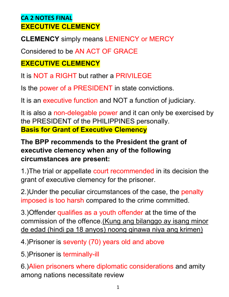 CA 2 NOTES FINAL EXECUTIVE CLEMENCY CLEMENCY simply means LENIENCY or MERCY Considered to be AN ACT OF GRACE EXECUTIVE CLEMENCY It is NOT a RIGHT but rather a PRIVILEGE Is the power of a PRESIDENT in state convictions. It is an executive function and NOT a function of judiciary. It is also a non-delegable power and it can only be exercised by the PRESIDENT of the PHILIPPINES personally. Basis for Grant of Executive Clemency The BPP recommends to the President the grant of executive clemency when any of the following circumstances are present: 1.)The trial or appellate court recommended in its decision the grant of executive clemency for the prisoner. 2.)Under the peculiar circumstances of the case, the penalty imposed is too harsh compared to the crime committed. 3.)Offender qualifies as a youth offender at the time of the commission of the offence.(Kung ang bilanggo ay isang minor de edad (hindi pa 18 anyos) noong ginawa niya ang krimen) 4.)Prisoner is seventy (70) years old and above 5.)Prisoner is terminally-ill 6.)Alien prisoners where diplomatic considerations and amity among nations necessitate review 1 7.)Other similar or analogous circumstances whenever the interest of justice will be served thereby. (Kung may ibang mga sitwasyon na kapareho o katulad ng mga nabanggit at magiging makatarungan ang pagbibigay ng clemency, - pag dili ka pasok sa number 7 pwede dili ka eh recommend sa executive clemency) Applications for Executive Clemency will not be favourably Acted Upon by The Board of Pardons and Parole when: 1. Convicted of evasion of service of sentence; 2. Who are habitual delinquents or recidivists; (recidivists naka commit ka ng same title sa revised penal code for example crime against property, crime against person. Habitual delinquents – nakacommit ka ng 3 or more na pasok ang crime na less and serious Physical injury, Robbery, Theft, Estafa, Falsification) 3. Convicted of kidnapping for ransom; 4. Convicted of violation of the Dangerous Drugs Act of 1972 and the Comprehensive Dangerous Drugs Act of 2002; 5. Convicted of offences committed under the influence of drugs 6. Those release from prison may constitute a danger to society. PARDON is a form of executive clemency granted by the president of the Philippines as a privilege extended to a convict as a discretionary act of grace. Neither 2 the legislative nor the judiciary branch of government has the power to set conditions or establish procedures for the exercise of the Presidential prerogative. (Hindi maaaring makialam ang Kongreso (Legislative) o Korte Judiciary) sa kung paano ito ipagkakaloob o kung anong kondisyon ang maaaring ilagay dito dahil prerogative act ito ng Presidente di sila pwedeng makialam.) TWO KINDS OF PARDON 1. Absolute pardon 2. Conditional Pardon Limitations on the Pardoning Power * Pardon cannot be extended to cases of impeachment. * No pardon may be granted in violation of any election law without favorable recommendations by the Commission onElection. * It may only be granted by the President after convicted. Absolute Pardon It is given without any condition attached to it. Its grants carries with total extinction of criminal liability and designed for the following purposes: * To do away with miscarriage of justice * To restore full political and civil rights of persons who have already served their sentence. * To keep abreast with current philosophy in the administration of the criminal justice system. 3 Minimum Requirements for the Petition of Pardon For Absolute Pardon: * Ten (10) years must have elapsed from the date of release of the petitioner from confinement or; * Five (5) years from the date of expiration of his maximum sentence, whichever is more beneficial to him. However, the Board may consider a petition for absolute pardon even before the grant of final release and discharged under the provisions of sec 6, Act no. 4103 as amended when the petitioner: - Is seeking an appointive/elective public position or reinstatement in the government service; - Needs medical treatment abroad which is not available locally; - Will take any government examination Conditions of Pardon * The pardonee should live in his designated residence and shall not change his residence without obtaining consent from the board. * In cases of temporary need to leave the pardonee residence, no permission is required but the whereabouts should be given to the parole/ pardon officer. (Kapag kailangang lumabas pansamantala, hindi na kailangan ng permiso, pero dapat ipaalam sa parole/pardon officer kung saan pupunta.) * The pardonee shall not indulge in any injurious or vicious habits and shall avoid persons and places of disreputable character.* That the pardonee shall not commit any crime. 4 The petition for absolute pardon shall be accompanied by the following requirements: 1.) Affidavits of at least two (2) responsible members of the community where the petitioner resides. The affidavits shall, among others, state that the petitioner has conducted himself a moral and law-abiding manner since his release from prison and shall indicate the petitioner's occupation and the community service he has rendered, if any, and 2.) The clearances from the police, courts and prosecutor office where the petitioner resides. - (Karaniwan, ang absolute pardon ay ibinibigay sa mga taong nakalaya na, halimbawa: Mga nakalaya dahil sa parole, Sa conditional pardon) EXAMPLEOF ABSOLUTE PARDON “President Duterte’s decision exempts Joseph Pemberton from serving the remaining time of his punishment for killing a Filipino citizen while on active duty in the Philippines, despite his testimony of admission and convincing evidence of his guilt beyond reasonable doubt.” Conditional Pardon • Refers to the exemption of an individual, within certain limits or conditions; from the punishment that the law inflicts for the offense he has committed resulting in the partial extinction of his criminal liability. • It is also granted by the 