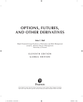OPTIONS, FUTURES, AND OTHER DERIVATIVES John C. Hull Maple Financial Group Professor of Derivatives and Risk Management Joseph L. Rotman School of Management University of Toronto ELEVENTH EDITION GLOBAL EDITION Harlow, England • London • New York • Boston • San Francisco • Toronto • Sydney • Dubai • Singapore • Hong Kong Tokyo • Seoul • Taipei • New Delhi • Cape Town • São Paulo • Mexico City • Madrid • Amsterdam • Munich • Paris • Milan A01_HULL0654_11_GE_FM.indd 1 03/05/2021 14:52 Please contact https://support.pearson.com/getsupport/s/contactsupport with any queries on this content. Cover Image: Dmytro Falkowskyi / Shutterstock Microsoft and/or its respective suppliers make no representations about the suitability of the information contained in the documents and related graphics published as part of the services for any purpose. All such documents and related graphics are provided “as is” without warranty of any kind. Microsoft and/or its respective suppliers hereby disclaim all warranties and conditions with regard to this information, including all warranties and conditions of merchantability, whether express, implied or statutory, fitness for a particular purpose, title, and non-infringement. In no event shall Microsoft and/or its respective suppliers be liable for any special, indirect, or consequential damages or any damages whatsoever resulting from loss of use, data, or profits, whether in an action of contract, negligence, or other tortious action, arising out of or in connection with the use or performance of information available from the services. The documents and related graphics contained herein could include technical inaccuracies or typographical errors. Changes are periodically added to the information herein. Microsoft and/or its respective suppliers may make improvements and/ or changes in the product(s) and/or the program(s) described herein at any time. Partial screen shots may be viewed in full within the software version specified. Microsoft® and Windows® are registered trademarks of the Microsoft Corporation in the U.S.A. and other countries. This book is not sponsored or endorsed by or affiliated with the Microsoft Corporation. Acknowledgments of third-party content appear on the appropriate page within the text. Pearson Education Limited KAO Two KAO Park Hockham Way Harlow Essex CM17 9SR United Kingdom and Associated Companies throughout the world Visit us on the World Wide Web at: www.pearsonglobaleditions.com © Pearson Education Limited 2022 The rights of John C. Hull, to be identified as the author of this work, has been asserted by them in accordance with the Copyright, Designs and Patents Act 1988. Authorized adaptation from the United States edition, entitled Options, Futures, and Other Derivatives, 11th Edition, ISBN 978-0-13-693997-9 by John C. Hull, published by Pearson Education © 2022. All rights reserved. No part of this publication may be reproduced, stored in a retrieval system, or transmitted in any form or by any means, electronic, mechanical, photocopying, recording or otherwise, without either the prior written permission of the publisher or a license permitting restricted copying in the United Kingdom issued by the Copyright Licensing Agency Ltd, Saffron House, 6–10 Kirby Street, London EC1N 8TS. All trademarks used herein are the property of their respective owners. The use of any trademark in this text does not vest in the author or publisher any trademark ownership rights in such trademarks, nor does the use of such trademarks imply any affiliation with or endorsement of this book by such owners. For information regarding permissions, request forms, and the appropriate contacts within the Pearson Education Global Rights and Permissions department, please visit www.pearsoned.com/permissions/. This eBook is a standalone product and may or may not include all assets that were part of the print version. It also does not provide access to other Pearson digital products like MyLab and Mastering. The publisher reserves the right to remove any material in this eBook at any time. ISBN 10: 1-292-41065-5 ISBN 13: 978-1-292-41065-4 eBook ISBN 13: 978-1-292-41062-3 British Library Cataloguing-in-Publication Data A catalogue record for this book is available from the British Library Typeset in Times NR MT Pro by Integra Software Services To Michelle A01_HULL0654_11_GE_FM.indd 3 03/05/2021 14:52 CONTENTS IN BRIEF List of business snapshots ...................................................................................................15 List of technical notes .........................................................................................................16 Preface ...................................................................................................................................17 1. Introduction ..........................................................................................................................23 2. Futures markets and central counterparties ....................................................................46 3. Hedging strategies using futures .......................................................................................70 4. Interest rates .........................................................................................................................98 5. Determination of forward and futures prices ................................................................124 6. Interest rate futures ...........................................................................................................152 7. Swaps ...................................................................................................................................172 8. Securitization and the financial crisis of 2007–8 ...........................................................201 9. XVAs ..................................................................