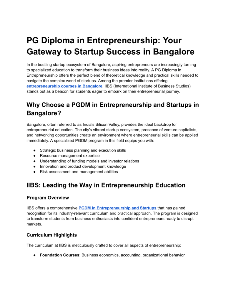 PG Diploma in Entrepreneurship: Your Gateway to Startup Success in Bangalore In the bustling startup ecosystem of Bangalore, aspiring entrepreneurs are increasingly turning to specialized education to transform their business ideas into reality. A PG Diploma in Entrepreneurship offers the perfect blend of theoretical knowledge and practical skills needed to navigate the complex world of startups. Among the premier institutions offering entrepreneurship courses in Bangalore, IIBS (International Institute of Business Studies) stands out as a beacon for students eager to embark on their entrepreneurial journey. Why Choose a PGDM in Entrepreneurship and Startups in Bangalore? Bangalore, often referred to as India's Silicon Valley, provides the ideal backdrop for entrepreneurial education. The city's vibrant startup ecosystem, presence of venture capitalists, and networking opportunities create an environment where entrepreneurial skills can be applied immediately. A specialized PGDM program in this field equips you with: ● ● ● ● ● Strategic business planning and execution skills Resource management expertise Understanding of funding models and investor relations Innovation and product development knowledge Risk assessment and management abilities IIBS: Leading the Way in Entrepreneurship Education Program Overview IIBS offers a comprehensive PGDM in Entrepreneurship and Startups that has gained recognition for its industry-relevant curriculum and practical approach. The program is designed to transform students from business enthusiasts into confident entrepreneurs ready to disrupt markets. Curriculum Highlights The curriculum at IIBS is meticulously crafted to cover all aspects of entrepreneurship: ● Foundation Courses: Business economics, accounting, organizational behavior ● Core Entrepreneurship Modules: Business model canvas, lean startup methodology, MVP development ● Finance for Entrepreneurs: Fundraising strategies, valuation methods, financial projections ● Marketing for Startups: Digital marketing, growth hacking, customer acquisition strategies ● Legal Aspects: Company registration, intellectual property rights, compliance frameworks ● Capstone Project: Developing and pitching a complete business plan to actual investors Admission Requirements To join the prestigious PGDM program at IIBS, prospective students need to meet the following criteria: ● ● ● ● Bachelor's degree with a minimum of 50% aggregate marks from a recognized university Valid score in entrance exams like CAT/MAT/XAT/CMAT/GMAT Performance in the personal interview and group discussion rounds Statement of purpose demonstrating entrepreneurial mindset Fee Structure The investment for IIBS's PGDM in Entrepreneurship ranges from ₹5-7 lakhs for the entire program duration, with various scholarship opportunities available for deserving candidates. The institute also facilitates education loans through partnerships with leading banks. Infrastructure and Resources IIBS provides state-of-the-art facilities to nurture entrepreneurial talent: ● ● ● ● ● Dedicated incubation center for student startups Prototyping lab with 3D printers and other tools Co-working spaces designed for collaboration Resource library with access to global business databases Conference rooms for investor meetings and pitches Industry Connections and Mentorship What truly sets IIBS apart is its robust network of industry connections. The institute regularly hosts: ● Startup founder speaker series ● Mentorship sessions with successful entrepreneurs ● Networking events with angel investors and VCs ● Industry-sponsored hackathons and ideathons Other Notable Entrepreneurship Courses in Bangalore While IIBS leads the pack, there are other reputable institutions offering entrepreneurship education in Bangalore: IFIM Business School IFIM offers a PGDM with specialization in entrepreneurship that focuses on developing entrepreneurial leadership. Their program includes: ● ● ● ● Entrepreneurial finance and funding Family business management Social entrepreneurship modules Six-month internship with startups Admission Requirements: Bachelor's degree with 50% marks, CAT/MAT/XAT scores Fee Structure: Approximately ₹8-10 lakhs for the program ISME (International School of Management Excellence) ISME's entrepreneurship program emphasizes practical learning through: ● ● ● ● Business simulation exercises Startup immersion program Entrepreneurship lab activities Venture capital pitching sessions Admission Requirements: Bachelor's degree with 55% marks, entrance test scores Fee Structure: Around ₹6-8 lakhs for the complete program Career Prospects After PGDM in Entrepreneurship Graduates of entrepreneurship programs in Bangalore typically pursue one of these paths: 1. Launching Their Own Ventures: Many graduates immediately begin working on their business ideas with the advantage of structured knowledge and networking connections. 2. Joining Startup Teams: Some choose to gain experience by joining early-stage startups in product management, business development, or operations roles. 3. Corporate Innovation Roles: Large companies increasingly value entrepreneurial mindsets for their innovation departments and intrapreneurship initiatives. 4. Consulting: Entrepreneurship graduates often excel as business consultants, particularly for startups and SMEs. 5. Investment Analysis: Some work with venture capital firms or angel investment networks to identify promising startups. Why IIBS Stands Out Among Entrepreneurship Courses in Bangalore IIBS has consistently produced successful entrepreneurs who attribute their achievements to the institute's unique approach: Success Stories ● Several IIBS alumni have secured funding for their startups within a year of graduation ● The institute's startup incubator has nurtured over 30 successful businesses in the last five years ● Multiple student ventures have been 