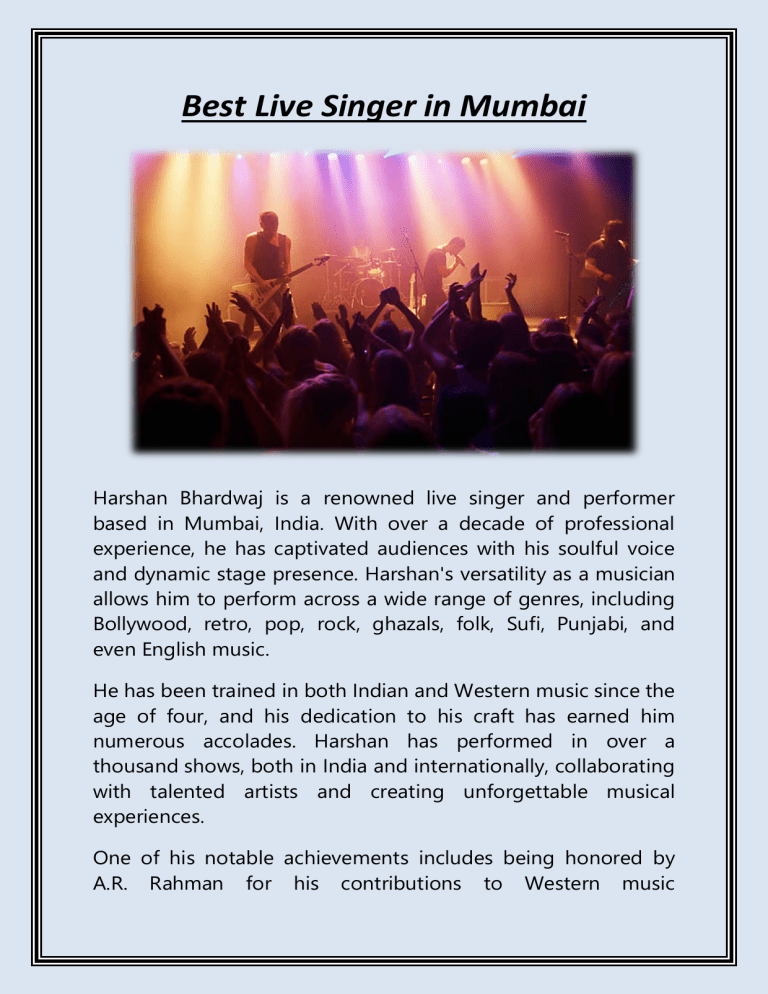 Best Live Singer in Mumbai Harshan Bhardwaj is a renowned live singer and performer based in Mumbai, India. With over a decade of professional experience, he has captivated audiences with his soulful voice and dynamic stage presence. Harshan's versatility as a musician allows him to perform across a wide range of genres, including Bollywood, retro, pop, rock, ghazals, folk, Sufi, Punjabi, and even English music. He has been trained in both Indian and Western music since the age of four, and his dedication to his craft has earned him numerous accolades. Harshan has performed in over a thousand shows, both in India and internationally, collaborating with talented artists and creating unforgettable musical experiences. One of his notable achievements includes being honored by A.R. Rahman for his contributions to Western music developments. He is also a Guinness World Record holder for being part of the largest cinematic music band for the Amazon Prime series "The Forgotten Army". Harshan's performances are known for their energy and ability to engage the audience. Whether it's a corporate event, wedding, house party, or concert, he tailors his music to suit the occasion, making every event memorable. His professionalism and passion for music have made him a sought-after artist in the live music scene. If you're in Mumbai and looking for a live singer who can bring magic to your event, Harshan Bhardwaj is an excellent choice. You can learn more about him and his performances on his official website.