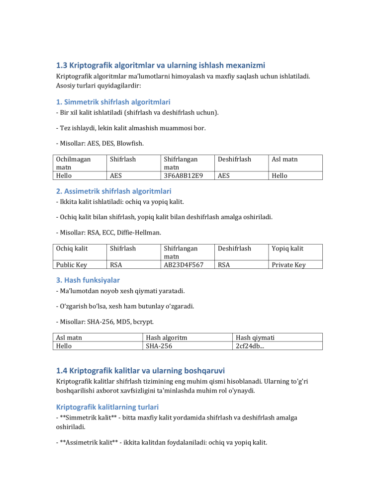 1.3 Kriptografik algoritmlar va ularning ishlash mexanizmi Kriptografik algoritmlar ma’lumotlarni himoyalash va maxfiy saqlash uchun ishlatiladi. Asosiy turlari quyidagilardir: 1. Simmetrik shifrlash algoritmlari - Bir xil kalit ishlatiladi (shifrlash va deshifrlash uchun). - Tez ishlaydi, lekin kalit almashish muammosi bor. - Misollar: AES, DES, Blowfish. Ochilmagan matn Hello Shifrlash Shifrlangan matn 3F6A8B12E9 AES Deshifrlash Asl matn AES Hello 2. Assimetrik shifrlash algoritmlari - Ikkita kalit ishlatiladi: ochiq va yopiq kalit. - Ochiq kalit bilan shifrlash, yopiq kalit bilan deshifrlash amalga oshiriladi. - Misollar: RSA, ECC, Diffie-Hellman. Ochiq kalit Shifrlash Public Key RSA Shifrlangan matn AB23D4F567 Deshifrlash Yopiq kalit RSA Private Key 3. Hash funksiyalar - Ma’lumotdan noyob xesh qiymati yaratadi. - O‘zgarish bo‘lsa, xesh ham butunlay o‘zgaradi. - Misollar: SHA-256, MD5, bcrypt. Asl matn Hello Hash algoritm SHA-256 Hash qiymati 2cf24db... 1.4 Kriptografik kalitlar va ularning boshqaruvi Kriptografik kalitlar shifrlash tizimining eng muhim qismi hisoblanadi. Ularning to'g'ri boshqarilishi axborot xavfsizligini ta'minlashda muhim rol o'ynaydi. Kriptografik kalitlarning turlari - **Simmetrik kalit** - bitta maxfiy kalit yordamida shifrlash va deshifrlash amalga oshiriladi. - **Assimetrik kalit** - ikkita kalitdan foydalaniladi: ochiq va yopiq kalit. Kriptografik kalitlarni boshqarish usullari Kalit turi Simmetrik Boshqarish usuli Maxfiy almashish Afzalliklari Tezkor ishlash Kamchiliklari Kalit almashish muammosi Assimetrik Sertifikat orqali Yaxshi xavfsizlik Sekin ishlash Kalitlarni to'g'ri saqlash va boshqarish uchun quyidagi choralar ko'riladi: - **Kalitlarni xavfsiz saqlash** (HSM - Hardware Security Module ishlatish); - **Kalitlarning muddati tugagach, almashtirish**; - **Kalitlarni yetkazish vaqtida shifrlash va autentifikatsiya qilish**.
