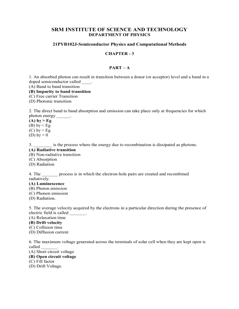 SRM INSTITUTE OF SCIENCE AND TECHNOLOGY DEPARTMENT OF PHYSICS 21PYB102J-Semiconductor Physics and Computational Methods CHAPTER - 3 PART – A 1. An absorbed photon can result in transition between a donor (or acceptor) level and a band in a doped semiconductor called ____. (A) Band to band transition (B) Impurity to band transition (C) Free carrier Transition (D) Photonic transition 2. The direct band to band absorption and emission can take place only at frequencies for which photon energy ______. (A) hγ > Eg (B) hγ < Eg (C) hγ = Eg (D) hγ = 0 3. ________ is the process where the energy due to recombination is dissipated as photons. (A) Radiative transition (B) Non-radiative transition (C) Absorption (D) Radiation 4. The _______ process is in which the electron-hole pairs are created and recombined radiatively. (A) Luminescence (B) Photon emission (C) Phonon emission (D) Radiation. 5. The average velocity acquired by the electrons in a particular direction during the presence of electric field is called _______. (A) Relaxation time (B) Drift velocity (C) Collision time (D) Diffusion current 6. The maximum voltage generated across the terminals of solar cell when they are kept open is called _______. (A) Short circuit voltage (B) Open circuit voltage (C) Fill factor (D) Drift Voltage. 7. The photons of energy value ____ that of the band gap values do not get absorbed in photovoltaic cell. (A) Greater than (B) Less than (C) Nearly equal than (D) Zero 8. An absorbed photon can result in upward transition of electron from valence band to conduction band is called _______. (A) Band to band transition (B) Impurity to band transition (C) Free carrier Transition (D) Photonic transition 9. The direct band to band absorption and emission can take place only at wave length for which photon energy ________. (A) λg = λ (B) λg < λ (C) λg > λ (D) λg = 0 10. _____ is the process where the excess energy due to recombination is usually imported to phonons and dissipated as heat. (A) Radiative transition (B) Non-radiative transition (C) absorption (D) Radiation. 11. The radiative recombination of electron-hole pair created by injection of photons is called ________. (A) Photoluminescence (B) Photon emission (C) Phonon emission (D) Radiation 12. The maximum current flows in solar cell when its P-side & N-side terminal are shorted, such a current is called _____. (A) Drift current (B) Diffuse current (C) Short-circuit current (D) Alternative current 13. _____ is the process of radiative recombination of electron–hole pairs created by electron bombardment. (A) Photoluminescence (B) photon emission (C) Phonon emission (D) Cathodoluminescence 14. The band to band transition (inter-band transition) occurs in ________. (A) Direct band gap semiconductors (B) Indirect band gap semiconductors (C) Metal – semiconductors (D) Superconductors 15. The impurity to band transition occurs in --------. (A) Direct band gap semiconductors (B) Indirect band gap semiconductors (C) Metal - semiconductors (D) Superconductors 16. The ______ does not require any external energy for process to take place. (A) Stimulated emission (B) Spontaneous emission (C) Stimulated absorption (D) Stimulated radiation. 17. The process where upper energy level is more populated than lower energy level is called ________. (A) Stimulated emission (B) Spontaneous emission (C) Population inversion (D) Temperature inversion. 18. The light amplification is achieved by _____ from an atomic or molecular system. (A) Spontaneous emission (B) Stimulated emission (C) Time inversion (D) Temperature inversion 19. The sun light can be converted to electricity due to the _________. (A) Photovoltaic effect (B) Compton effect (C) Raman effect (D) Zeeman Effect. 20. The ratio of the maximum power that can be extracted from a solar cell to the ideal power is called ___. (A) Short circuit voltage (B) Open circuit voltage (C) Fill factor (D) Drift Voltage. 21. The open circuit voltage of a solar cell increases with _______. (A) Increase in bandgap (B) Decrease in band gap (C) Increase of in holes (D) Decrease in holes . 22. The ratio between spontaneous and stimulated emission coefficients is called ________. (A) Lorenz number (B) Lorentz coefficient (C) Absorption coefficient (D) Einstein’s coefficient 23. ________ is the process where the energy due to recombination is dissipated as photons (A) Radiative transition (B) Non-radiative transition (C) Absorption (D) Radiation 24. Efficiency of single crystalline Silicone is about -------(A) 14 – 17 (B) 1-7 (C) 13 – 15 (D) 5 – 7 25. Which one of the following is related to thisexpression? (A) Joint density of states (B) Fermi’s Golden Rule (C) Energy density (D) Fermi Energy 26. Fill factor of PV cell equal to -----------(A) (I mp ) / (I SC . VOC) (B) (I mp . Vmp) / (I SC . VOC) (C) ( Vmp) / (I SC ) (D) (I mp . Vmp) / ( VOC) 27. The semiconductor material for which the lowest energy absorption takes place is : (A)GaAs (B)Silicon (C)GaSb (D)Germanium 28. Optical processes directly involve ____________absorption and emission (A) electron (B) proton (C) photon (D) neutron 29. Commercially used solar cells are made of ________ (A) Aluminum (B) Germanium (C) Silicon (D) Cadmium 30. When light shines on a solar cell the current flows in the ____________direction to that of the generated voltage. (A) Same (B) Opposite (C) Negative (D) None of the above 31. The current density of a photo voltaic cell ranges from ____________ (A) 10 – 20 mA/cm2 (B). 40 – 50 mA/cm2 (C). 20 – 40 mA/cm2 (D). 60 – 100 mA/cm2 PART –B 1. Discuss how photon interactions affect the bulk semiconductors. 2. Describe about the optical recombination process. 3. Explain the optical absorption and emission process in semiconductors using band diagram. 4. Distinguish between spontaneous emission and stimulated emission. 5. Write notes on optical loss. 6. Write notes on optical gain. 7. What happens to the bands when we illumina