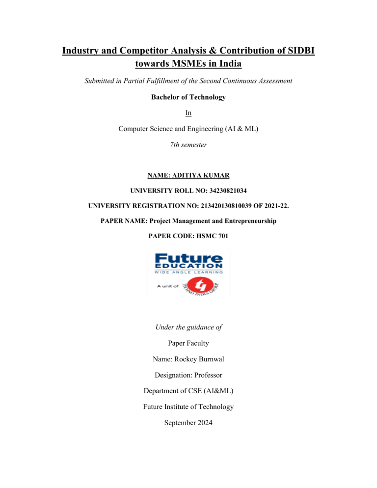 Industry and Competitor Analysis & Contribution of SIDBI towards MSMEs in India Submitted in Partial Fulfillment of the Second Continuous Assessment Bachelor of Technology In Computer Science and Engineering (AI & ML) 7th semester NAME: ADITIYA KUMAR UNIVERSITY ROLL NO: 34230821034 UNIVERSITY REGISTRATION NO: 213420130810039 OF 2021-22. PAPER NAME: Project Management and Entrepreneurship PAPER CODE: HSMC 701 Under the guidance of Paper Faculty Name: Rockey Burnwal Designation: Professor Department of CSE (AI&ML) Future Institute of Technology September 2024 ABSTRACT This report analyzes the MSME (Micro, Small, and Medium Enterprises) sector, highlighting the industry's competitive landscape, market size, and growth potential. We focus on the role of SIDBI (Small Industries Development Bank of India) in supporting and driving the growth of MSMEs. Through data-backed insights, this report explores market trends, challenges, and opportunities, presenting a comprehensive analysis of the industry's outlook. The report utilizes data and graphical representations to illustrate key findings and offers actionable takeaways. INTRODUCTION The MSME sector is the backbone of the Indian economy, contributing significantly to employment, GDP, and exports. It comprises millions of enterprises across manufacturing, services, and trade industries, playing a vital role in inclusive economic growth. Key Points: Definition and categories of MSMEs Importance in employment and GDP contribution Recent trends and challenges Industry and Competitor Analysis Understanding the MSME landscape is crucial for strategic decision-making. This analysis encompasses key industries, their growth trajectories, and competitive dynamics. Factors such as market share, product offerings, pricing strategies, and innovation capabilities of key competitors are examined. I. Industry Trends The MSME sector in India is diverse, spanning manufacturing, services, and trade. It is characterized by rapid growth, driven by government initiatives, rising consumer demand, and technological advancements. Key industries include textiles, food processing, and IT services. II. Competitor Landscape Competitors within the MSME space exhibit varying degrees of market presence and specialization. Leading players often have established brands, strong distribution networks, and significant financial resources. However, emerging players are leveraging technology and innovative business models to disrupt the market. III. Challenges Challenges faced by MSMEs include access to finance, lack of skilled labor, and competition from larger enterprises. Addressing these challenges requires proactive government policies, business development support, and a conducive regulatory environment. Competitor Local MSMEs MNCs Startups Strengths Strong customer relations Global reach, strong branding Tech-driven, adaptable Weaknesses Limited scalability Market Share (%) 40% Innovation Focus 30% Less flexibility 30% High Limited funding 20% Very High Contribution of SIDBI towards MSMEs The Small Industries Development Bank of India (SIDBI) plays a vital role in supporting the growth and development of MSMEs. It provides financial assistance, credit guarantees, and capacity-building programs. SIDBI's initiatives aim to address the unique challenges faced by MSMEs, fostering entrepreneurship and economic empowerment. Financial Assistance : SIDBI offers various loan schemes tailored to the specific needs of MSMEs, including working capital loans, term loans, and equipment finance. These schemes provide access to affordable credit, enabling MSMEs to expand operations, acquire new machinery, and meet operational expenses. Credit Guarantees: SIDBI provides credit guarantees to financial institutions, reducing their risk exposure and making them more willing to lend to MSMEs. These guarantees enhance the creditworthiness of MSMEs, facilitating access to finance. Capacity Building: SIDBI invests in capacity-building programs to equip MSME entrepreneurs with the skills and knowledge necessary to thrive in a competitive environment. These programs cover areas such as financial management, marketing, and technology adoption. Innovation Support: SIDBI supports innovative initiatives and technological advancements within the MSME sector. It provides funding for research and development, enabling MSMEs to develop new products, processes, and technologies, enhancing their competitiveness. Key Initiatives: Credit and Finance Schemes: SIDBI facilitates loans at affordable interest rates. Startup Support: SIDBI Venture Capital Limited (SVCL) promotes startup funding. Digital Platforms: Providing online loan facilitation and digital services to simplify access. Contribution Breakdown: Initiative Credit Schemes Digital Platforms Startup Support MSMEs Benefitted 500,000+ 1,00,000 10,000 startups Funds Disbursed (INR Cr) 10,000 2,000 3,500 Data and Graphical Representation Data visualization plays a crucial role in understanding complex trends and insights. This section utilizes graphs and charts to present key data points related to the MSME sector and the role of SIDBI. These visualizations provide a compelling and insightful overview of the sector's performance and the impact of SIDBI's initiatives. Growth of the MSME Sector This line graph shows the steady growth of the MSME sector over the past five years, highlighting the sector's resilience and potential for continued expansion. Industry Distribution of MSMEs This pie chart presents the distribution of MSMEs across various industries, providing insights into the sector's diversity and the relative prominence of different sectors. SIDBI Lending to MSMEs This bar chart depicts the amount of credit disbursed by SIDBI to MSMEs over the past few years, showcasing the bank's significant contribution to the sector's growth. Conclusion In conclusion, the MSME sector is a key driver of economic growth in India, contributing significantly to empl