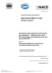 Item No. 21307 International Standard ANSI/NACE MR0175/ISO 15156-1:2015 Petroleum, petrochemical, and natural gas industries — Materials for use in H2S-containing environments in oil and gas production — Part 1: General principles for selection of cracking-resistant materials An American National Standard Approved November 23, 2015 Reference number ANSI/NACE MR0175/ISO 15156:2015 © ANSI/NACE/ISO 2015 --``,,,`,`,,````,`,``,`,`````,,,-`-`,,`,,`,`,,`--- Copyright NACE International Provided by IHS under license with NACE No reproduction or networking permitted without license from IHS Licensee=Suncor Energy Inc - Sites 1, 3, & 7/9992021001, User=Abdolmaleki, Alire Not for Resale, 01/08/2016 13:15:15 MST COPYRIGHT PROTECTED DOCUMENT These materials are subject to copyright claims of ISO and NACE. No part of this publication may be reproduced in any form, including an electronic retrieval system, without the prior written permission of NACE. All requests pertaining to the ANSI/NACE MR0175/ISO 15156 standard should be submitted to NACE. All rights reserved. International Organization for Standardization (ISO) ISO Central Secretariat BIBC II Chemin de Blandonnet 8 CP 401 1214 Vernier, Geneva Switzerland Tel. + 41 22 749 01 11 Fax + 41 22 749 09 47 Web: www.iso.ch NACE International 15835 Park Ten Place Houston, TX 77084-5145 Tel. +1 281-228-6223 Fax +1 281-228-6300 Web: www.nace.org Printed in the U.S.A. by NACE International ii Copyright NACE International Provided by IHS under license with NACE No reproduction or networking permitted without license from IHS --``,,,`,`,,````,`,``,`,`````,,,-`-`,,`,,`,`,,`--- © NACE/ISO 2015 – All rights reserved Licensee=Suncor Energy Inc - Sites 1, 3, & 7/9992021001, User=Abdolmaleki, Alire Not for Resale, 01/08/2016 13:15:15 MST ANSI/NACE MR0175/ISO 15156 Contents Page Foreword......................................................................................................................................................................... iv Introduction ..................................................................................................................................................................... v 1 Scope ....................................................................................................................................................................1 2 Normative references ....................................................................................................................................2 3 Terms and definitions ....................................................................................................................................3 4 Abbreviated terms ..........................................................................................................................................6 5 General principles ...........................................................................................................................................6 6 Evaluation and definition of service conditions to enable material selection ..........................7 7 Selection of materials resistant to SSC/SCC in the presence of sulfides from existing lists and tables ..................................................................................................................................................7 8 8.1 8.2 8.3 8.3.1 8.3.2 8.3.3 8.3.4 8.3.5 Qualification of materials for H2S service ...............................................................................................8 Material description and documentation ...............................................................................................8 Qualification based upon field experience .............................................................................................8 Qualification based upon laboratory testing .........................................................................................8 General ................................................................................................................................................................8 Sampling of materials for laboratory testing ........................................................................................9 Selection of laboratory test methods........................................................................................................9 Conditions to be applied during testing ..................................................................................................9 Acceptance criteria .........................................................................................................................................9 9 Report of the method of selection or qualification..............................................................................9 Bibliography ................................................................................................................................................................. 11 © NACE/ISO 2015 Copyright NACE International Provided by IHS under license with NACE No reproduction or networking permitted without license from IHS --``,,,`,`,,````,`,``,`,`````,,,-`-`,,`,,`,`,,`--- Licensee=Suncor Energy Inc - Sites 1, 3, & 7/9992021001, User=Abdolmaleki, Alire Not for Resale, 01/08/2016 13:15:15 MST iii ANSI/NACE MR0175/ISO 15156 Foreword ISO (the International Organization for Standardization) is a worldwide federation of national standards bodies (ISO member bodies). The work of preparing International Standards is normally carried out through ISO technical committees. Each member body interested in a subject for which a technical committee has been established has the right to be represented on that committee. International organizations, governmental and non-governmental, in liaison with ISO, also take part in the work. ISO collaborates closely with the International Electrotechnical Commission (IEC) on all matters of electrotechnical stand