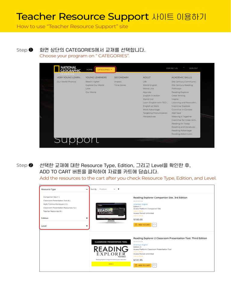 Teacher Resource Support 사이트 이용하기 How to use “Teacher Resource Support” site Step 1 화면 상단의 CATEGORIES에서 교재를 선택합니다. Choose your program on “ CATEGORIES”. Step 2 선택한 교재에 대한 Resource Type, Edition, 그리고 Level을 확인한 후, ADD TO CART 버튼을 클릭하여 자료를 카트에 담습니다. Add the resources to the cart after you check Resource Type, Edition, and Level. Step 3 화면 우측 상단의 CART를 클릭하여, 장바구니로 이동합니다. Click “CART” on the right of the top. Step 4 카트에 담은 자료 리스트를 최종 확인합니다. Confirm your list in the cart. Step 5 PROCEED TO CHECKOUT을 클릭합니다. Click “PROCEED TO CHECKOUT” 5 -a 모든 자료는 자동으로 할인쿠폰이 적용되어 무료로 제공되며, 청구되는 금액은 없습니다. There is NO charge as the system applied the coupon to your cart already. 5 -b 모든 자료의 최대 수량은 “1” 로, 수정이 불가합니다. The maximum quantity is “1” ( It cannot be modified) Step 6 Step 7 강사 정보를 입력한 후, SUBMIT REQUEST를 클릭합니다. 교 Fill out the form without any blank and click “SUBMIT REQUEST”. 6 -a 개인 공부방, 과외의 경우 School 및 Department란에 “Private”로 기재합니다. For a personal tutor, please indicate the school information as a “Private”. 6 -b 표시가 있는 항목들은 자료 안내에 필요한 필수 정보입니다. * The columns with * are required information for supporting resources. 신청이 정상적으로 완료되면, 아래와 같이 확인 문구가 나타납니다. Once the request is submitted completely, you will receive an Order Confirmation as below. 7 -a 신청한 내용은 담당부서(싱가폴)에서 확인 및 승인 후에, 신청 시 기재한 이메 일로 자료를 발송합니다. Your request will be handled by a technical representatives of Singapore office. After it is verified, the resources will be delivered to your email. 7 -b 리 기간은 근무일 기준 신청일로부터 3일 이내입니다. 처 It will be processed within 3 days from the date of application. Step 8 접수 완료 이메일이 하단과 같이 발송됩니다. Request Confirmation will be delivered to your email. Step 9 신청 내역과 처리 상황은 MY ORDERS에서 조회가 가능합니다. You can track a progress from “MY ORDER”. Step 10 사이트 활용에 대한 기타 문의는 메인 홈(URL: https://www.asianglshop.com/ krt/contact)을 통해 가능합니다. You can contact us to inquire how to use this website through above URL.