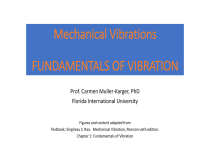 Mechanical Vibrations FUNDAMENTALS OF VIBRATION Prof. Carmen Muller-Karger, PhD Florida International University Figures and content adapted from Textbook: Singiresu S. Rao. Mechanical Vibration, Pearson sixth edition. Chapter 1: Fundamentals of Vibration Mechanical Vibrations Figures and content adapted from Textbook: Singiresu S. Rao. Mechanical Vibration, Pearson sixth edition Prof. Carmen Muller-Karger, PhD Learning Objectives • Recognize the importance of studying Vibration • Describe a brief the history of vibration • Understand the definition of Vibration • State the process of modeling systems • Determine the Degrees of Freedom (DOF) of a system • Identify the different types of Mechanical Vibrations • Compute equivalent values for Spring elements, Mass elements and Damping elements • Characterize harmonic motion and the different possible representation • Add and subtract harmonic motions • Conduct Fourier series expansion of given periodic functions Mechanical Vibrations Figures and content adapted from Textbook: Singiresu S. Rao. Mechanical Vibration, Pearson sixth edition Prof. Carmen Muller-Karger, PhD Importance of studying Vibration • All systems that have mass and any type of flexible components are vibrating system. • Examples are many: • We hear because our eardrums vibrate • Human speech requires the oscillatory motion of larynges • In machines, vibration can loosen fasteners such as nuts. • In balance in machine can cause problem to the machine itself or surrounding machines or environment. • Periodic forces bring dynamic responses that can cause fatigue in materials • The phenomenon known as Resonance leads to excessive deflections and failure. • The vibration and noise generated by engines causes annoyance to people and, sometimes, damage to property. Mechanical Vibrations Figures and content adapted from Textbook: Singiresu S. Rao. Mechanical Vibration, Pearson sixth edition Prof. Carmen Muller-Karger, PhD Importance of studying Vibration Mechanical Vibrations Figures and content adapted from Textbook: Singiresu S. Rao. Mechanical Vibration, Pearson sixth edition Prof. Carmen Muller-Karger, PhD Brief history • People became interested in vibration when they created the first musical instruments ( as long as 4000 B.C.). • Pythagoras ( 582 – 507 B.C) is considered the fisrt person to investigate musical sounds. • Galileo Galilei (1564-1642) is considered to be the founder of modern experimental science, he conduct experiments on the simple pendulum, describing the dependence of the frequency of vibration and the length. • Robert Hooke (1635–1703) also conducted experiments to find a relation between the pitch and frequency of vibration of a string. • Joseph Sauveur (1653–1716) coined the word “acoustics” for the science of sound. • Sir Isaac Newton (1642–1727) his law of motion is routinely used to derive the equations of motion of a vibrating body. • Brook Taylor (1685–1731), obtained the natural frequency of vibration observed by Galilei and Mersenne. • Daniel Bernoulli (1700–1782), Jean D’Alembert (1717–1783), and Leonard Euler (1707–1783)., introduced partial derivatives in the equations of motion. • J. B. J. Fourier (1768–1830) contributed on the development of the theory of vibrations and led to the possibility of expressing any arbitrary function using the principle of superposition. • Joseph Lagrange (1736–1813) presented the analytical solution of the vibrating string. • Charles Coulomb did both theoretical and experimental studies in 1784 on the torsional oscillations of a metal cylinder suspended by a wire. He also contributed in the modeling of dry friction. • E. F. F. Chladni (1756–1824) developed the method of placing sand on a vibrating plate to find its mode shapes. • Simeon Poisson (1781–1840) study vibration of a rectangular flexible membrane. • Lord Baron Rayleigh (1842 – 1919) Among the many contributions, he develop the method of finding the fundamental frequency of vibration of a conservative system by making use of the principle of conservation of energy. Mechanical Vibrations Figures and content adapted from Textbook: Singiresu S. Rao. Mechanical Vibration, Pearson sixth edition Prof. Carmen Muller-Karger, PhD Definition of Vibration • Any motion that repeats itself after an interval of time. • A vibratory system, in general, includes a means for storing potential energy (spring or elasticity), a means for storing kinetic energy (mass or inertia), and a means by which energy is gradually lost (damper). F(t) Excitations (input): Initial conditions of external force T Mechanical Vibrations U r(t) Responses (output) D Energy dissipation Figures and content adapted from Textbook: Singiresu S. Rao. Mechanical Vibration, Pearson sixth edition Prof. Carmen Muller-Karger, PhD Modeling systems • All mechanical and structural systems can be modeled as mass-springdamper systems Real system Mechanical Model Mathematical Model ๐๐ฅแท + ๐ ๐ฅแถ + ๐๐ฅ = 0 Solution Analysis Mechanical Vibrations ๐๐ฅแท + ๐ ๐ฅแถ + ๐๐ฅ = 0 Respuesta análisis del sistema para que la respuesta sea coherente. Figures and content adapted from Textbook: Singiresu S. Rao. Mechanical Vibration, Pearson sixth edition Respuesta análisis del sistema para que la respuesta sea coherente. Prof. Carmen Muller-Karger, PhD Degrees of freedom The minimum number of independent coordinates required to determine completely the positions of all parts of a system at any instant of time Single DoF systems: Two DOF System Three DoF systems: Mechanical Vibrations Figures and content adapted from Textbook: Singiresu S. Rao. Mechanical Vibration, Pearson sixth edition Prof. Carmen Muller-Karger, PhD Classification of Vibration • Free Vibration: When a system, after an initial disturbance, is left to vibrate on its own. No external force acts on the s