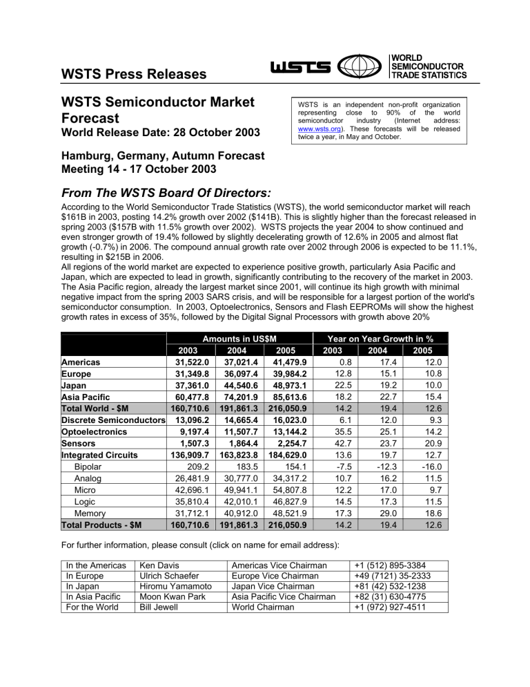 WSTS Press Releases WSTS Semiconductor Market Forecast World Release Date: 28 October 2003 WSTS is an independent non-profit organization representing close to 90% of the world semiconductor industry (Internet address: www.wsts.org). These forecasts will be released twice a year, in May and October. Hamburg, Germany, Autumn Forecast Meeting 14 - 17 October 2003 From The WSTS Board Of Directors: According to the World Semiconductor Trade Statistics (WSTS), the world semiconductor market will reach $161B in 2003, posting 14.2% growth over 2002 ($141B). This is slightly higher than the forecast released in spring 2003 ($157B with 11.5% growth over 2002). WSTS projects the year 2004 to show continued and even stronger growth of 19.4% followed by slightly decelerating growth of 12.6% in 2005 and almost flat growth (-0.7%) in 2006. The compound annual growth rate over 2002 through 2006 is expected to be 11.1%, resulting in $215B in 2006. All regions of the world market are expected to experience positive growth, particularly Asia Pacific and Japan, which are expected to lead in growth, significantly contributing to the recovery of the market in 2003. The Asia Pacific region, already the largest market since 2001, will continue its high growth with minimal negative impact from the spring 2003 SARS crisis, and will be responsible for a largest portion of the world's semiconductor consumption. In 2003, Optoelectronics, Sensors and Flash EEPROMs will show the highest growth rates in excess of 35%, followed by the Digital Signal Processors with growth above 20% Amounts in US$M 2003 2004 2005 Americas 31,522.0 37,021.4 41,479.9 Europe 31,349.8 36,097.4 39,984.2 Japan 37,361.0 44,540.6 48,973.1 Asia Pacific 60,477.8 74,201.9 85,613.6 Total World - $M 160,710.6 191,861.3 216,050.9 Discrete Semiconductors 13,096.2 14,665.4 16,023.0 Optoelectronics 9,197.4 11,507.7 13,144.2 Sensors 1,507.3 1,864.4 2,254.7 Integrated Circuits 136,909.7 163,823.8 184,629.0 Bipolar 209.2 183.5 154.1 Analog 26,481.9 30,777.0 34,317.2 Micro 42,696.1 49,941.1 54,807.8 Logic 35,810.4 42,010.1 46,827.9 Memory 31,712.1 40,912.0 48,521.9 Total Products - $M 160,710.6 191,861.3 216,050.9 Year on Year Growth in % 2003 2004 2005 0.8 17.4 12.0 12.8 15.1 10.8 22.5 19.2 10.0 18.2 22.7 15.4 14.2 19.4 12.6 6.1 12.0 9.3 35.5 25.1 14.2 42.7 23.7 20.9 13.6 19.7 12.7 -7.5 -12.3 -16.0 10.7 16.2 11.5 12.2 17.0 9.7 14.5 17.3 11.5 17.3 29.0 18.6 14.2 19.4 12.6 For further information, please consult (click on name for email address): In the Americas In Europe In Japan In Asia Pacific For the World Ken Davis Ulrich Schaefer Hiromu Yamamoto Moon Kwan Park Bill Jewell Americas Vice Chairman Europe Vice Chairman Japan Vice Chairman Asia Pacific Vice Chairman World Chairman +1 (512) 895-3384 +49 (7121) 35-2333 +81 (42) 532-1238 +82 (31) 630-4775 +1 (972) 927-4511