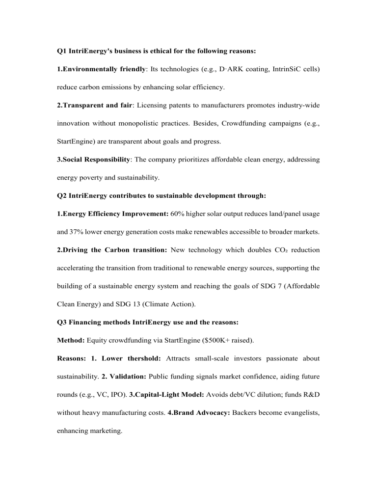 Q1 IntriEnergy's business is ethical for the following reasons: 1.Environmentally friendly: Its technologies (e.g., D·ARK coating, IntrinSiC cells) reduce carbon emissions by enhancing solar efficiency. 2.Transparent and fair: Licensing patents to manufacturers promotes industry-wide innovation without monopolistic practices. Besides, Crowdfunding campaigns (e.g., StartEngine) are transparent about goals and progress. 3.Social Responsibility: The company prioritizes affordable clean energy, addressing energy poverty and sustainability. Q2 IntriEnergy contributes to sustainable development through: 1.Energy Efficiency Improvement: 60% higher solar output reduces land/panel usage and 37% lower energy generation costs make renewables accessible to broader markets. 2.Driving the Carbon transition: New technology which doubles CO₂ reduction accelerating the transition from traditional to renewable energy sources, supporting the building of a sustainable energy system and reaching the goals of SDG 7 (Affordable Clean Energy) and SDG 13 (Climate Action). Q3 Financing methods IntriEnergy use and the reasons: Method: Equity crowdfunding via StartEngine ($500K+ raised). Reasons: 1. Lower thershold: Attracts small-scale investors passionate about sustainability. 2. Validation: Public funding signals market confidence, aiding future rounds (e.g., VC, IPO). 3.Capital-Light Model: Avoids debt/VC dilution; funds R&D without heavy manufacturing costs. 4.Brand Advocacy: Backers become evangelists, enhancing marketing. Q4. Why IntriEnergy successful in attracting investors: With its breakthrough, patented technology—including a 60% solar efficiency boost (already lab-validated)—the company stands at the forefront of innovation. What’s more, it’s perfectly timed to capitalize on the booming $180B solar market, fueled by global net-zero commitments. Crucially, IntriEnergy is not just a startup—it’s backed by a seasoned team with 30+ years in energy and semiconductors, including Franco Gaspari’s deep PV expertise. Unlike risky, capital-heavy competitors (like Solyndra, which collapsed under the weight of factory costs), IntriEnergy’s asset-light licensing model minimizes risk while maximizing scalability. Ultimately, the real appeal lies in its potential to dominate the high-margin "solar efficiency" niche— turning cutting-edge IP into long-term investor value. 5. Possible risks for IntriEnergy: IntriEnergy faces difficulties in technologies like breakthrough of perovskites and chanllenges that organic PV could disrupt its tech advantage. Additionally, shifting policies—like U.S. solar tax credit cuts—could lower the demand, while supply chain risks like rare material costs (e.g., indium) may squeeze margins. Most critically, expanding lab successes into mass production frequently reveals unexpected problems, ranging from yield issues to performance disparities. Unlike Solyndra, IntriEnergy is proactively defending its position: diversifying revenue via partnerships (e.g., First Solar), securing non-dilutive grants (DOE, EU green funds), and closely tracking rivals like Oxford PV’s perovskite advances. By staying asset light, the company avoids Solyndra’s trap.