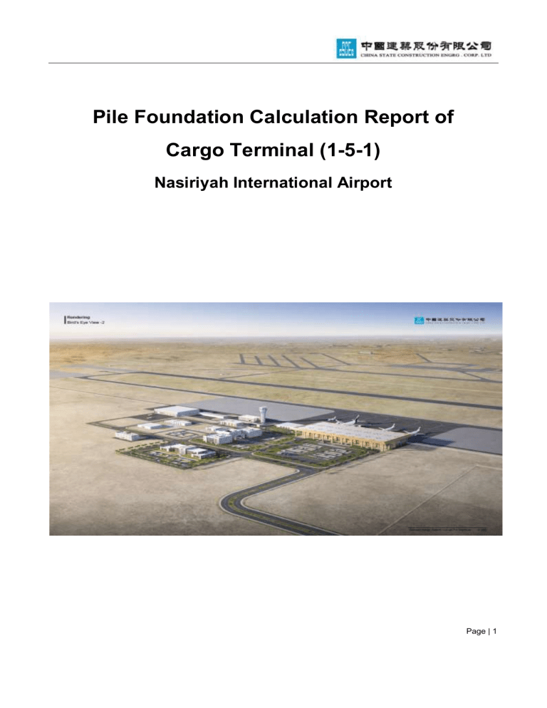 Pile Foundation Calculation Report of Cargo Terminal (1-5-1) Nasiriyah International Airport Page | 1 Table of Contents 1.0 Project Overview _____________________________________________________________ 3 2.0 Code and Standard ___________________________________________________________ 4 3.0 Design of Single Pile Compressive Bearing Capacity _______________________________ 4 3.1 Calculation Method ____________________________________________________________________ 4 3.2 Onsite Pile Load Test _________________________________________________________________ 10 4.0 Design of Single Pile _________________________________________________________ 11 5.0 Design of Pile Group Capacity _________________________________________________ 13 6.0 Calculation of Modeling _______________________________________________________ 14 6.1 Bearing Stratum ______________________________________________________________________ 17 6.2 Column Base Reaction Forces _________________________________________________________ 18 6.3 Working Loads _______________________________________________________________________ 19 6.4 Punching Shear DC Ratios ____________________________________________________________ 34 6.5 Reinforcement Result _________________________________________________________________ 37 7.0 Design of Lateral Bearing Capacity _____________________________________________ 38 Page | 2 7.1 Single Pile ___________________________________________________________________________ 38 7.2 Group Effect _________________________________________________________________________ 42 1.0 Project Overview Page | 3 Based on the Geotechnical Investigation Report, the foundation type of the project structure is the piling foundation under the column. The layer ④ Silty Sand is chosen as bearing stratum for piles. 2.0 Code and Standard Geotechnical Investigation Report of Airside and Landside for Nasiriyah International Airport Project (Both Preliminary and Details Reports)- 02/10/2022. Design And Construction Of Driven Pile Foundations(FHWA NHI-05-042) Guide To Design, Manufacture, and Installation Of Concrete Piles(ACI 543R-2012) Standard Test Methods For Deep Foundations Under Static Axial Compressive Load(ASTM D1143/D1143M-07) Minimum Design Loads for Building and Other Structures (ASCE/SEI7-16) 3.0 Design of Single Pile Compressive Bearing Capacity 3.1 Calculation Method The ultimate bearing capacity of piles was calculated according to Section 9.3 of the American Standard FHWA-NHI-05-042-Volume I "Design and Construction of Driven Pile Foundations"(as shown in the following figure) Page | 4 According to Section 9.6 of the American standard FHWA-NHI-05-042-Volume I "Design and Construction of Driven Pile Foundations" (as shown below), the safety factor is 2. According to section 12.2 of The Nasiriyah International Airport Project-NIAP Geotechnical Investigation Report For Landside Area [Detailed]-2022.7.14, Layer ⑤ silty sand and Layer ④ are Page | 5 recommended as pile end bearing stratum, and the side resistance and tip resistance of different soil layers can be known. Referring to the pile penetration depth of the test pile test, the minimum value of the penetration depth of 16.65m (excluding the length of the pile tip) is selected as the reference for the design pile length, so the design pile length is selected as 16.5m. Page | 6 Exploration Boreholes Layout for Cargo Terminal from Geotechnical Report According to the geological survey report, the soil layer of the main terminal building is relatively uniform, so the following six relatively unfavorable points are selected to calculate the design bearing capacity of the single pile (as shown in the figure below). The average single pile design bearing capacity (1065KN) of the above six points is selected as the final single pile design bearing capacity. Page | 7 Single pile design bearing capacity of survey point BH271 (16.5m excluding pile tip length) Single pile design bearing capacity of survey point BH273 (16.5m excluding pile tip length) Page | 8 Single pile design bearing capacity of survey point BH277 (16.5m excluding pile tip length) Single pile design bearing capacity of survey point BH280 (16.5m excluding pile tip length) Page | 9 Single pile design bearing capacity of survey point BH281 (16.5m excluding pile tip length) Single pile design bearing capacity of survey point BH282 (16.5m excluding pile tip length) 3.2 Onsite Pile Load Test Page | 10 The static axial pile compressive load test had carried out by Compass Company for precast concrete piles with dimensions 40x40cm and totally 5 piles. The conclusion as shown below from the test report. Based on the two methods which are calculation and load test onsite, the design bearing capacity is 1036kN. The penetration of pile length used in the calculation is 16.5m and the average penetration of pile length is 16.32m for 5 piles in the load test onsite. However, based on the fact that the pile head need to be connected with the upper concrete cap. Therefore, the reference pile length is 18.6m which can meet the design bearing capacity requirement. (A complete pile length is 12m and half is 6m, plus 0.6m pile tip, totally 18.6m) 4.0 Design of Single Pile Page | 11 The design requirement for precast pile from IBC 2018 as shown below: The design of single precast pile is the 400x400mm square section. For Cargo Terminal, the seismic design category is C. Therefore, the minimum longitudinal reinforcement ratio shall be 0.01. 8d20 which is greater than the minimum longitudinal reinforcement ratio as longitudinal reinforcement in the design of single pile. The compressive strength of concrete cube is 40Mpa for single pile and the design compressive strength of single pile is 3056kN and comply. Page | 12 5.0 Design of Pile Group Capacity For the Cargo Terminal, all the piles for the structure are installed in groups due to the foundation loads. According to the American Standard of FHWA-NHI-05-042-Volume I