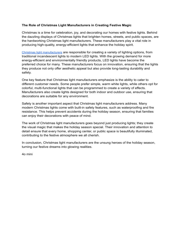 The Role of Christmas Light Manufacturers in Creating Festive Magic Christmas is a time for celebration, joy, and decorating our homes with festive lights. Behind the dazzling displays of Christmas lights that brighten homes, streets, and public spaces, are the hardworking Christmas light manufacturers. These manufacturers play a vital role in producing high-quality, energy-efficient lights that enhance the holiday spirit. Christmas light manufacturers are responsible for creating a variety of lighting options, from traditional incandescent lights to modern LED lights. With the growing demand for more energy-efficient and environmentally friendly products, LED lights have become the preferred choice for many. These manufacturers focus on innovation, ensuring that the lights they produce not only offer aesthetic appeal but also provide long-lasting durability and safety. One key feature that Christmas light manufacturers emphasize is the ability to cater to different customer needs. Some people prefer simple, warm white lights, while others opt for colorful, multi-functional lights that can be programmed to create a variety of effects. Manufacturers also create lights designed for both indoor and outdoor use, ensuring that decorations are suitable for any environment. Safety is another important aspect that Christmas light manufacturers address. Many modern Christmas lights come with built-in safety features, such as waterproofing and fire resistance. This helps prevent accidents during the holiday season, ensuring that families can enjoy their decorations with peace of mind. The work of Christmas light manufacturers goes beyond just producing lights; they create the visual magic that makes the holiday season special. Their innovation and attention to detail ensure that every home, shopping center, or public space is beautifully illuminated, contributing to the festive atmosphere we all cherish. In conclusion, Christmas light manufacturers are the unsung heroes of the holiday season, turning our festive dreams into glowing realities. 4o mini